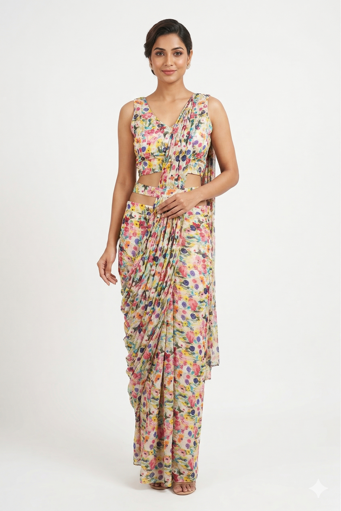 Product Details Experience the elegance of contemporary fusion fashion with our multicolor floral printed draped...