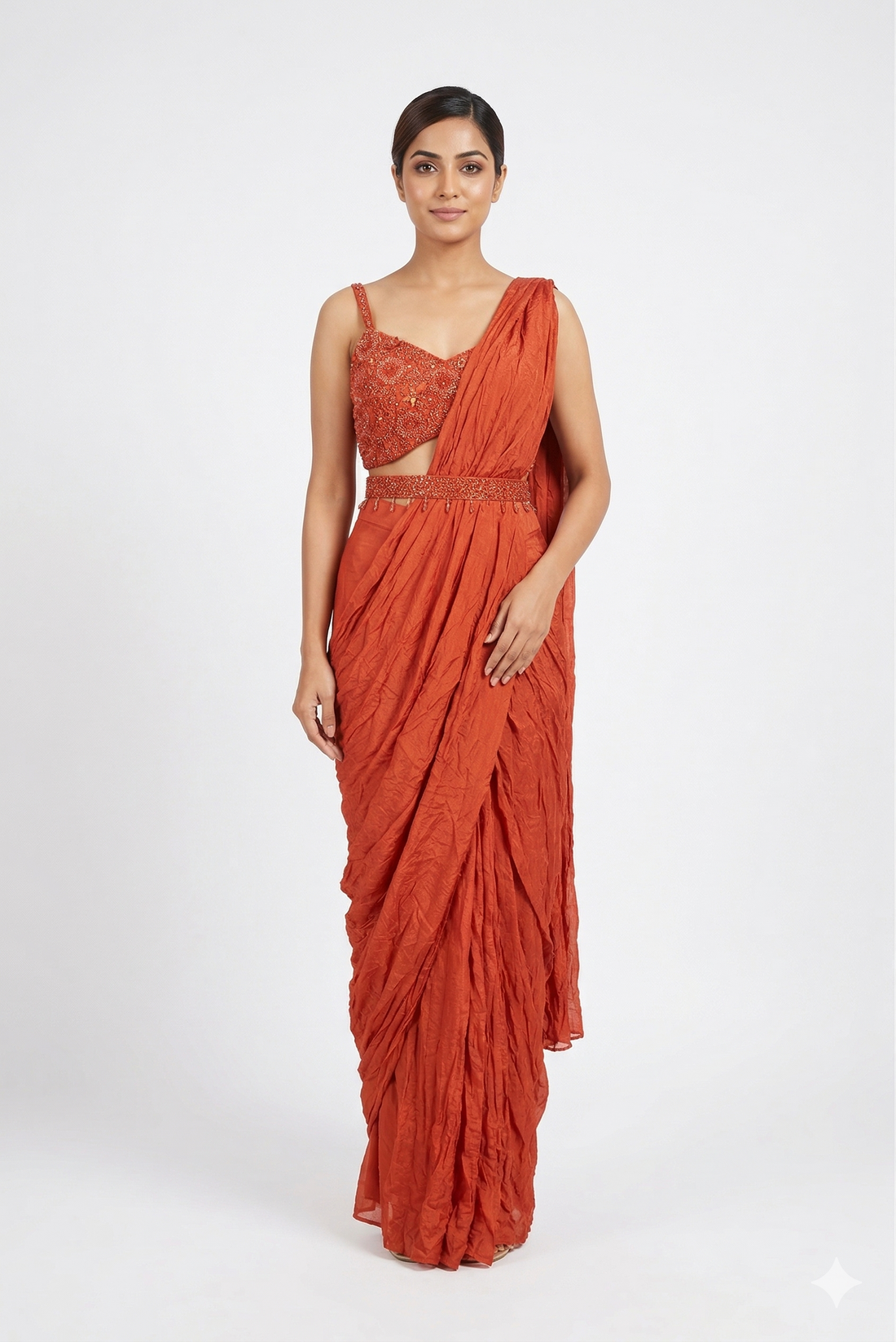 Product Title Royal Purple Pre-Draped Saree with Embellished Blouse & Belt Caption Drape the drama...