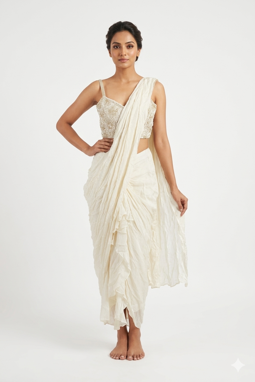 Ivory White Draped Saree Set With Embroidered Blouse