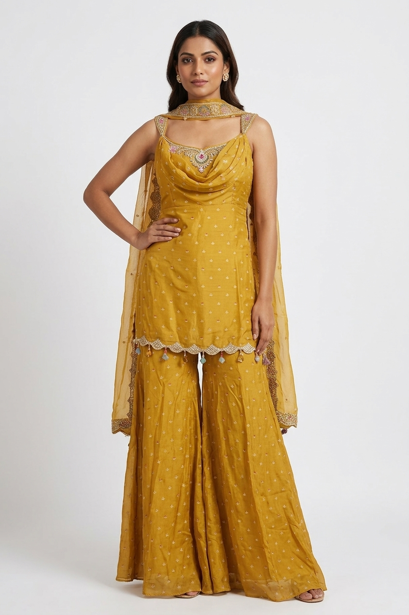 GOLD Drape Neck Sharara Set with Embroidered Dupatta Sunshine elegance with a festive twist 💛✨...