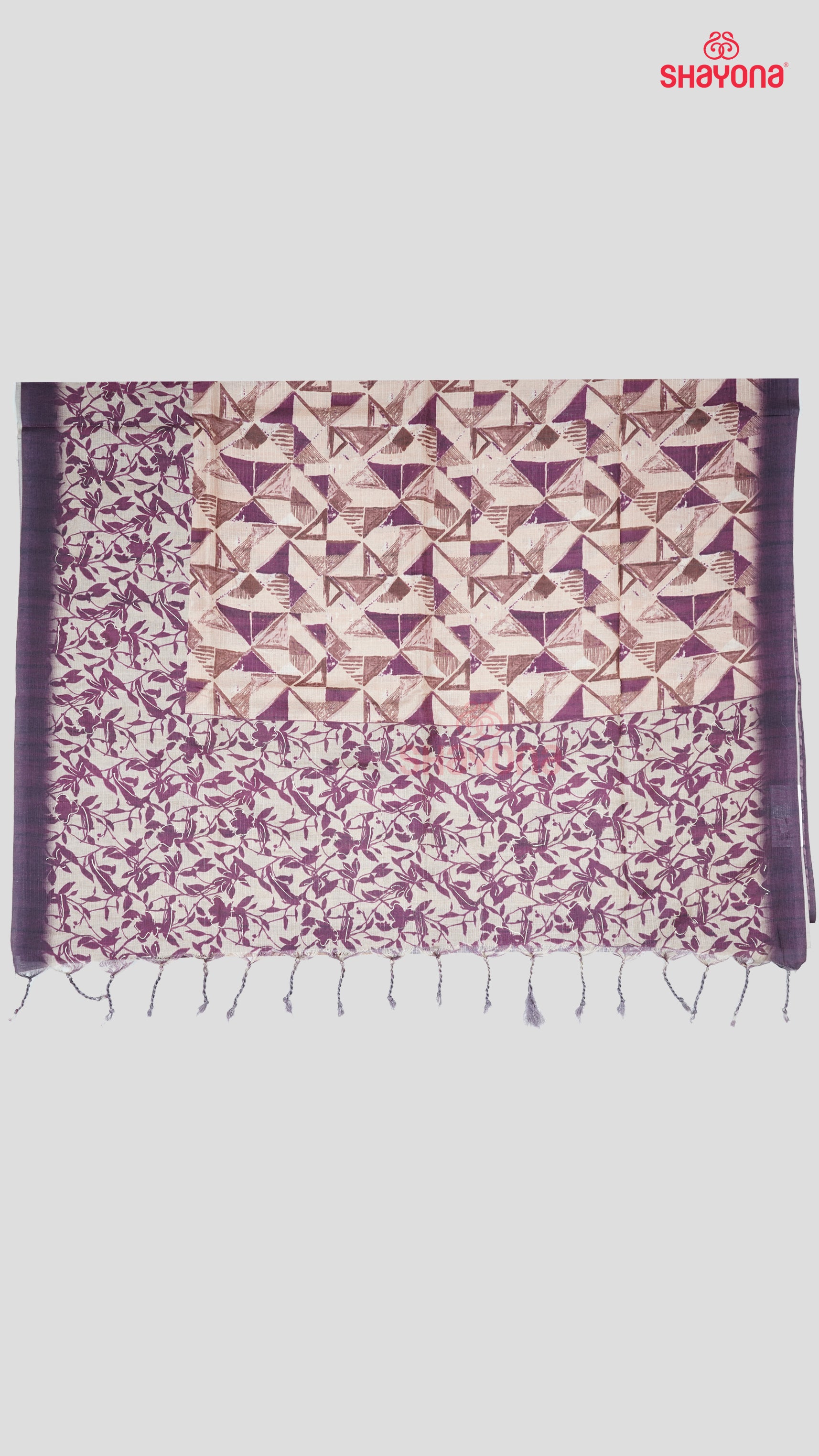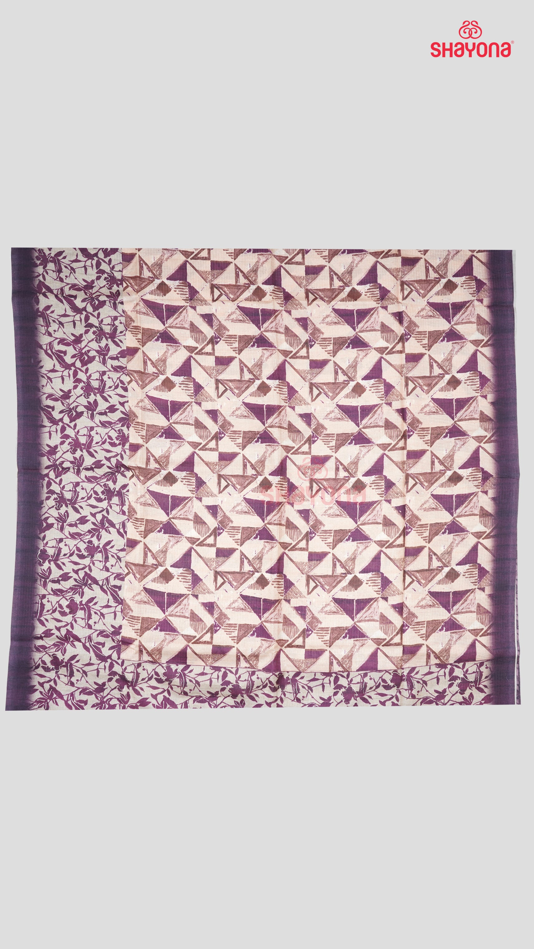 Discover the charm of this Dark Purple Tussa Cotton Saree with dark purple floral jaal, light bisque gala with triangle prints, and light gold pallav & border. Perfect for weddings, festivities, and celebrations.