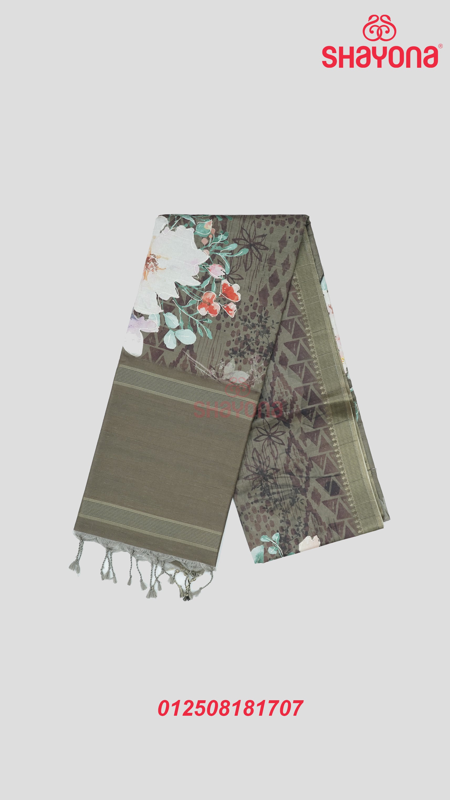 Bring elegance and charm to your ethnic wardrobe with this dark sage green tussa-based cotton saree, featuring digital multi-coloured floral butti all over, complemented by a dark sage green pallav and border. Comes with a 0.80m matching blouse, perfect for festive events, casual gatherings, and cultural celebrations.