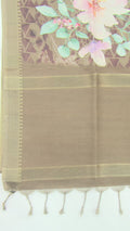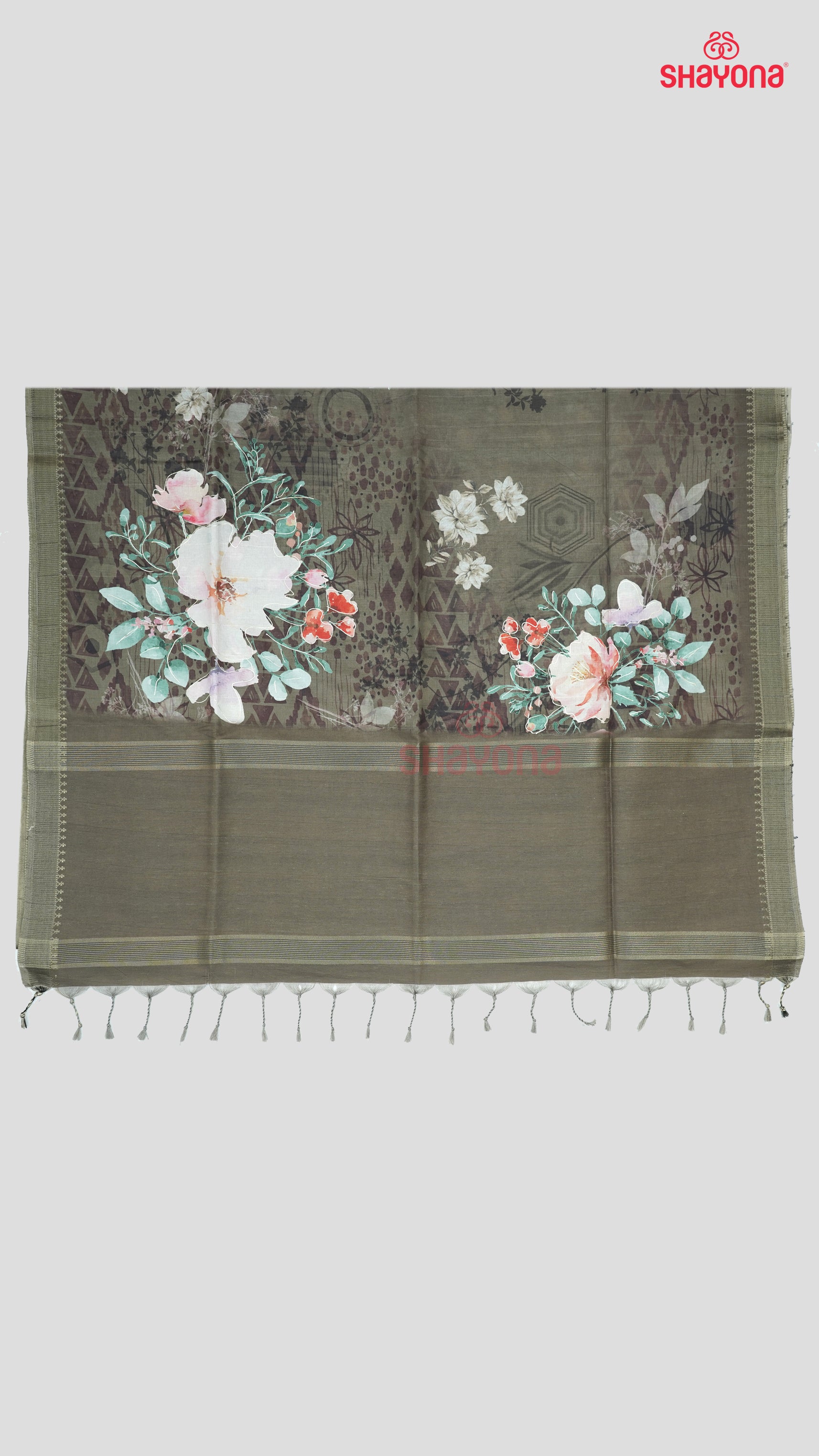 Step into timeless sophistication with this dark sage green tussa cotton saree, crafted to blend traditional artistry with modern digital prints. Key highlights include: