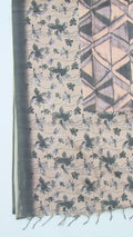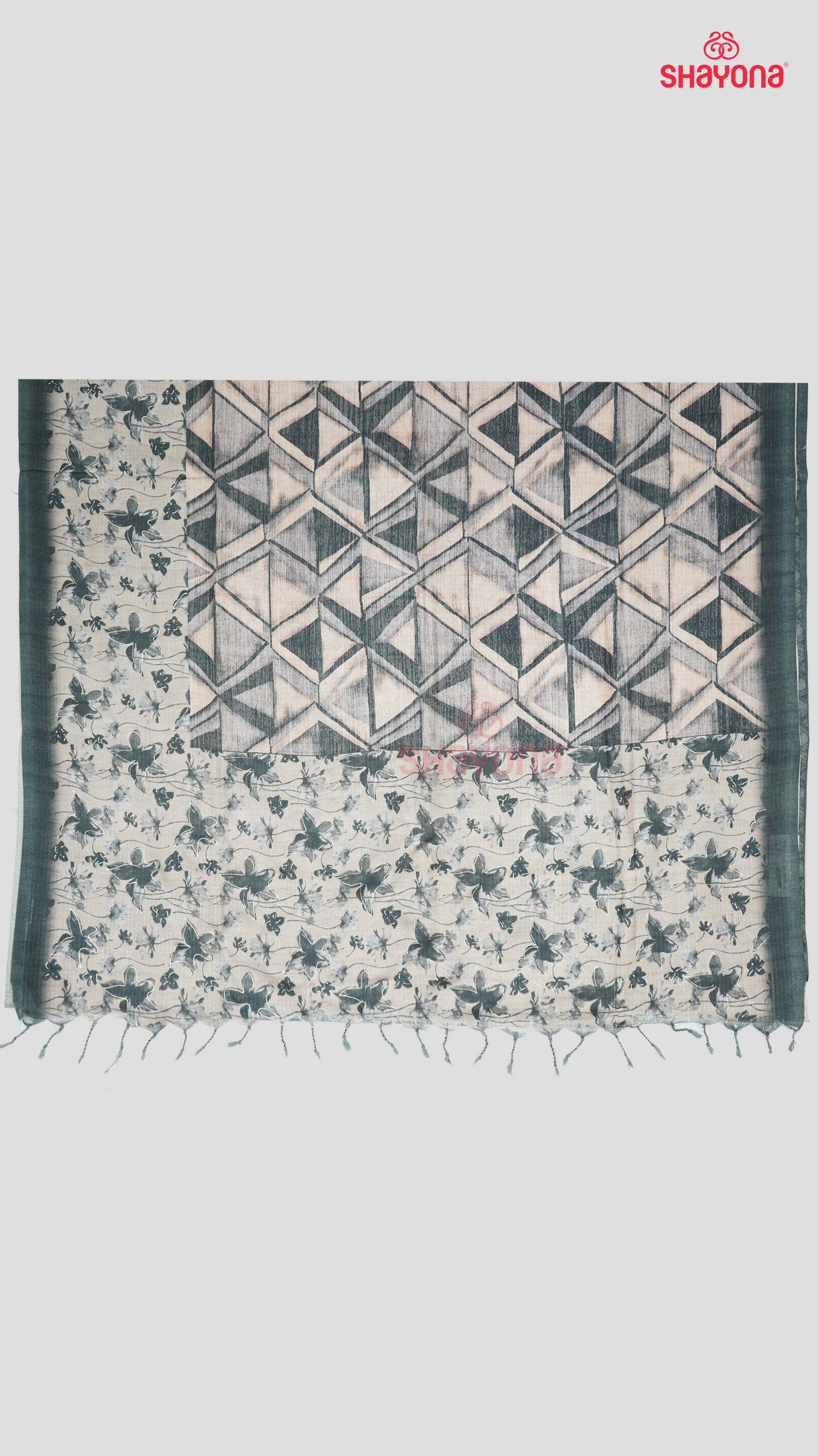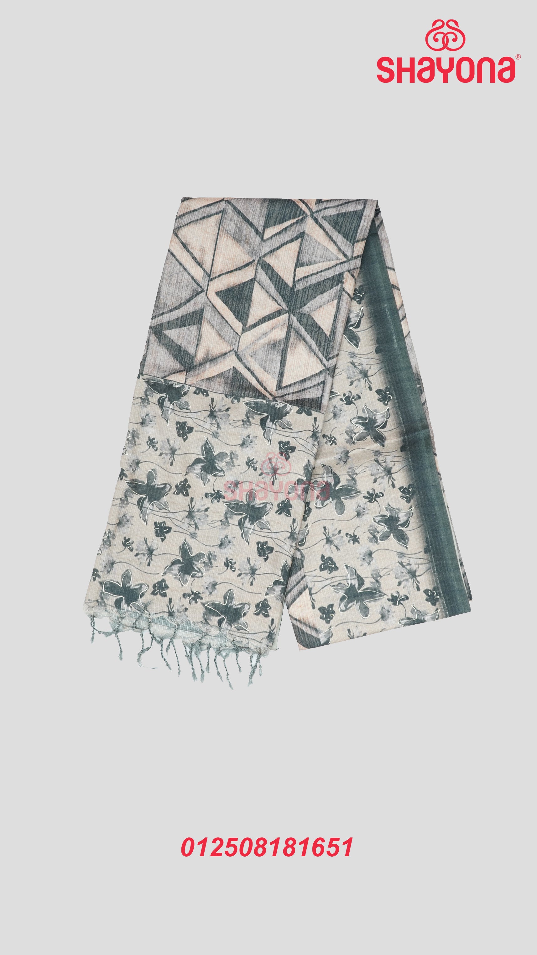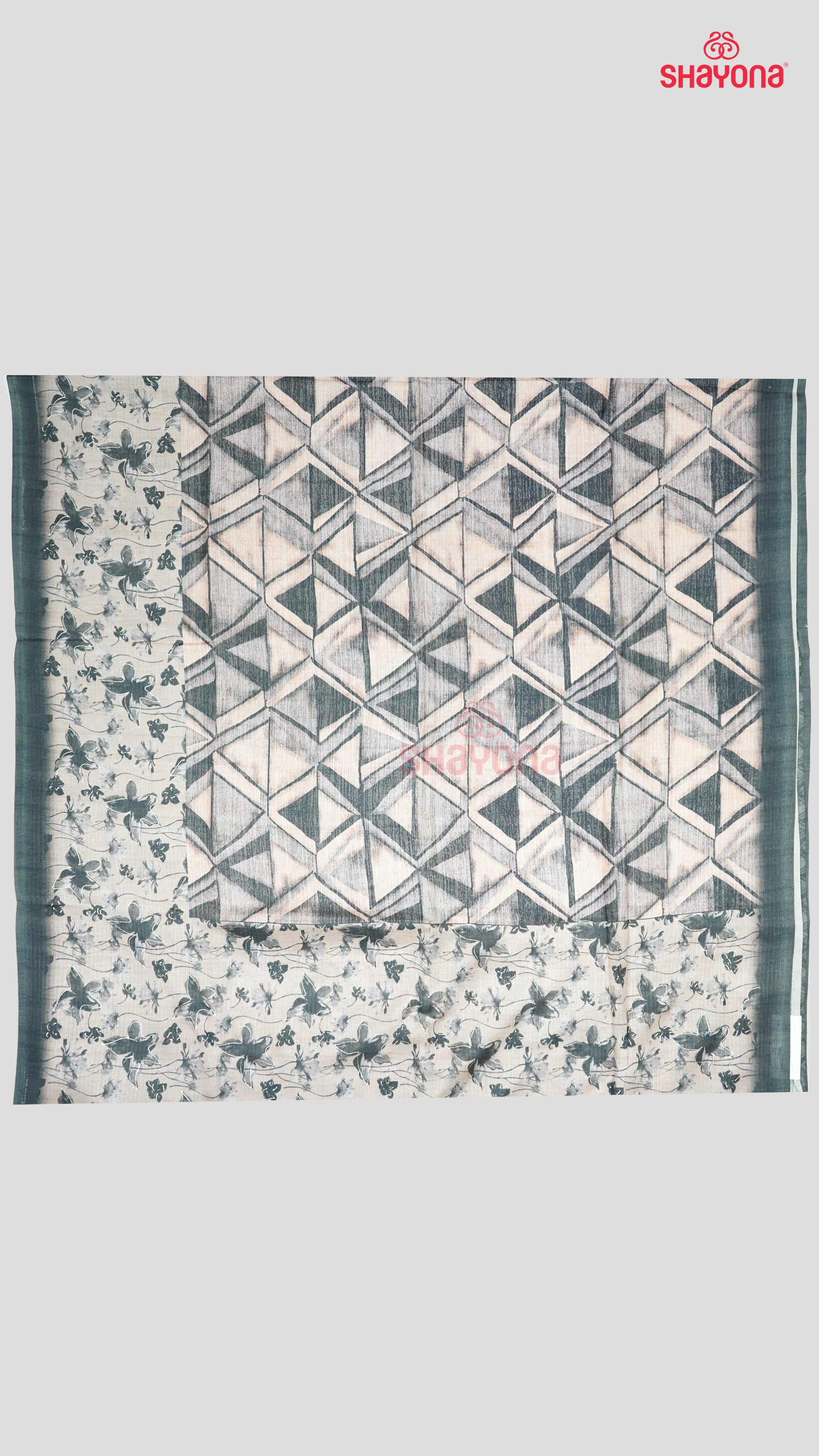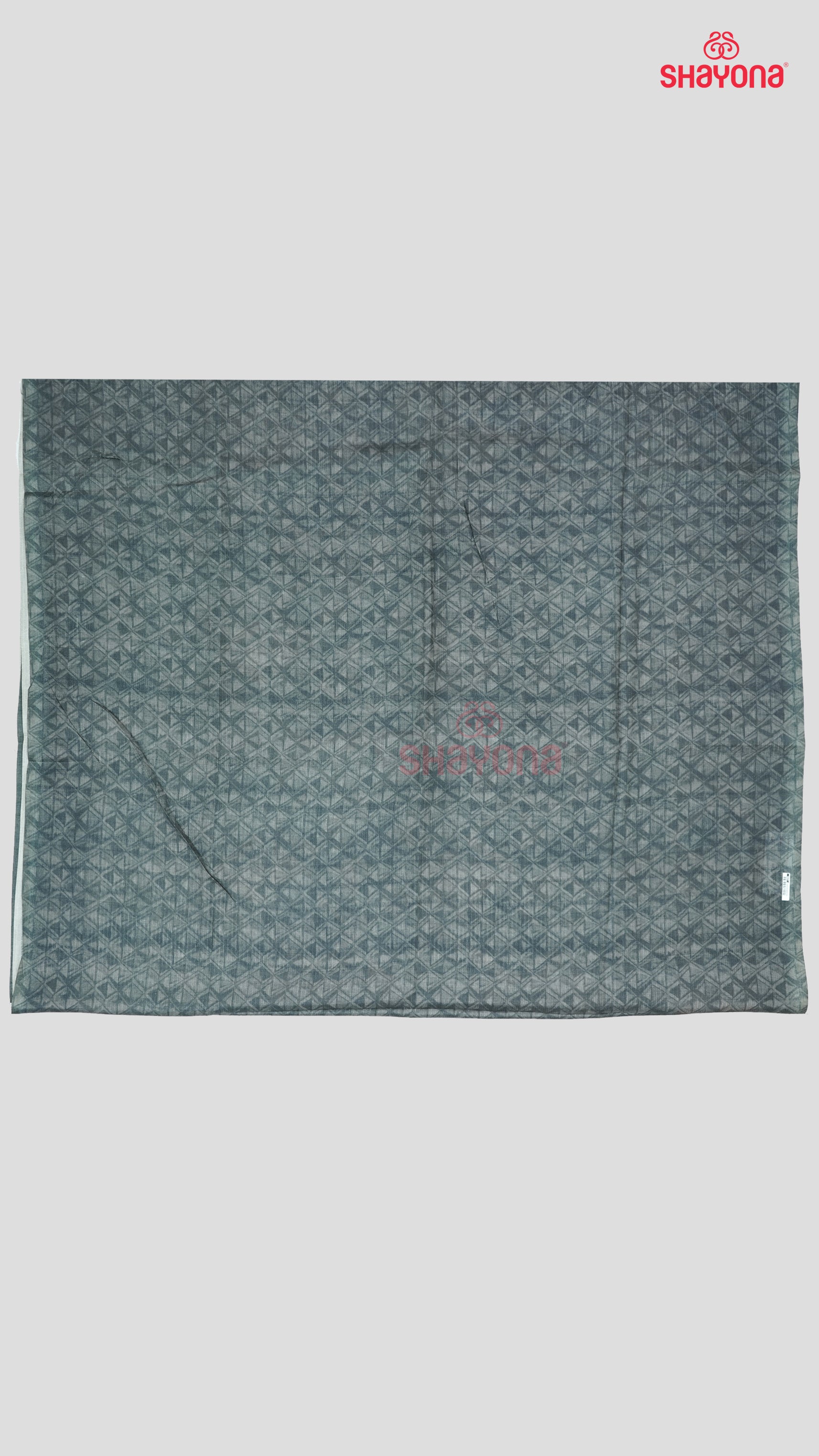 Drape yourself in understated elegance with this Light Black Weaved Tussa Based Cotton Saree. Designed with a unique digital triangle jaal print across the gala, this saree seamlessly blends tradition with modern artistry. The light black floral jaal digitally printed all over the light gold pallav and border enhances its richness, creating a graceful contrast that makes it perfect for festive and formal occasions alike.