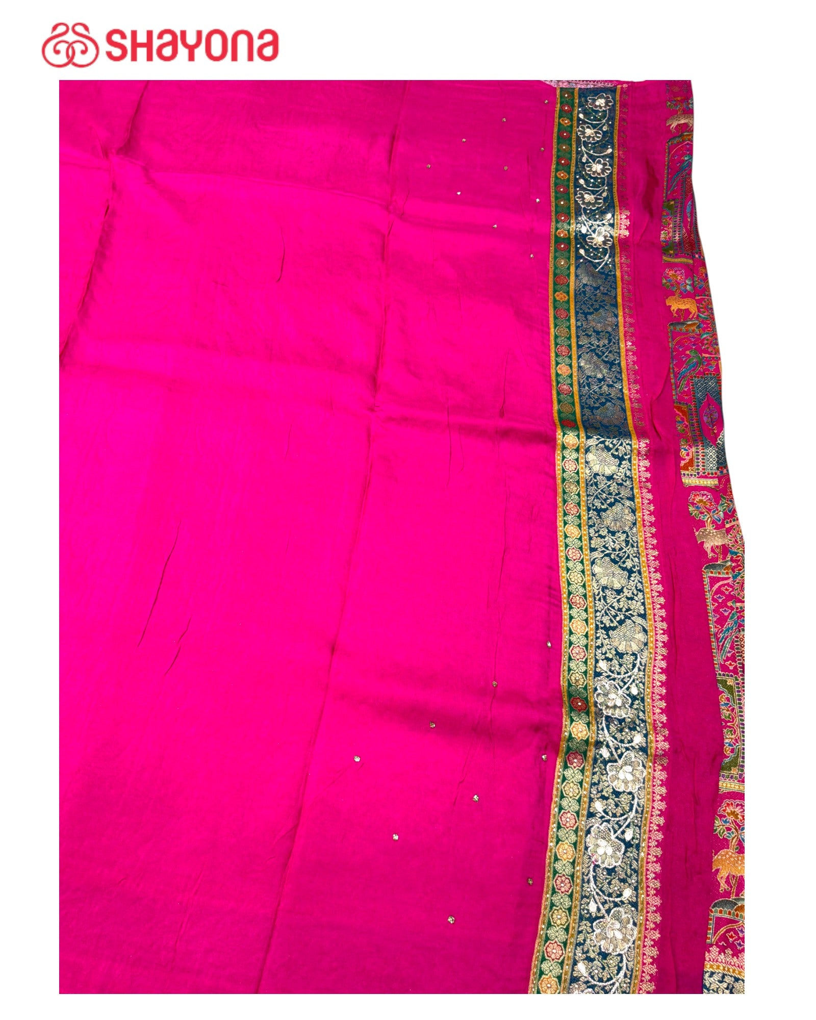 A masterpiece of elegance and heritage, this Tissue Pashmina Silk Saree with Handwork blends luxurious silk with delicate pashmina texture, adorned with intricate hand embroidery that reflects timeless Indian craftsmanship.