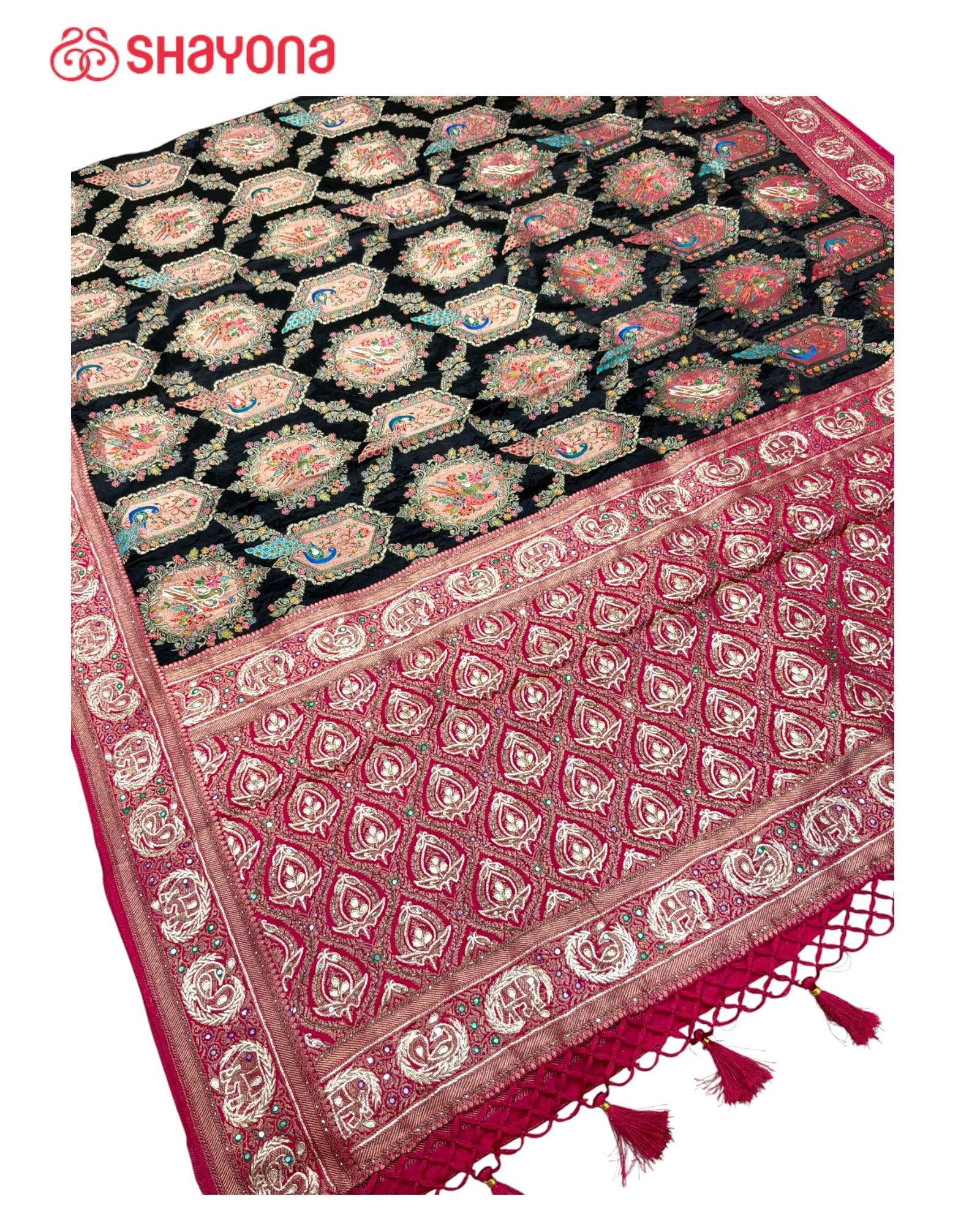 The saree is adorned with elaborate handwork, intricate motifs, and richly designed borders that reflect heritage artistry. The luxurious silk texture drapes beautifully, making it an ideal choice for weddings, receptions, festive celebrations, and special occasions.