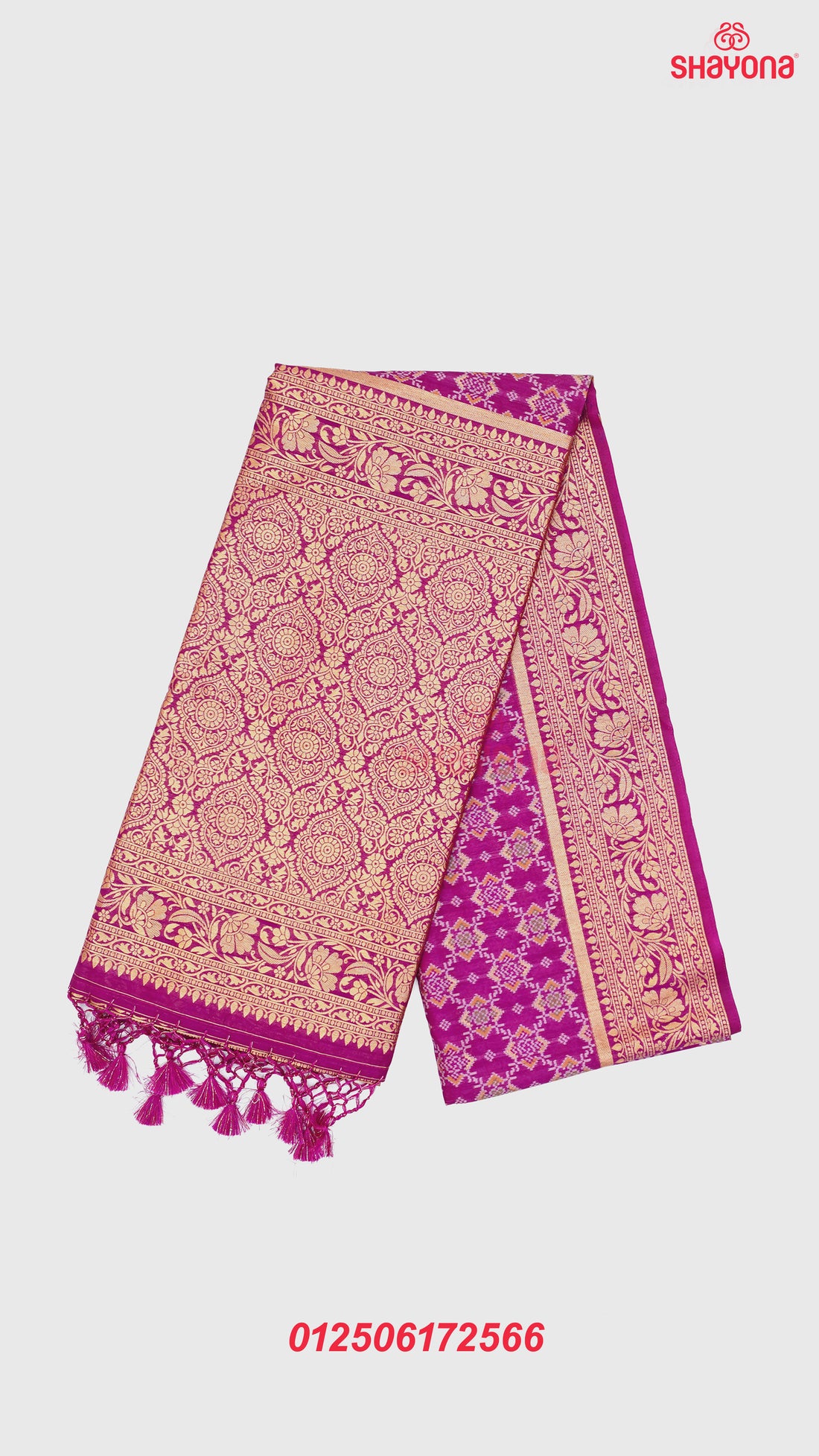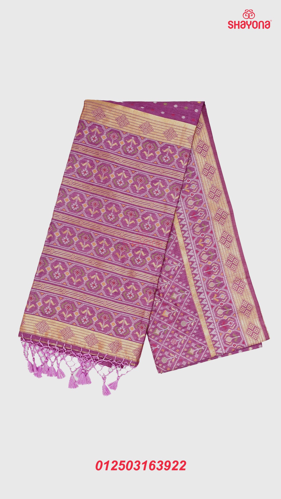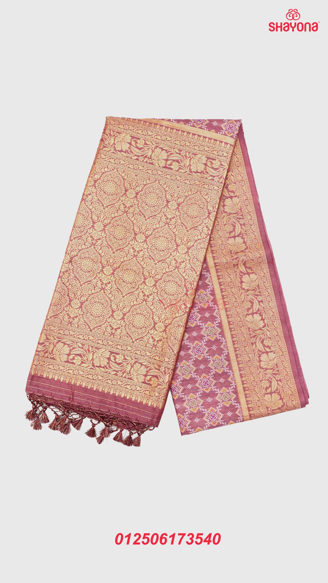 Product Description: Elevate your ethnic wardrobe with this regal Onion Purple coloured weaved Ghicha Art...