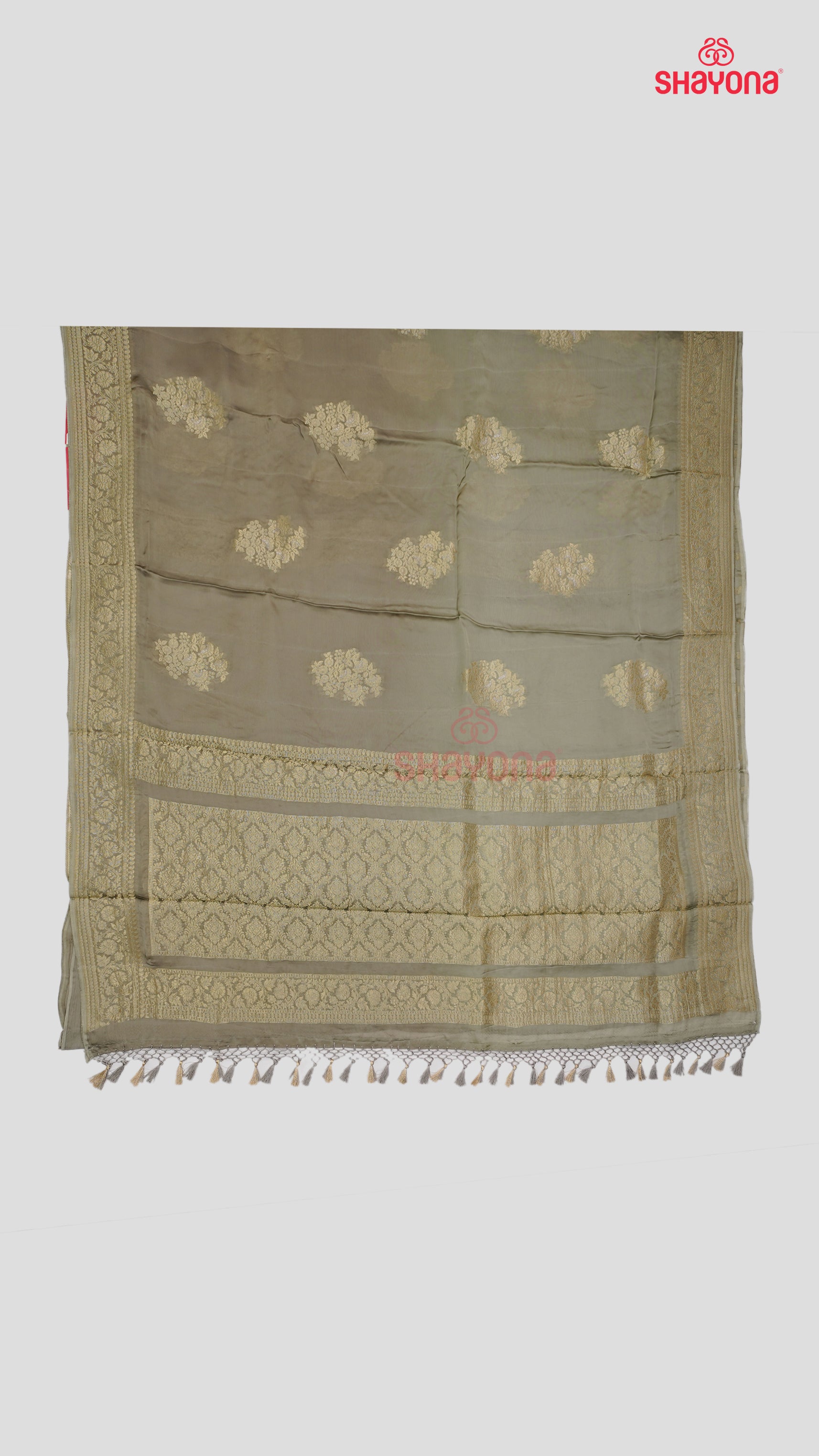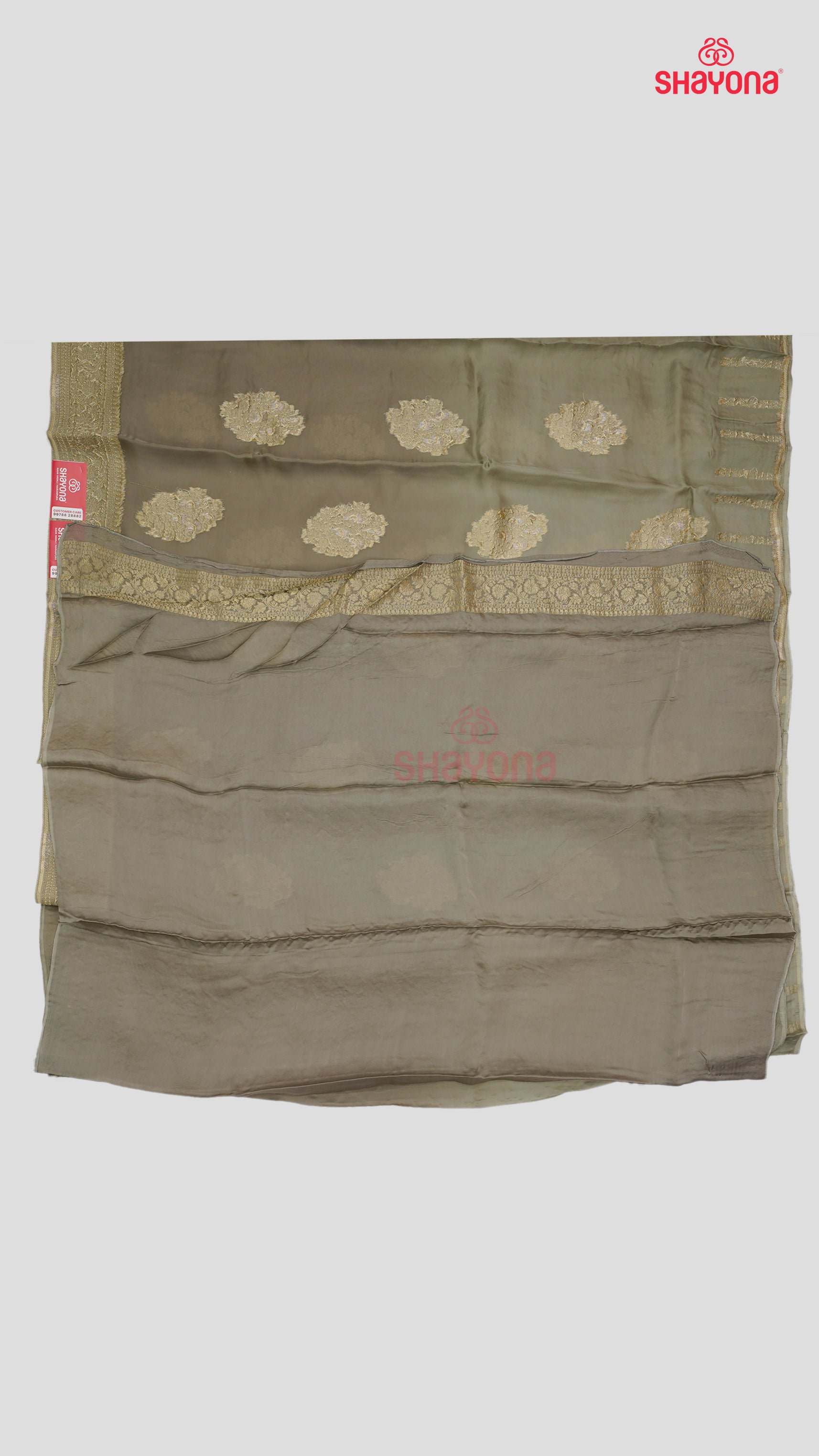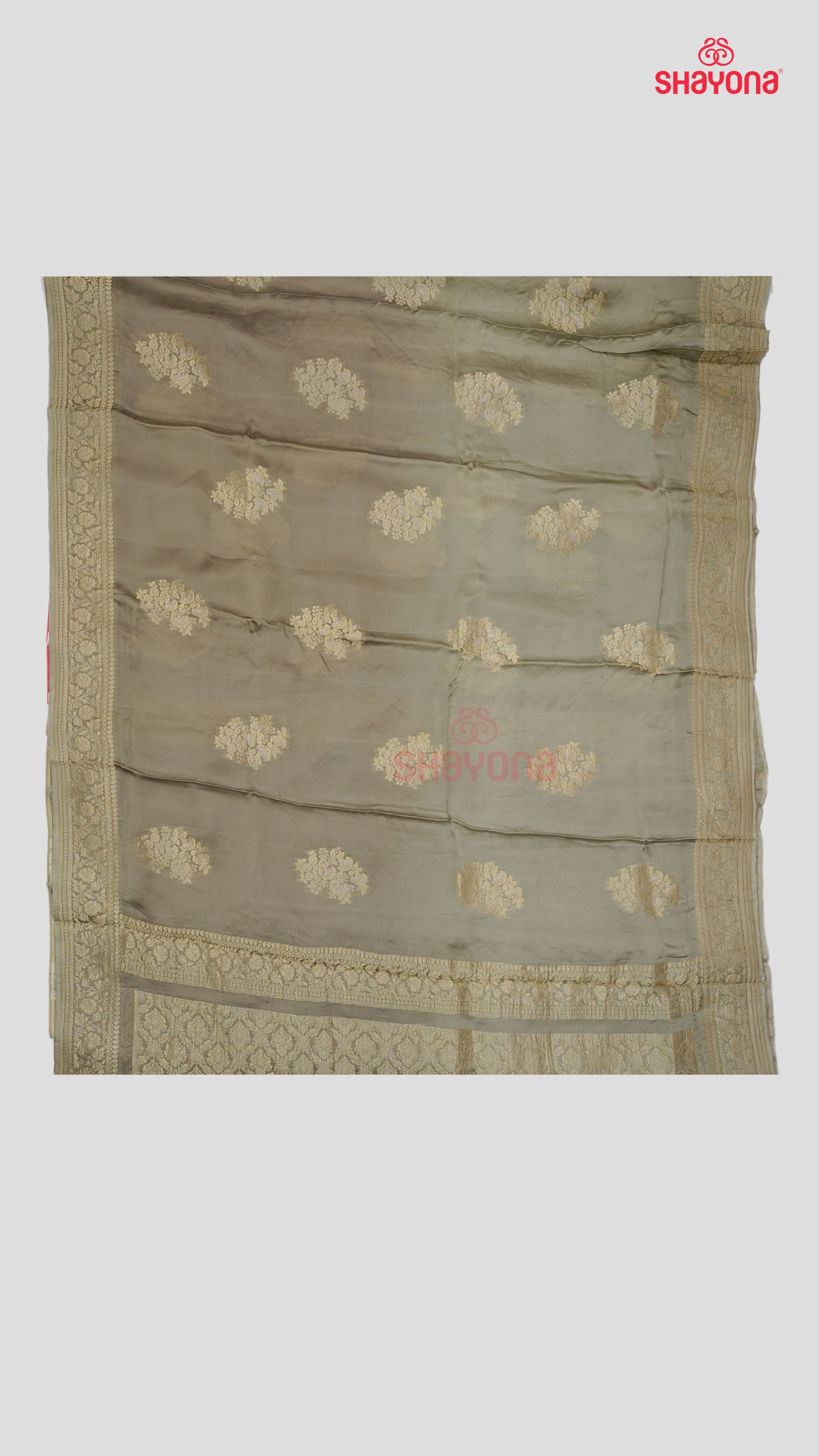 Gray Banarasi Georgette Khaddi Soft Silk Saree with Butta Gala, Jaal Nakshi Border & Heavy Pallav
