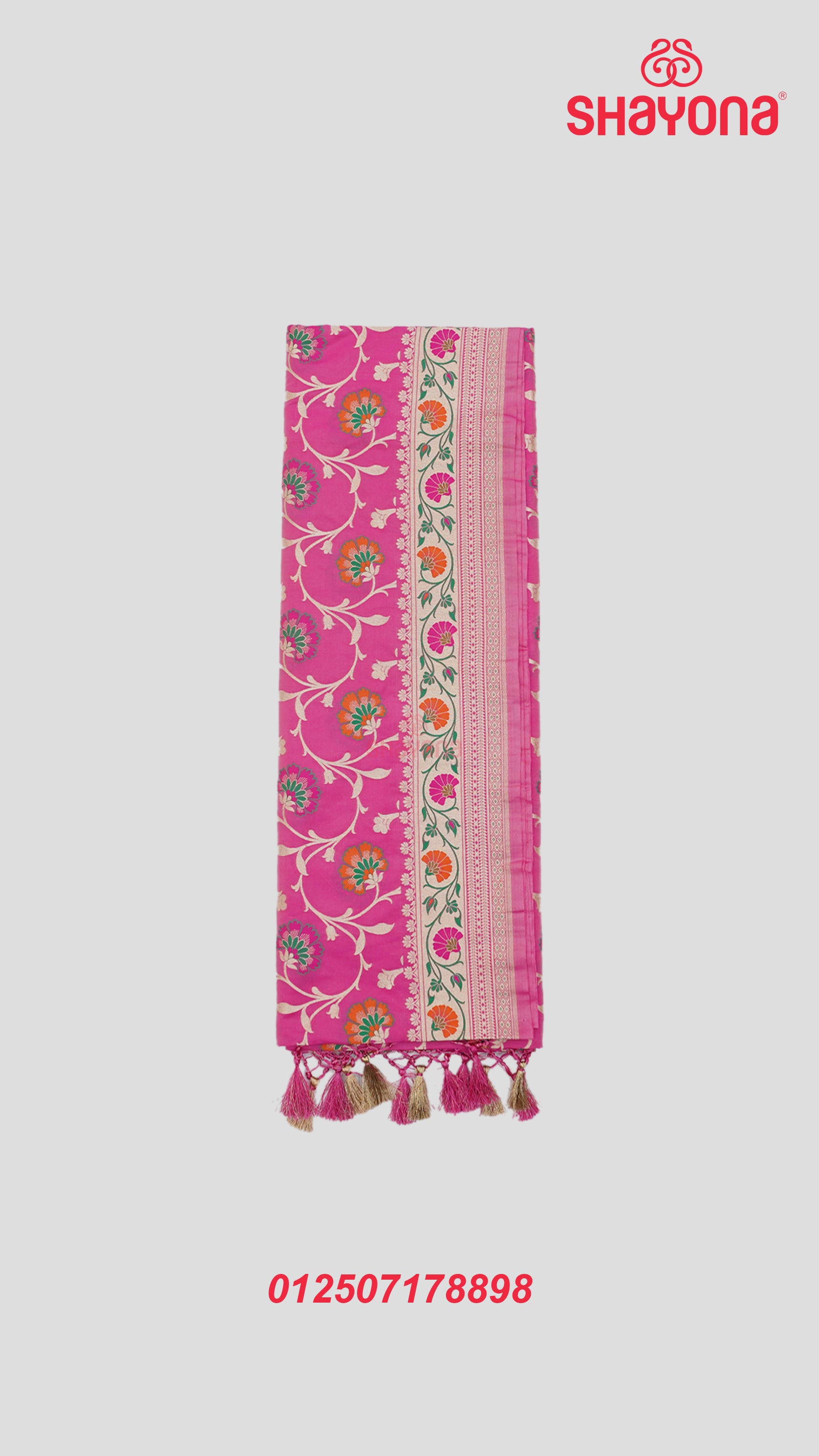 “Blush of Tradition – Light Deep Pink Banarasi Silk with Minakari Jaal Magic.”