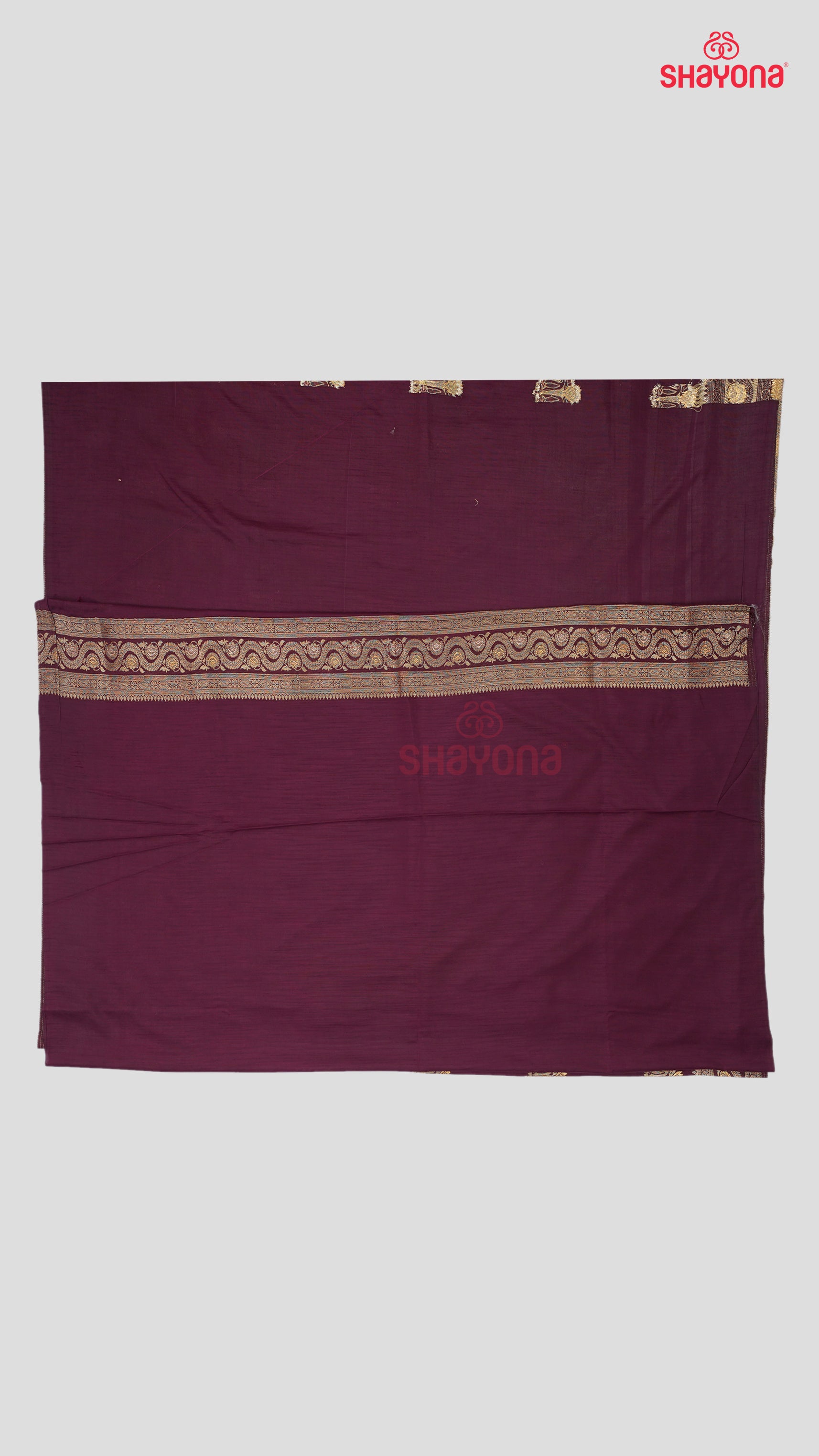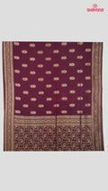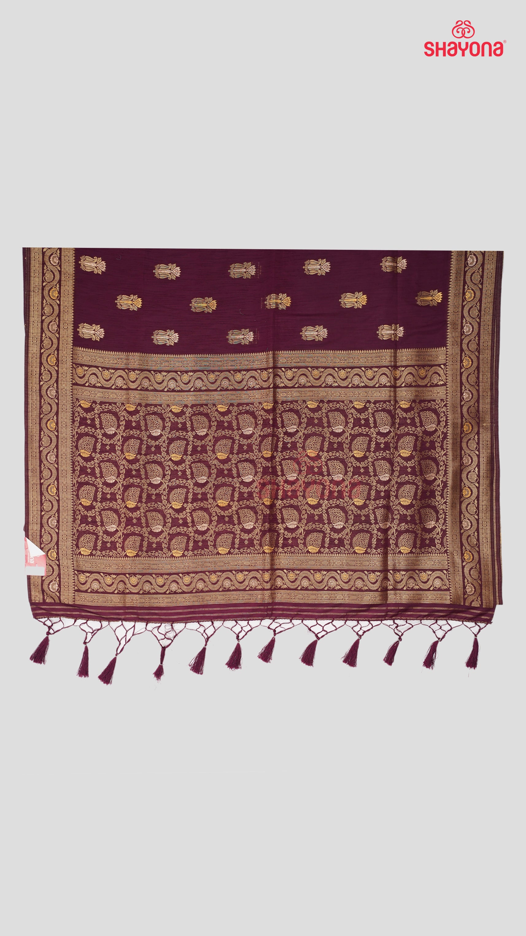 Wine Banarasi Soft Silk Saree with Golden Butta & Nakshi Border