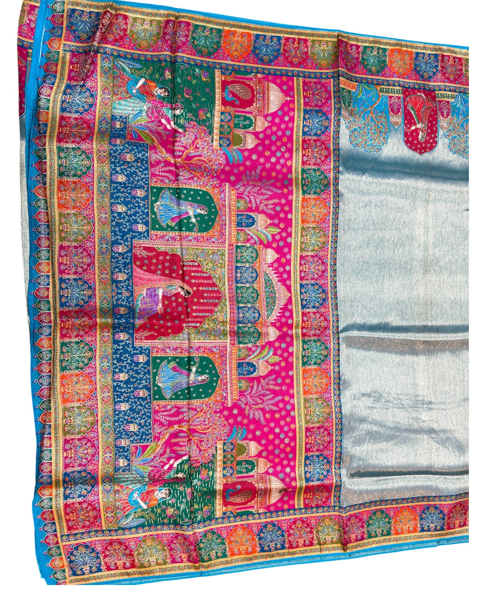 Step into sophistication with this Steel Blue Artificial Tissue Pashmina Silk Saree, woven with artistic finesse and cultural heritage. The saree features a plain gala enriched with butta jaal, while the heavy pallav and broad nakshi border are intricately designed with traditional motifs of peacocks, women, and floral patterns. Paired with a matching Steel Blue floral jaal blouse with border, this saree is a perfect choice for weddings, festivals, and grand occasions where elegance meets royalty.