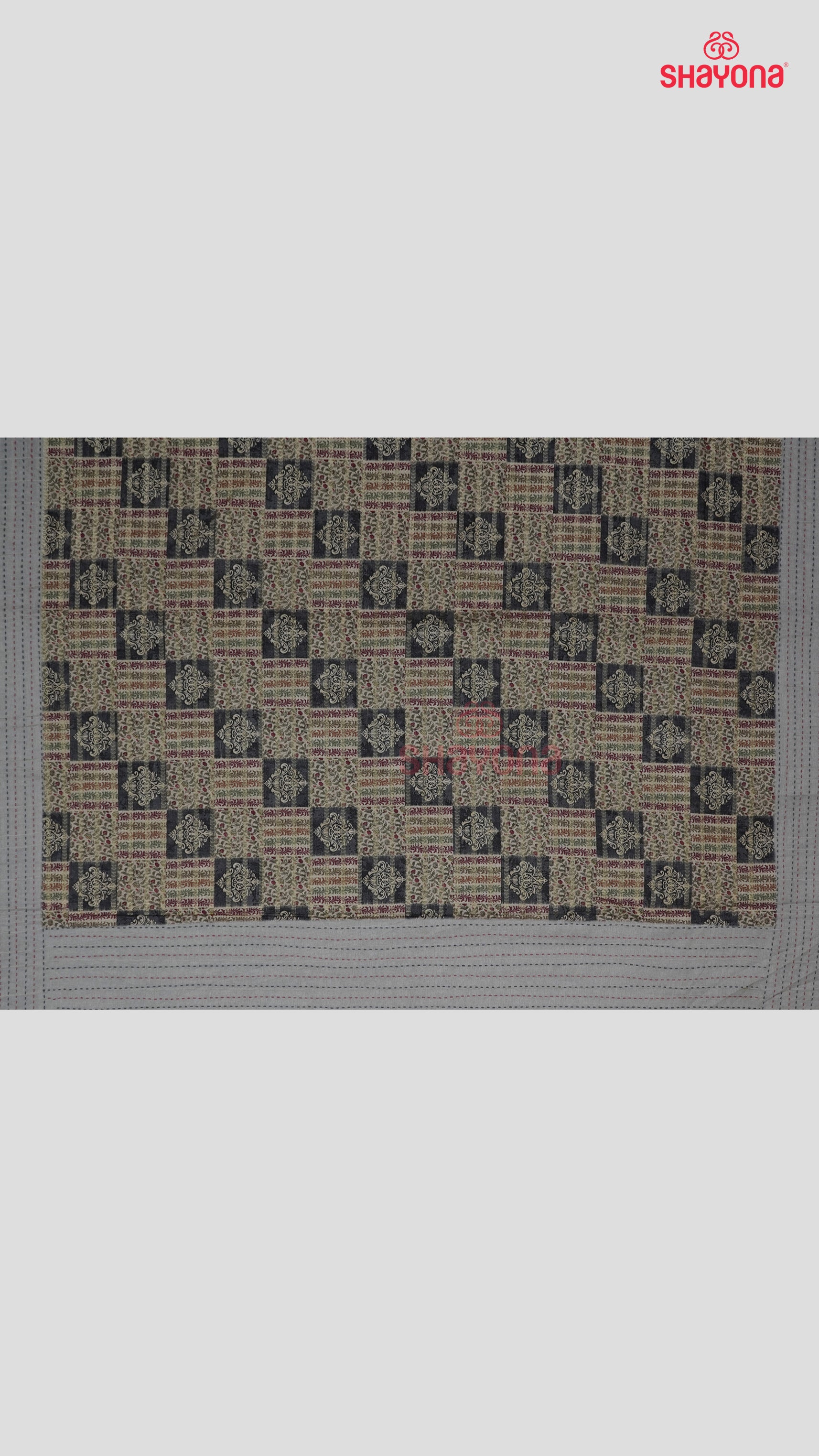 Unveil the charm of timeless craftsmanship with this gray and multicolor weaved Tussa-based cotton saree. Crafted from a lightweight fabric, the saree features golden Chanderi checks woven throughout and intricately digitally printed traditional and floral motifs. Enhanced with a katha work border and pallav, this 5.50-meter saree is paired with a 0.80-meter matching blouse piece, making it a perfect choice for elegant daytime events, office wear, or festive gatherings.