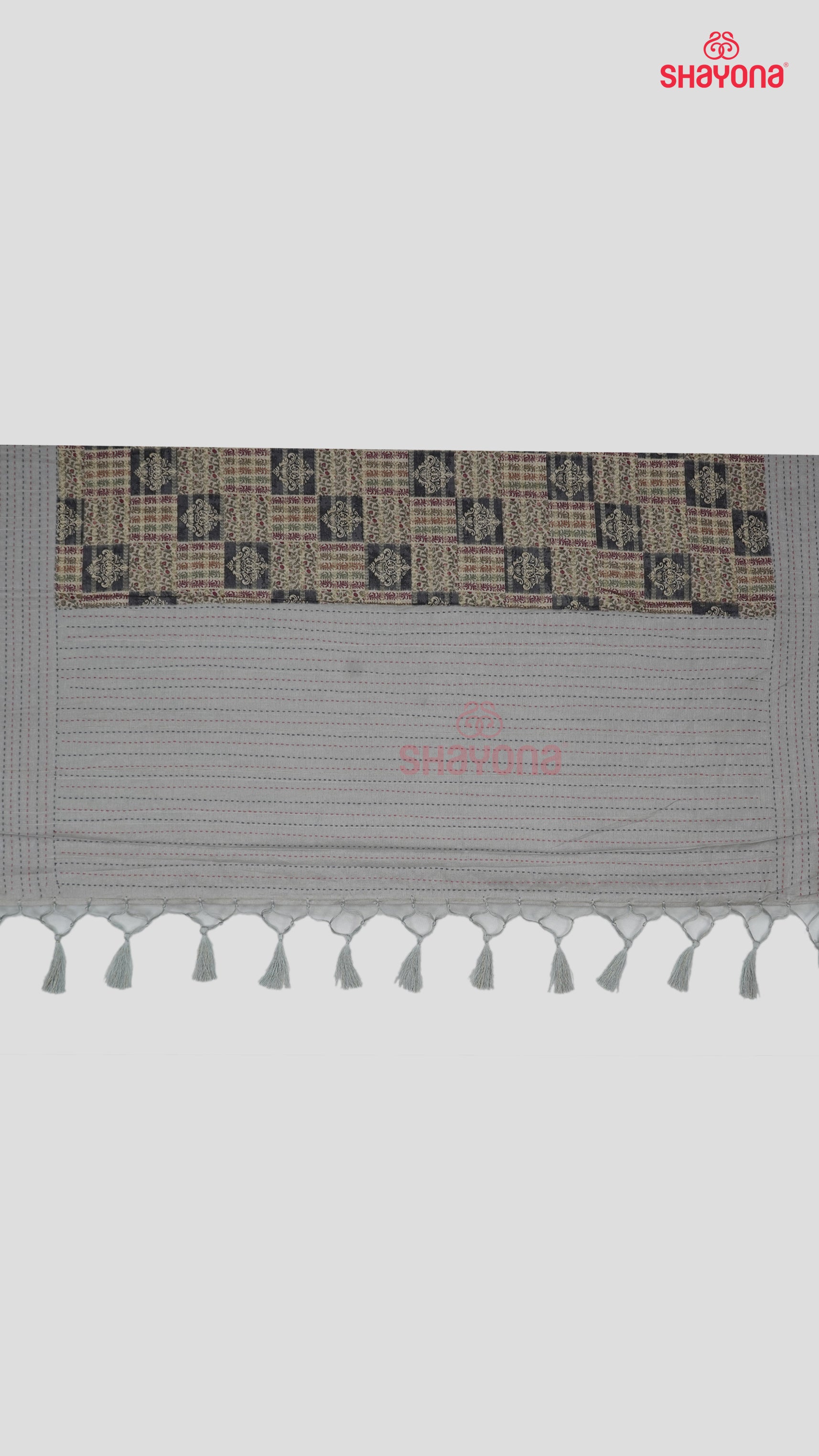 #GraySaree #TussaCottonSaree #DigitalPrintSaree #ChanderiChecks #MulticolorSaree #KathaWorkBorder #ShayonaSarees #ElegantEthnicWear #CottonSareeLove #SareeWithBlousePiece
