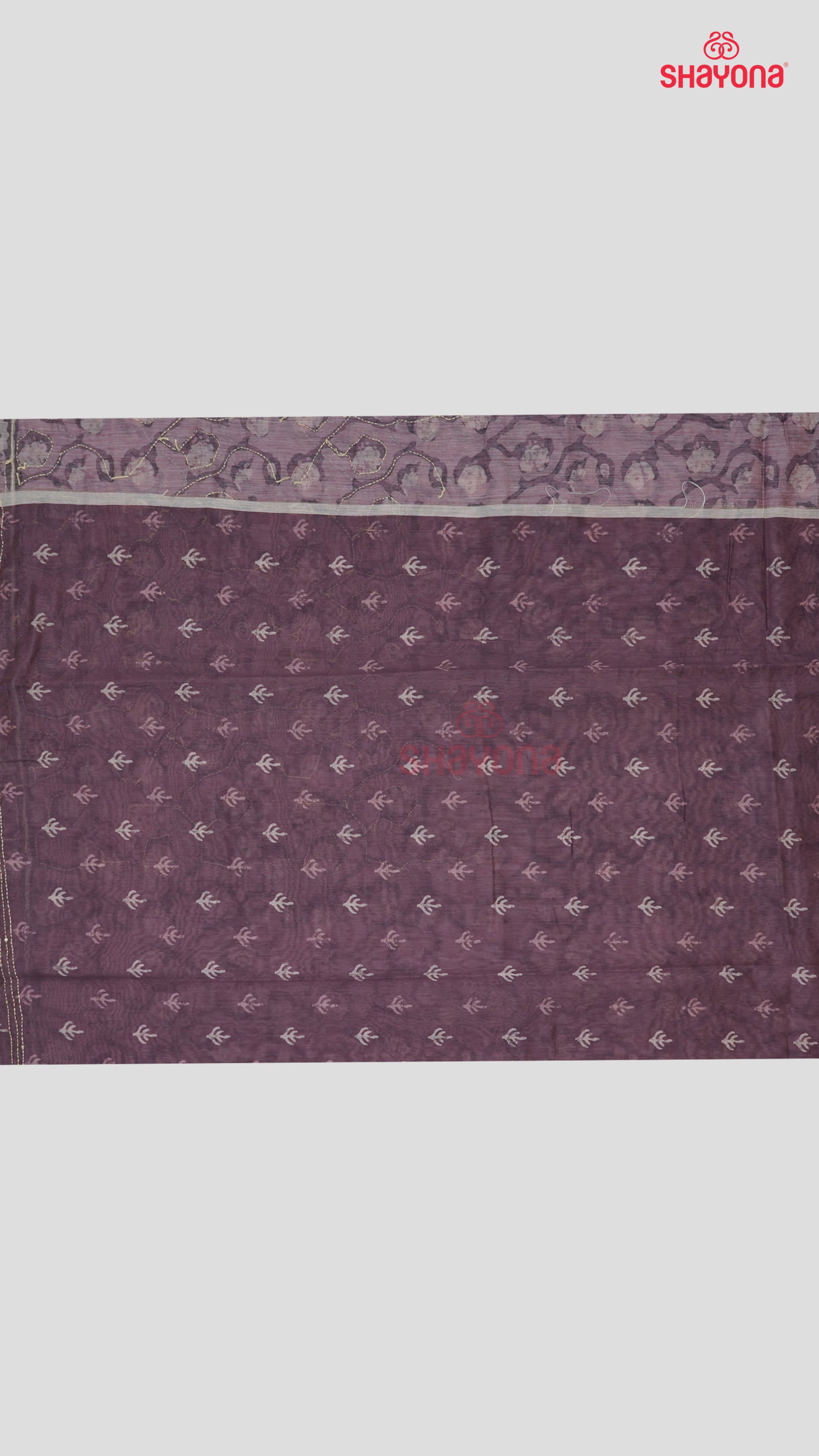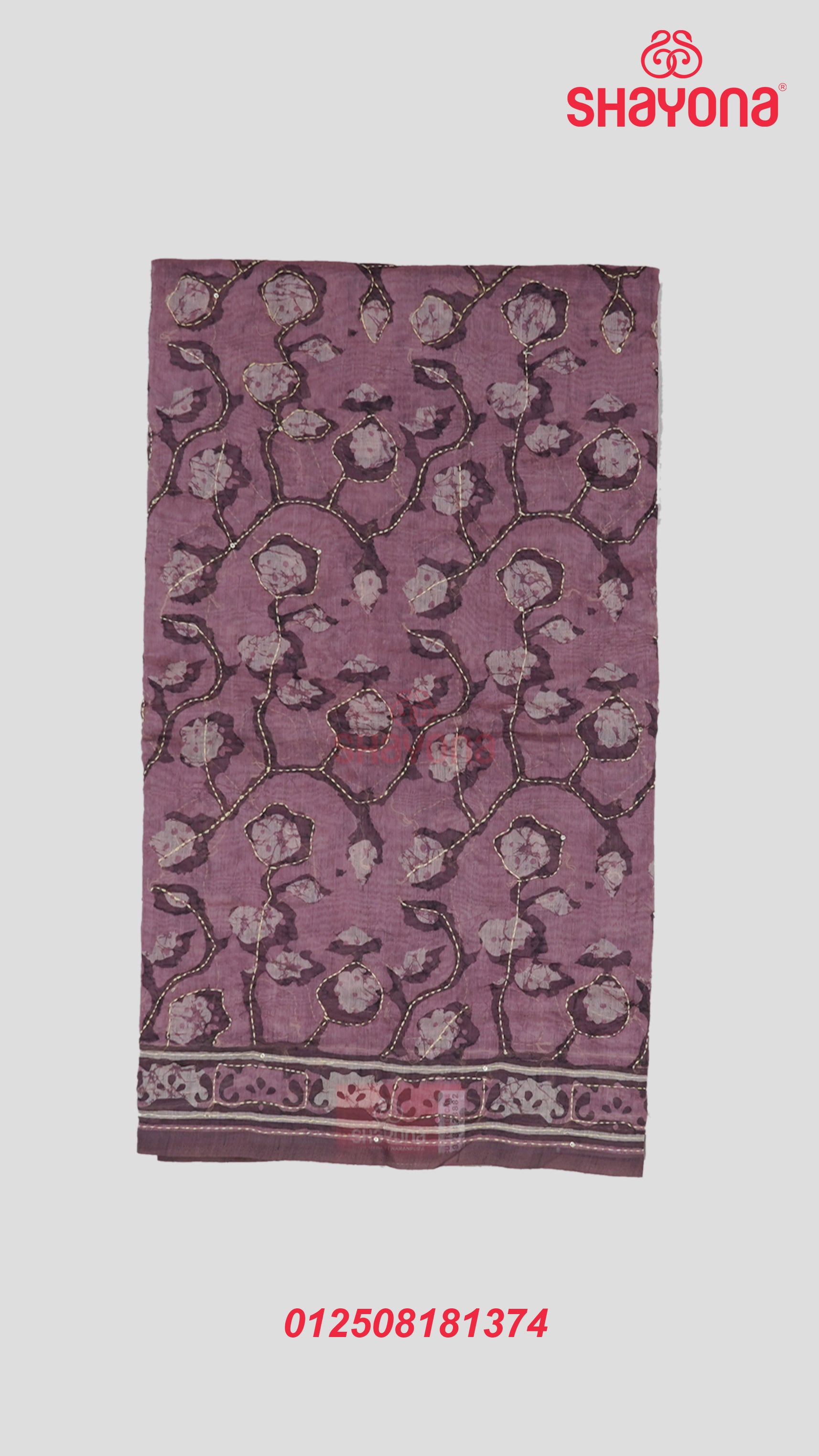 Step into effortless elegance with this medium onion-coloured weaved Tussa-based cotton saree, beautifully adorned with digital printed butti motifs all over. The soft and breathable fabric is enhanced with intricate katha work over the digitally printed design, extending gracefully across the saree body, border, and pallav. Measuring 5.50 meters, it comes with a coordinated 0.80-meter blouse piece, making it ideal for casual, festive, or semi-formal occasions.