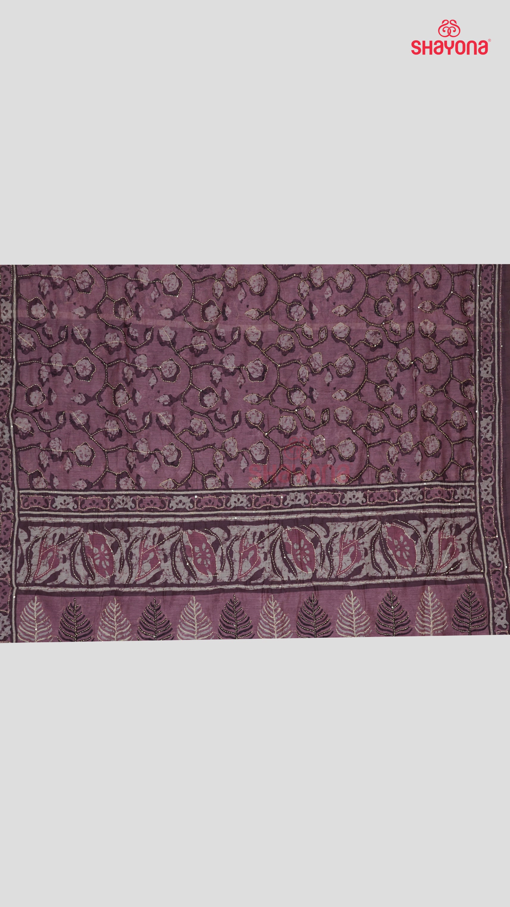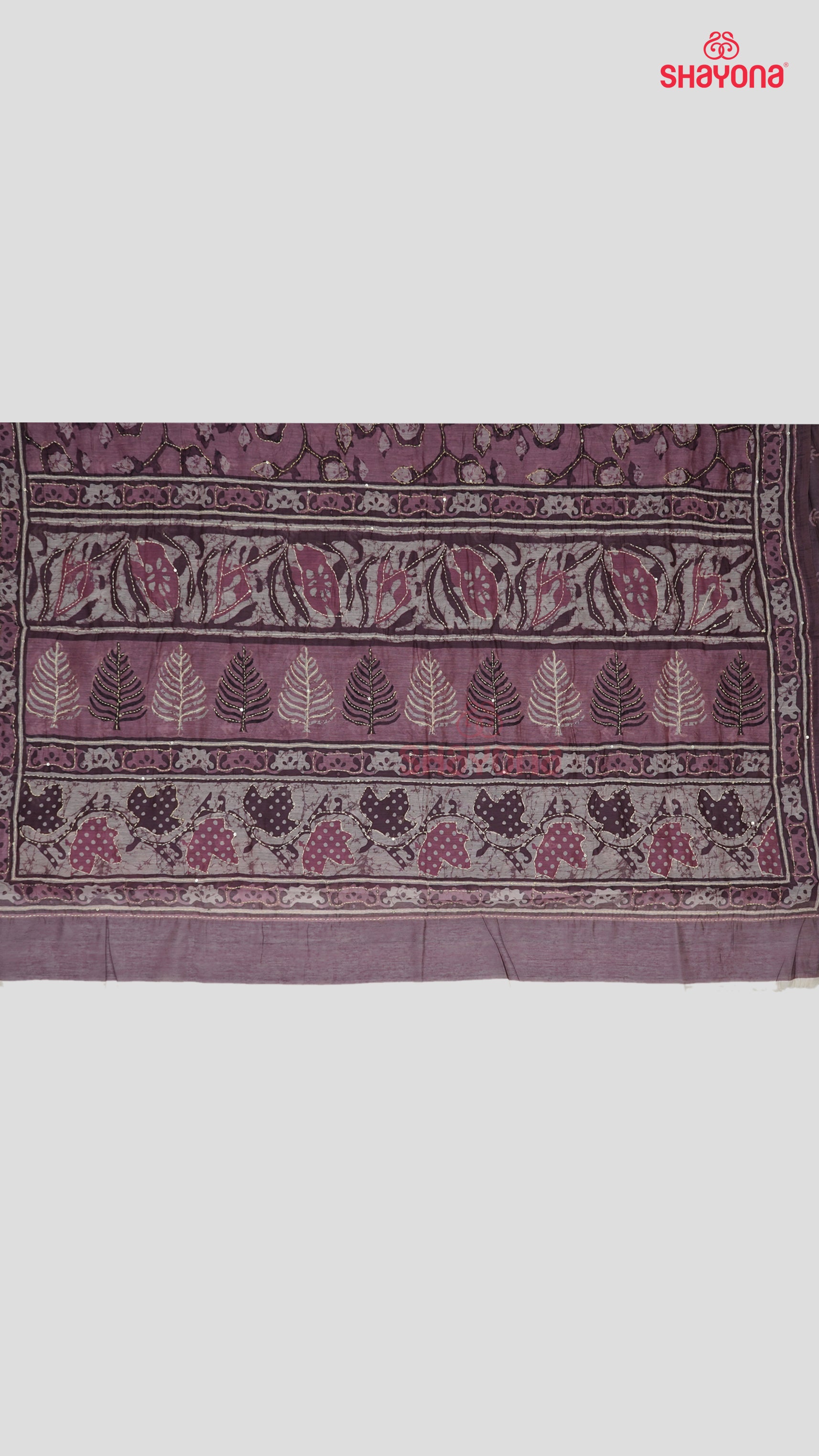 Medium Onion-Coloured Tussa-Based Cotton Saree with Digital Printed Butti & Katha Work