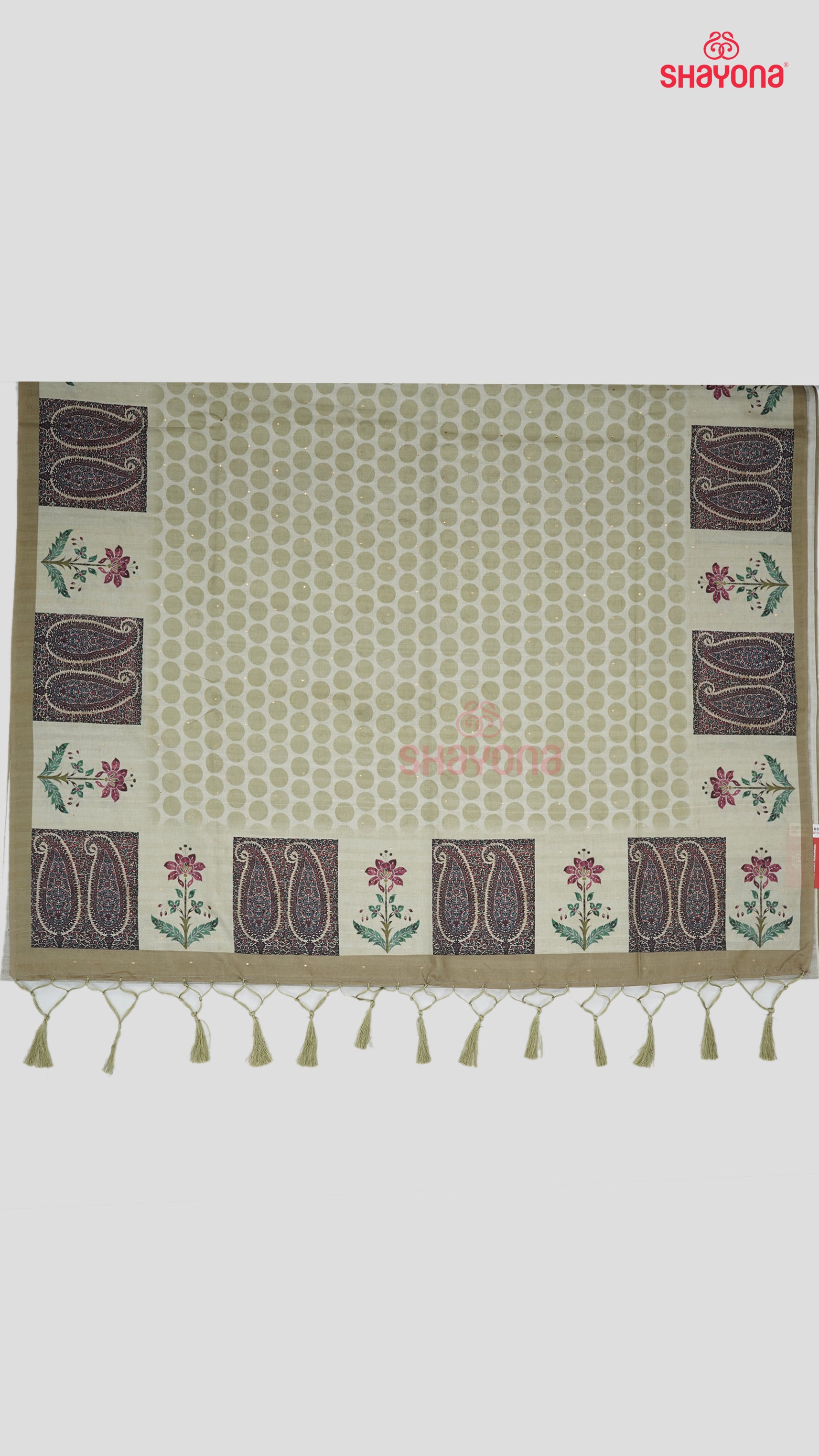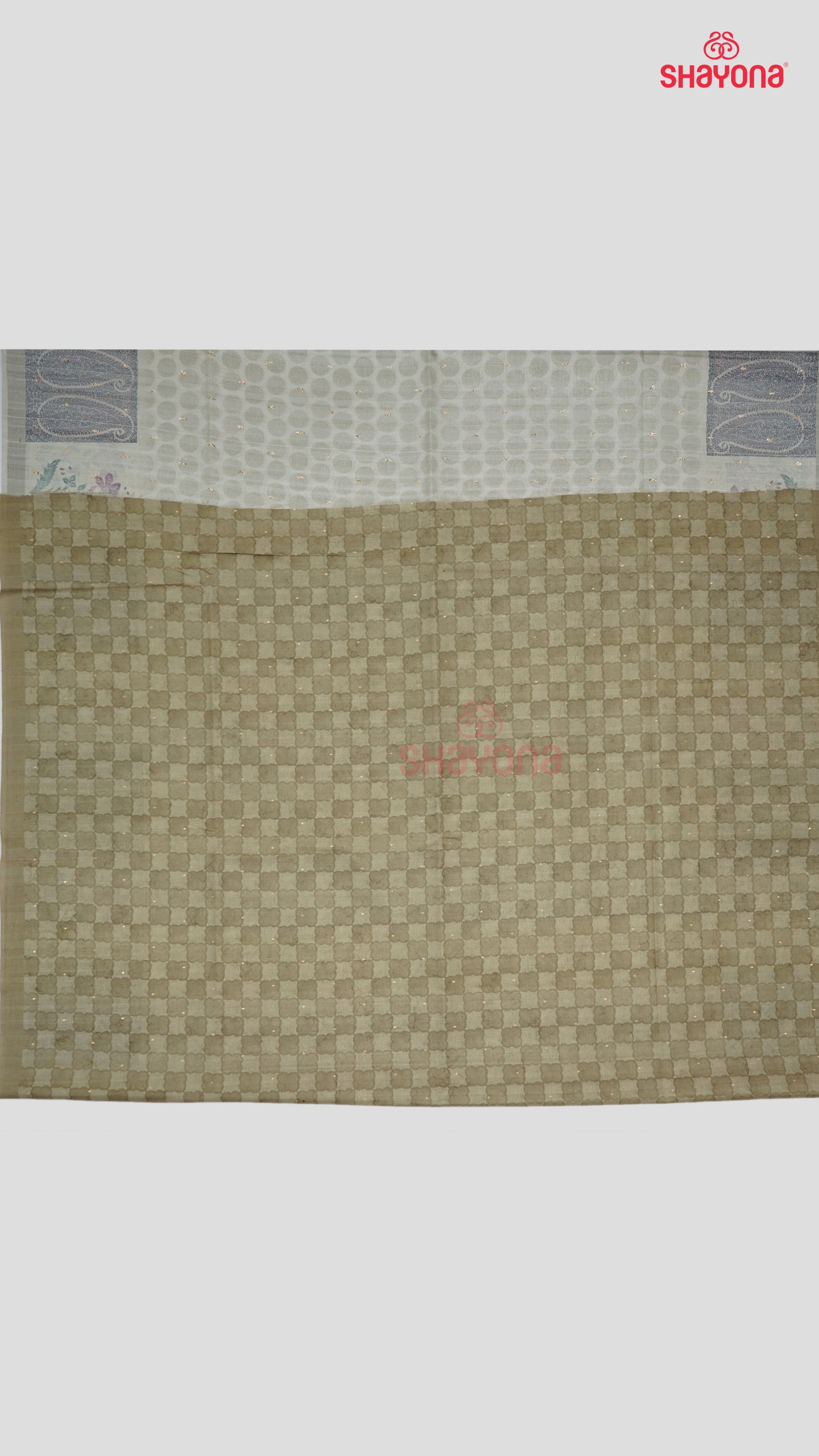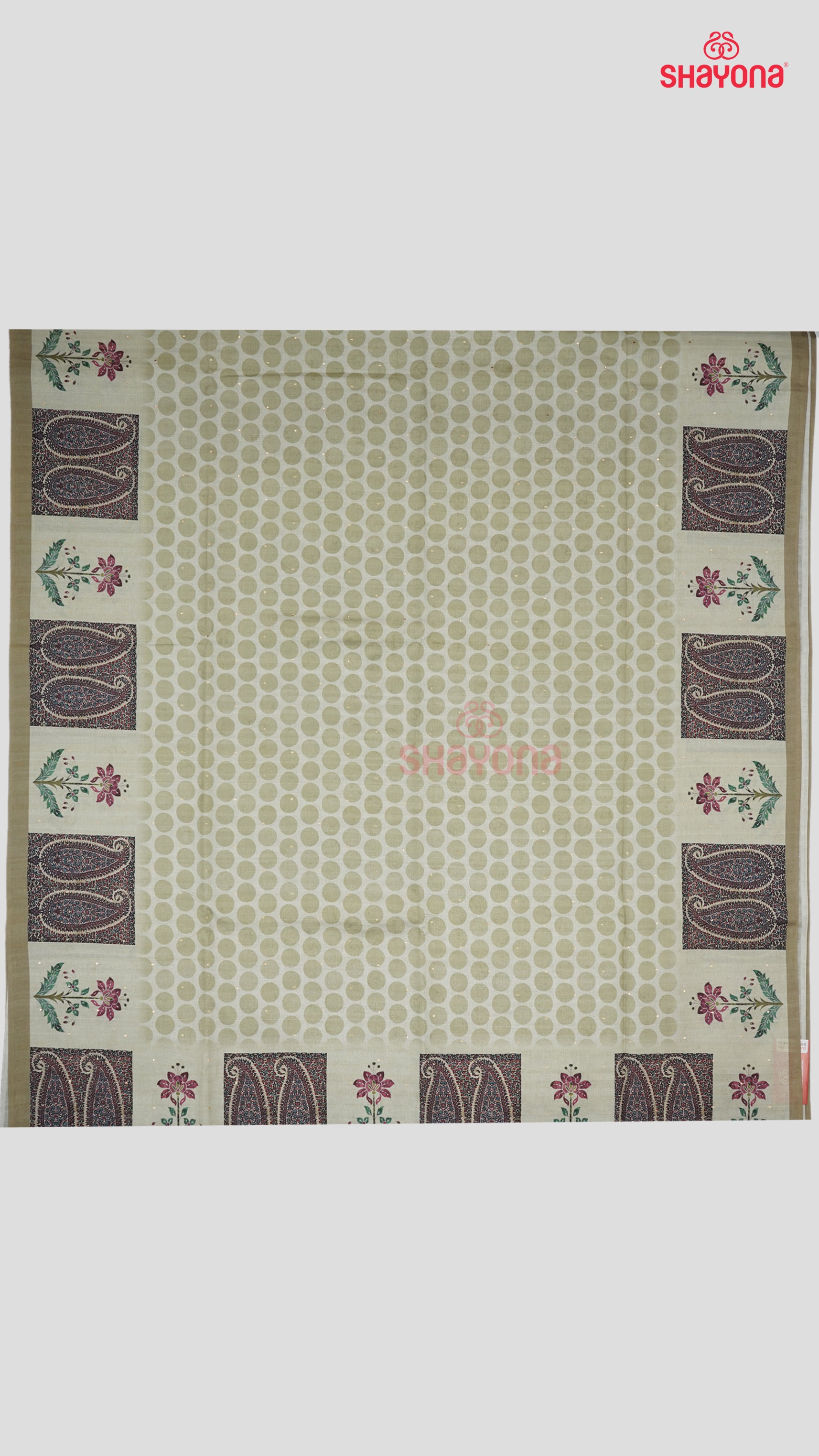 #SageGreenSaree #DigitalPrintedSaree #TussaCottonSaree #CheckSareeStyle #SubtleElegance #ShayonaSarees #BorderedSaree #ModernTradition #SareeTrend2025 #ElegantWeaves