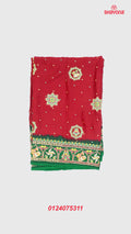 Designed with heavy hand embroidery and fine craftsmanship, the saree features all-over buttis and Kalash butta motifs, representing spiritual prosperity and tradition. The nakshi border beautifully incorporates auspicious symbols like the Swastik, Sarnai, and Kalash, adding layers of symbolic meaning and aesthetic depth. The richly woven pallav completes the saree with a majestic finish — making it a perfect ensemble for bridal rituals, pooja ceremonies, and festive occasions.
