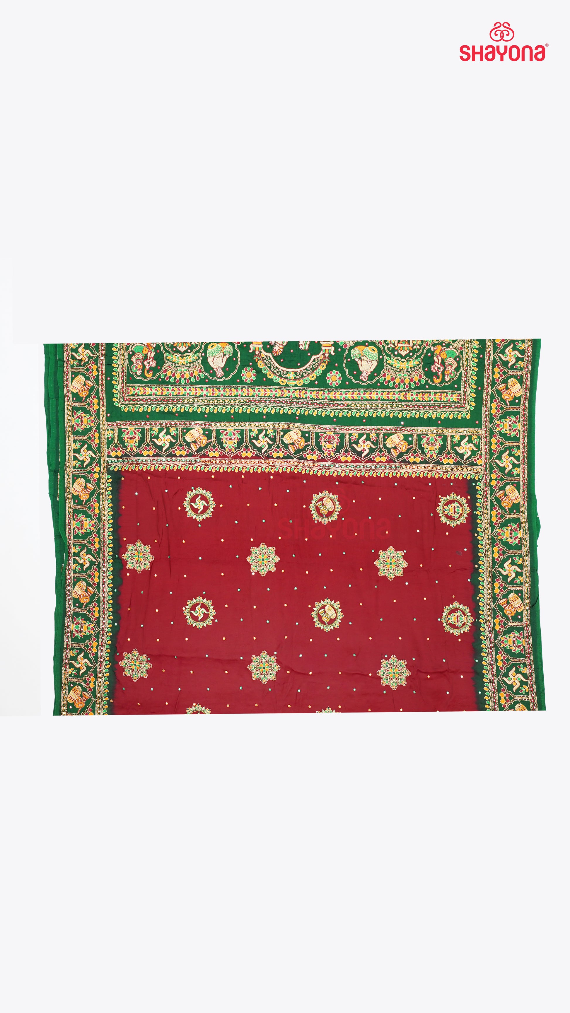 #SwastikSaree#KalashButtaGharchola#SarnaiBorderSaree#ShayonaTradition#GajjiSilkHeritage#HandworkedSaree#BridalGharchola#MaroonGreenElegance#GujaratiWeddingSaree#ShayonaEthnicWear