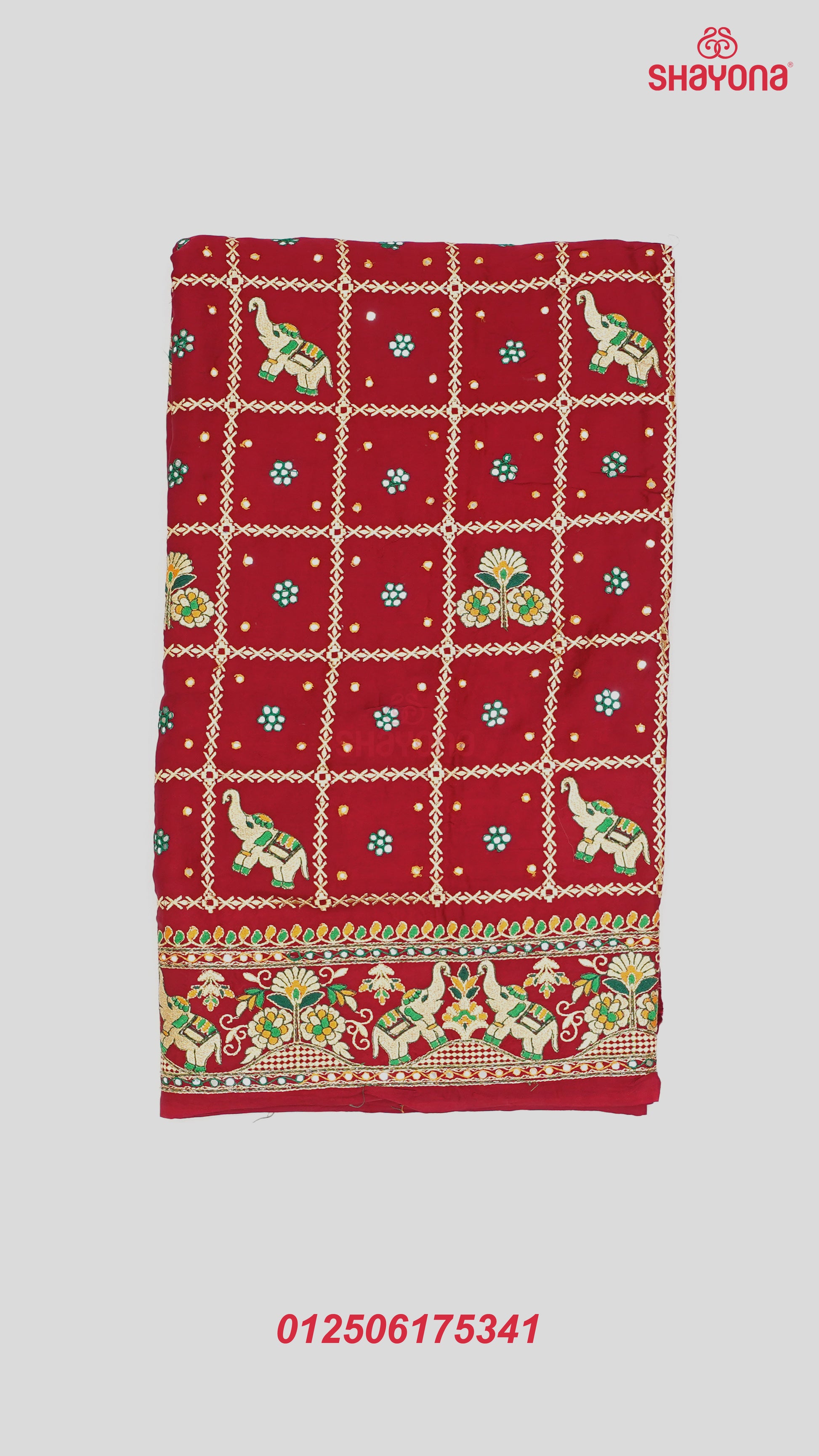 Adorned with heavy hand embroidery of elephants, flowers, and plants, this masterpiece features all-over checks with elephant buttas and mirror work that add a vibrant ethnic charm. The richly decorated nakshi border and detailed pallav capture the essence of royal Gujarati craftsmanship. Comes with a plain & border blouse piece of 0.80 meters, perfect to complete the traditional bridal look.