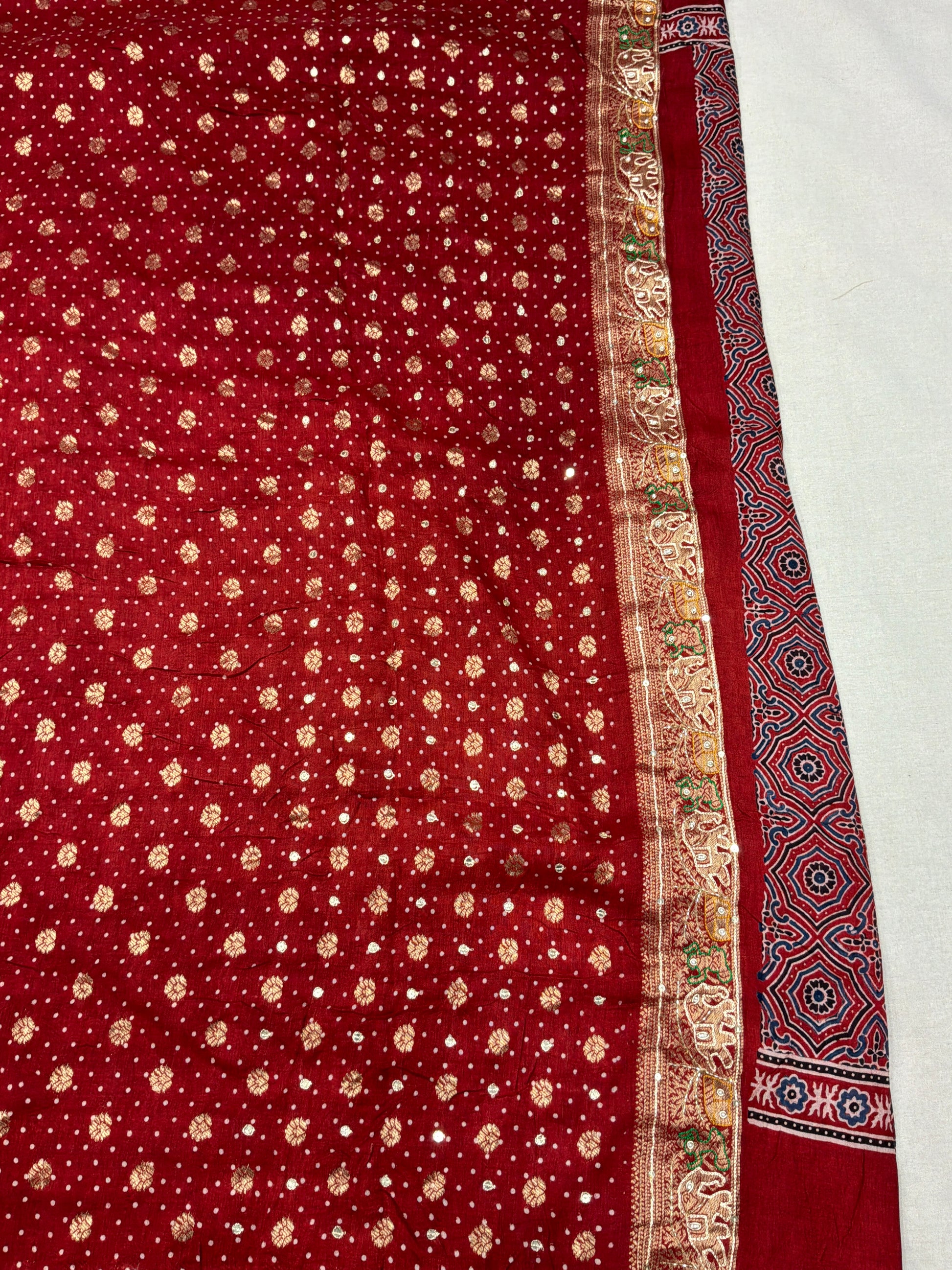 This Pure Gajji Silk Gharchola Saree is more than attire—it is a celebration of culture and tradition. Revered for its auspicious significance, vibrant red hues, and rich silk texture, it holds a special place in bridal wardrobes. Designed to be worn and cherished across generations, it represents elegance, devotion, and timeless beauty.