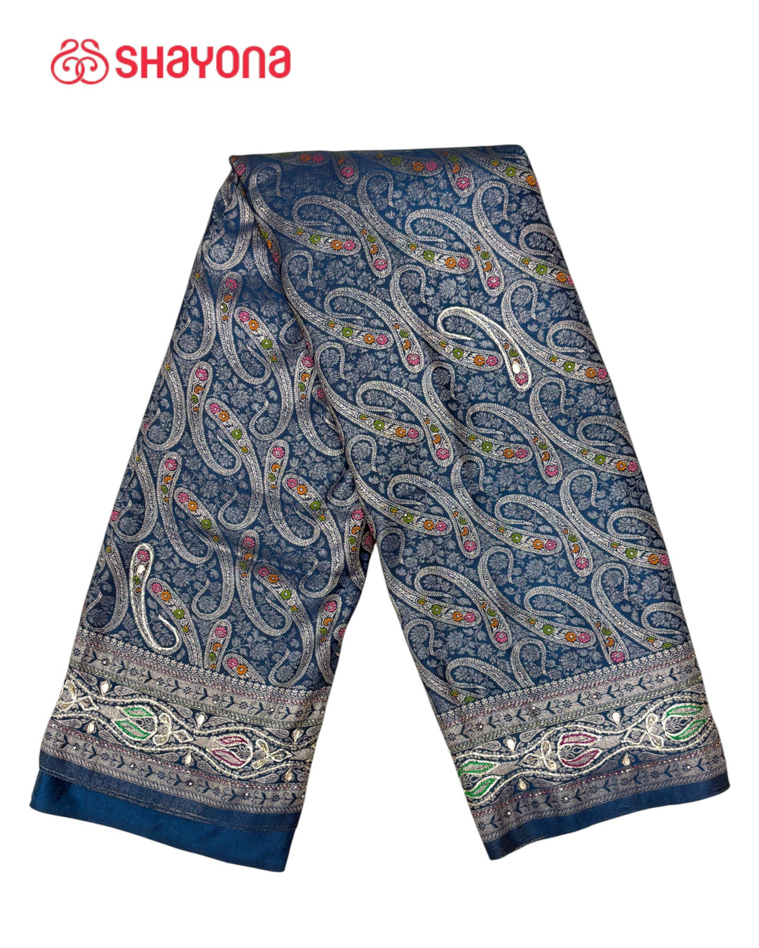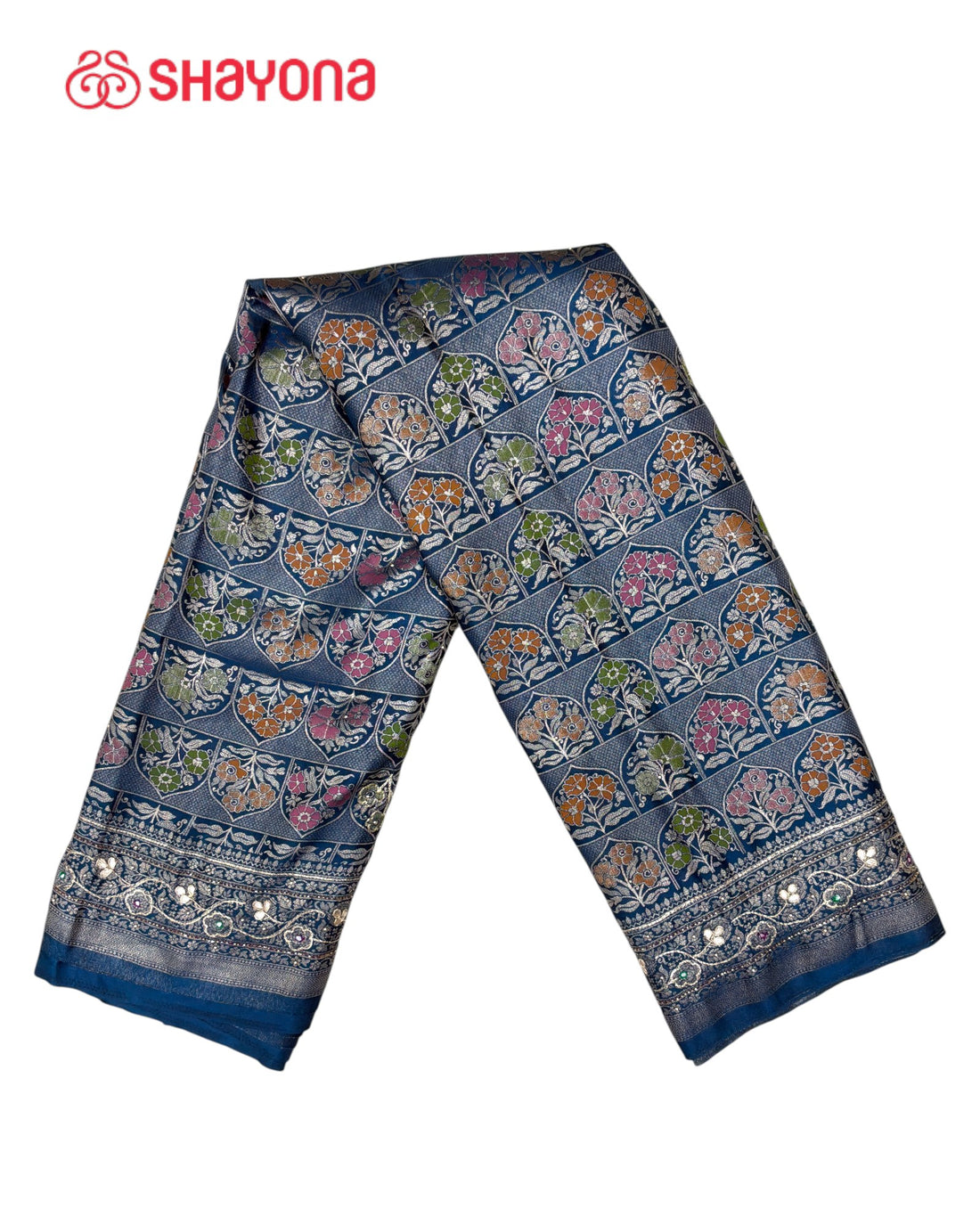 Party wear sarees are a staple in every Indian woman's wardrobe, and for good reason. Most of the party wear sarees are not made up of pure silk instead, the designers add more elements than the casual sarees, like heavy embroidery, which makes them look like party material. Partywear sarees are typically made from luxurious fabrics like silk, georgette, chiffon, and satin. These styles often incorporate unique designs and patterns that make them stand out.