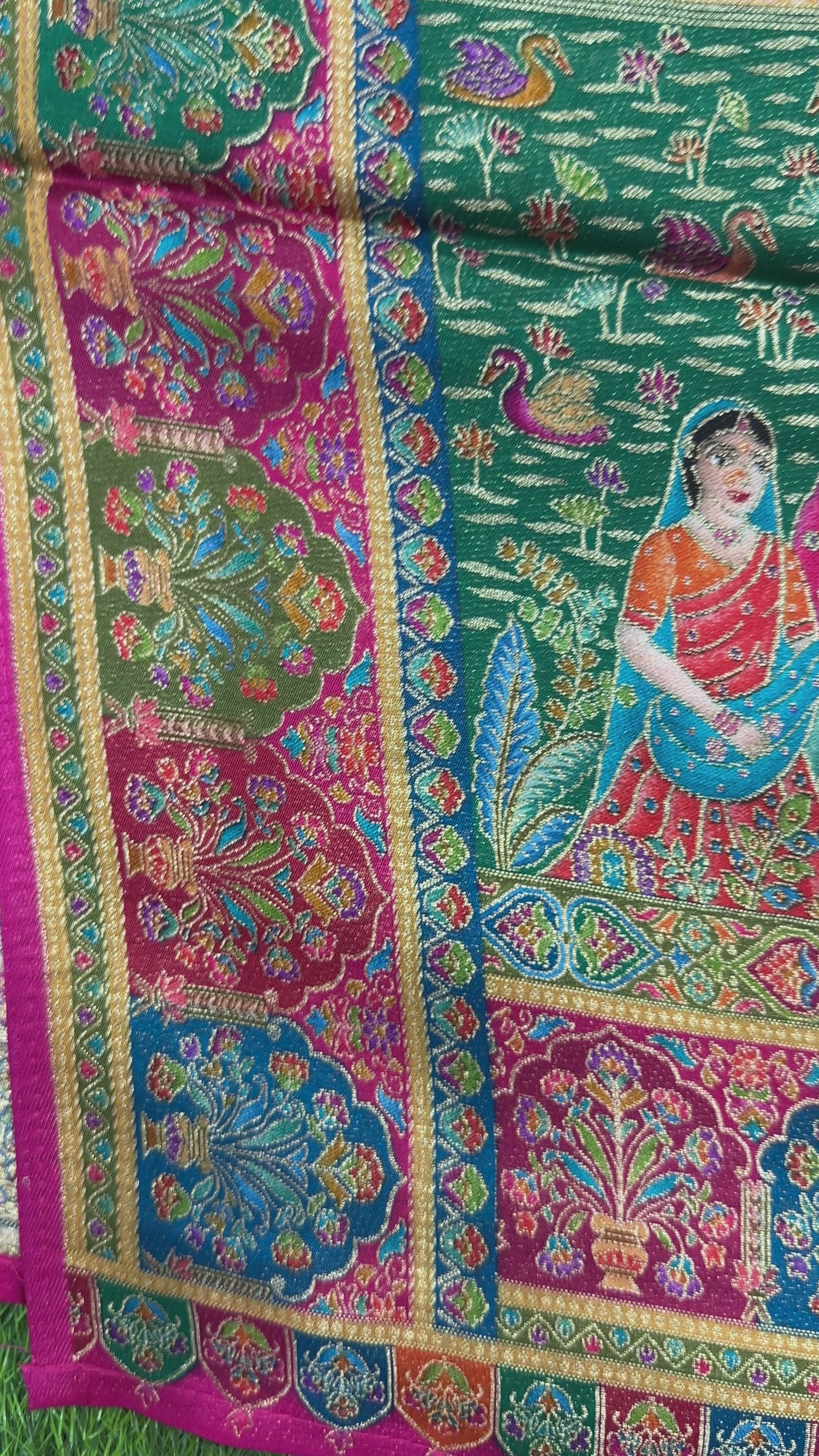 Drape yourself in grandeur with this Dark Pink Artificial Tissue Pashmina Silk Saree, beautifully adorned with a matching floral jaal blouse. The saree features a plain gala enhanced with delicately woven butta jaal, while the heavy pallav and broad nakshi border showcase traditional artistry with motifs of peacocks, women, and floral designs. This masterpiece combines the richness of heritage weaving with the charm of modern sophistication, making it a perfect pick for weddings, festive occasions, and cultural celebrations.