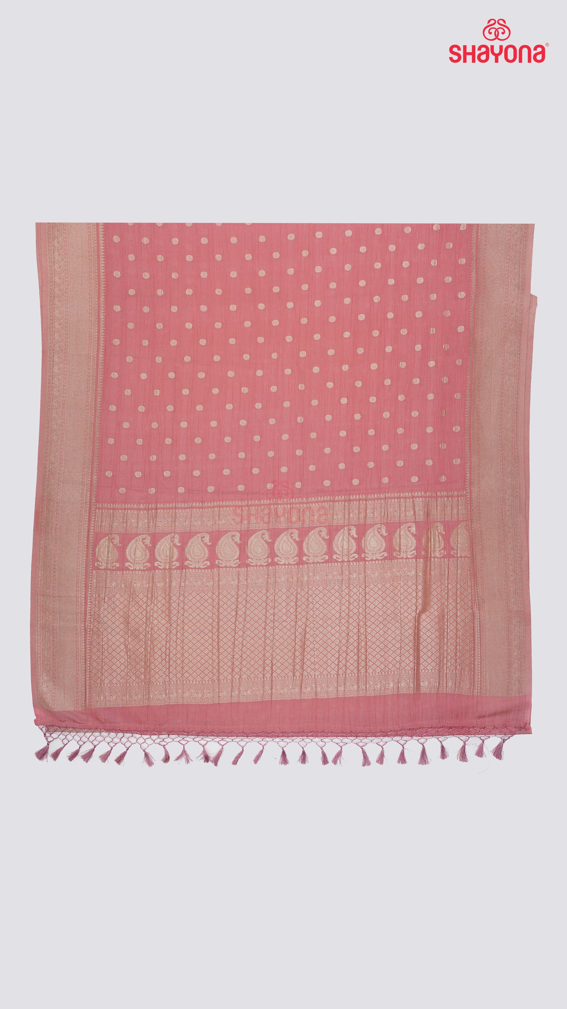 Step into timeless beauty with this Dark Pink Banarasi Georgette Khaddi Print Saree, meticulously crafted in soft silk for an effortlessly regal drape. The saree showcases all-over butti gala motifs woven with traditional finesse, paired with an intricately detailed jaal nakshi border that exudes royalty. The richly designed heavy pallav adds drama and grace, making this piece a perfect choice for festive, bridal, or celebratory wear.