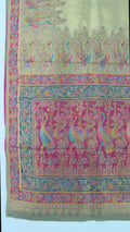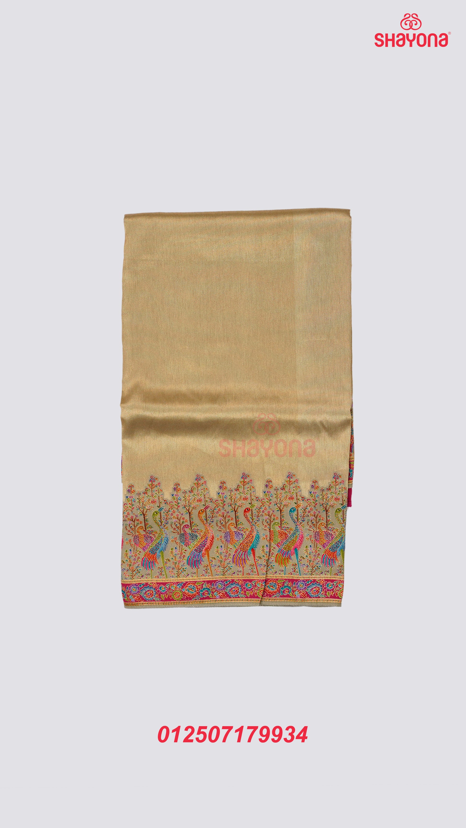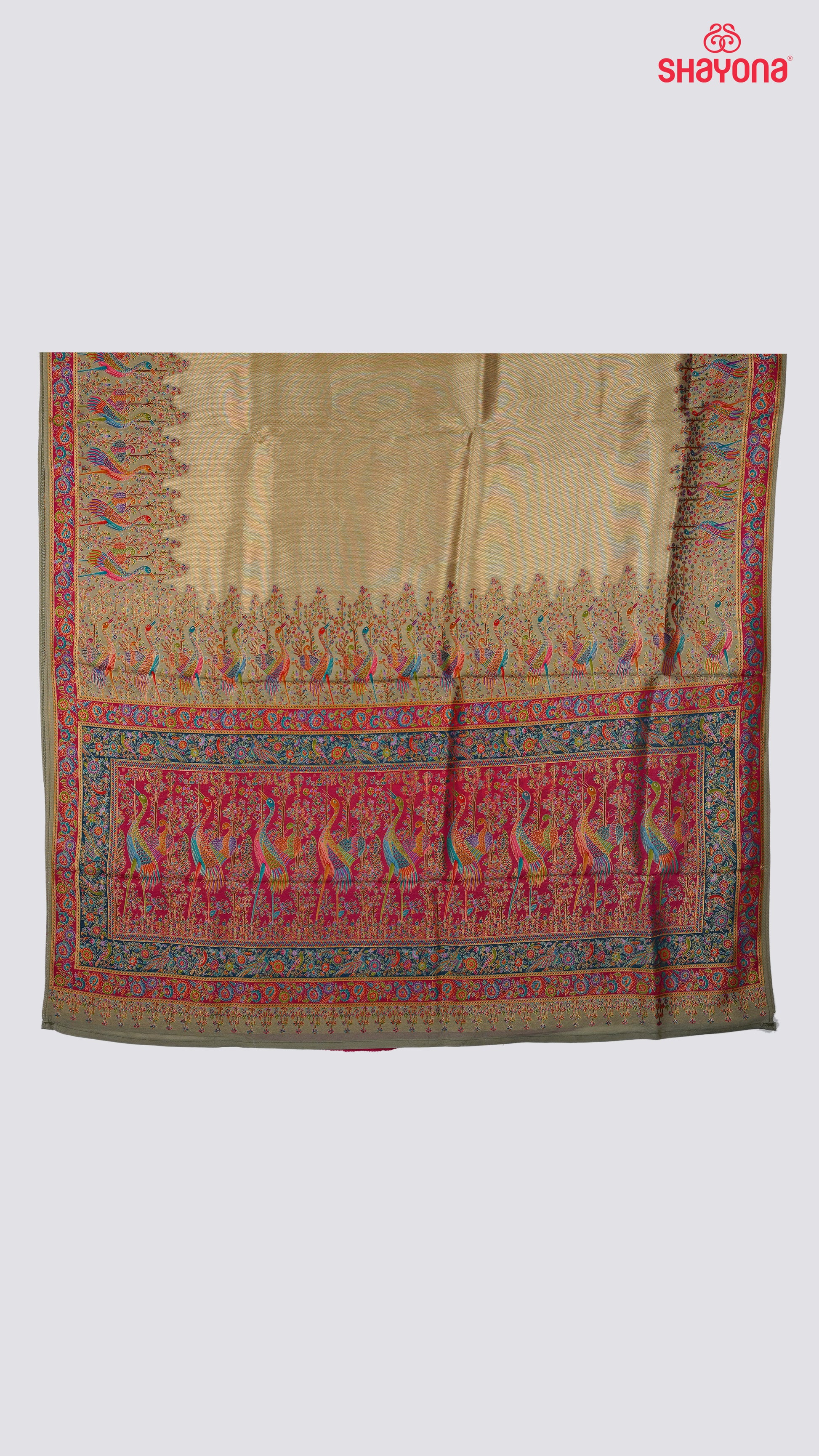 Unveil a rare blend of earthy elegance and artistic finesse with this Dark Sage Green Tissue Art Silk Saree. Featuring a serene Plain Gala (body), the saree is elevated with a nakshi-woven border and pallav showcasing delicate pashmina-inspired motifs of flamingos and plants.