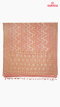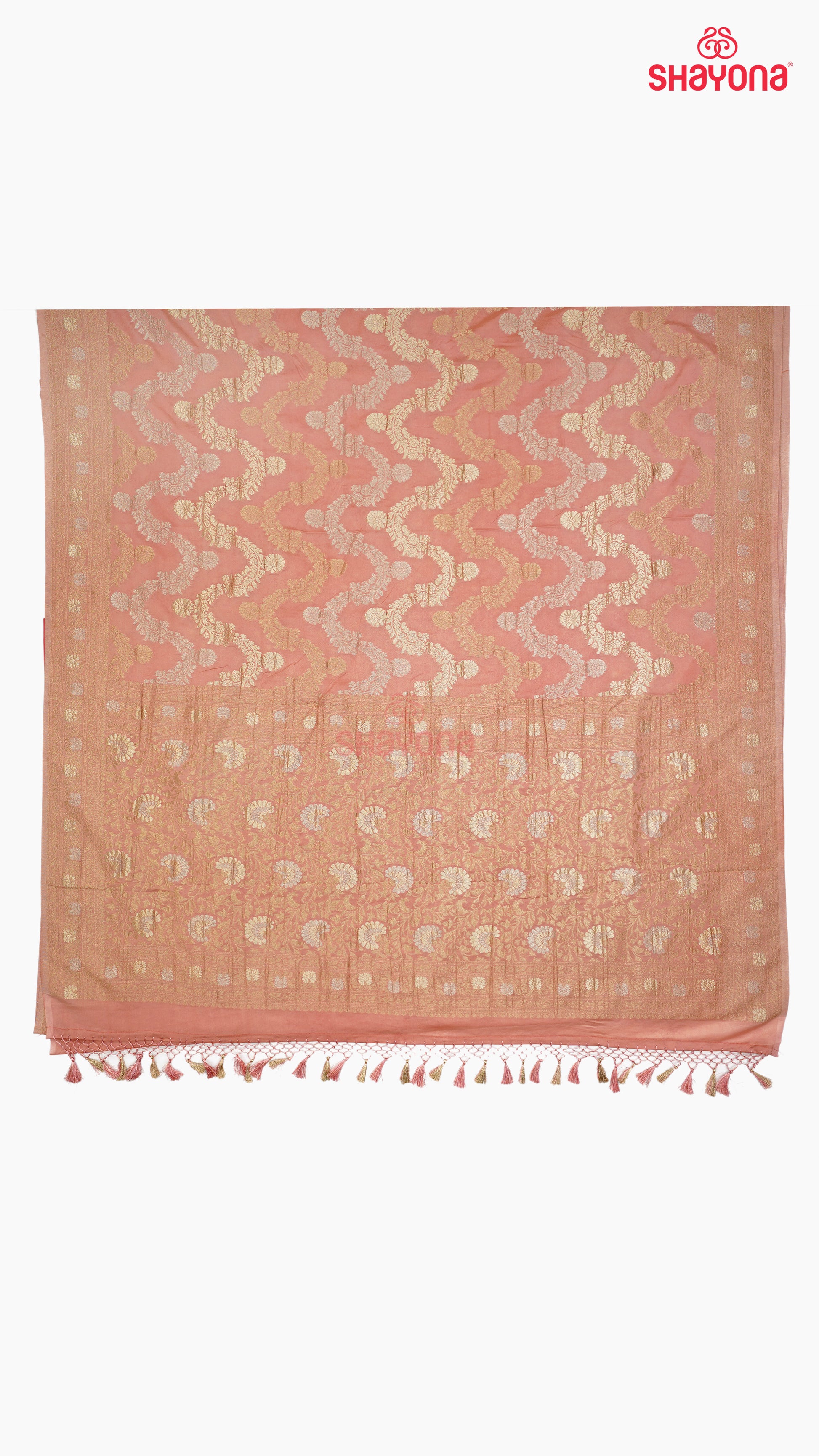 Embrace refined tradition with this Light Rose Gold coloured Banarasi Georgette Khaddi Print Saree, a symbol of timeless charm and artisanal craftsmanship. Woven in soft silk georgette, this 5.50-meter saree features a luxurious all-over jaal design that gracefully envelopes the drape.