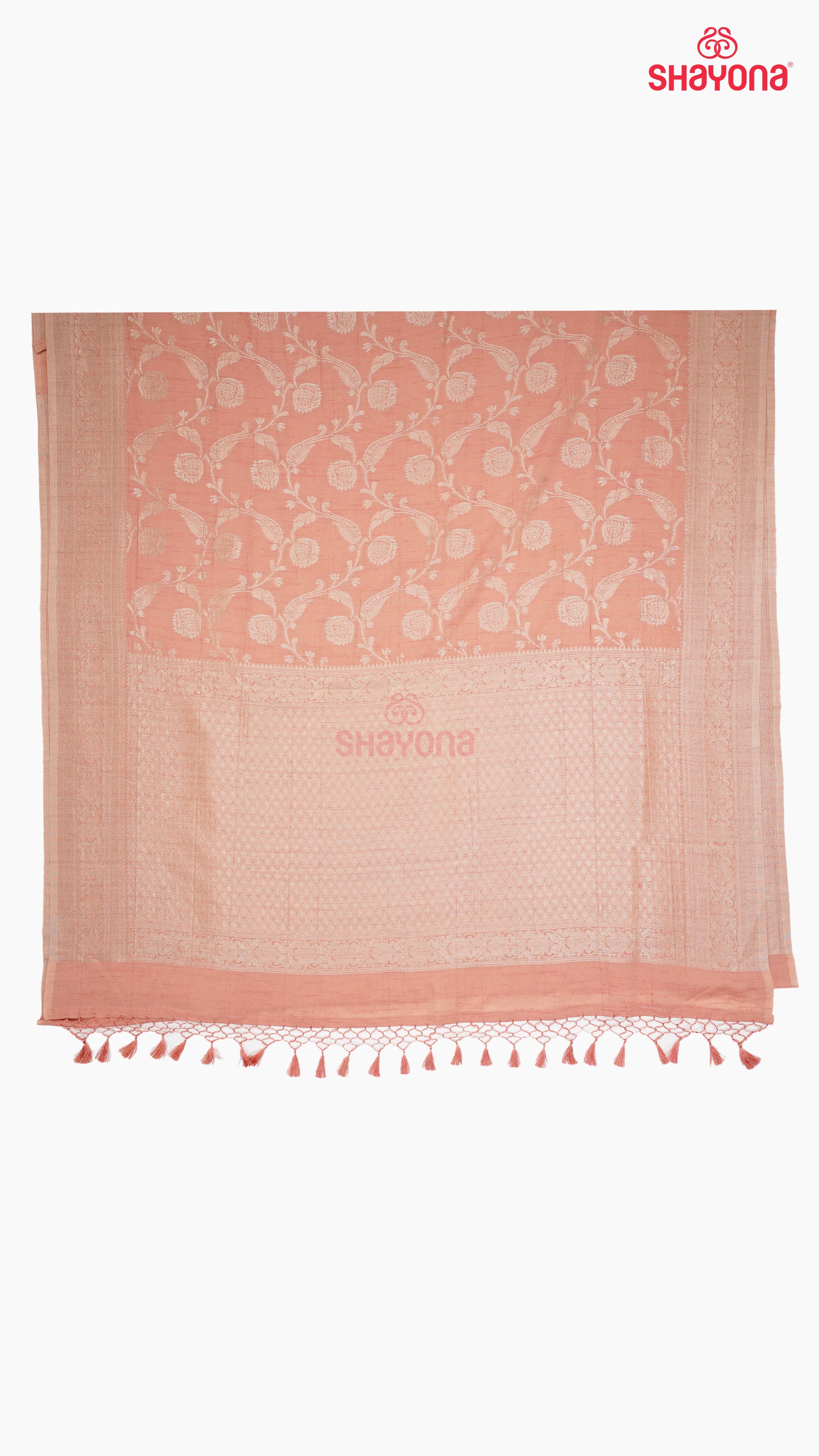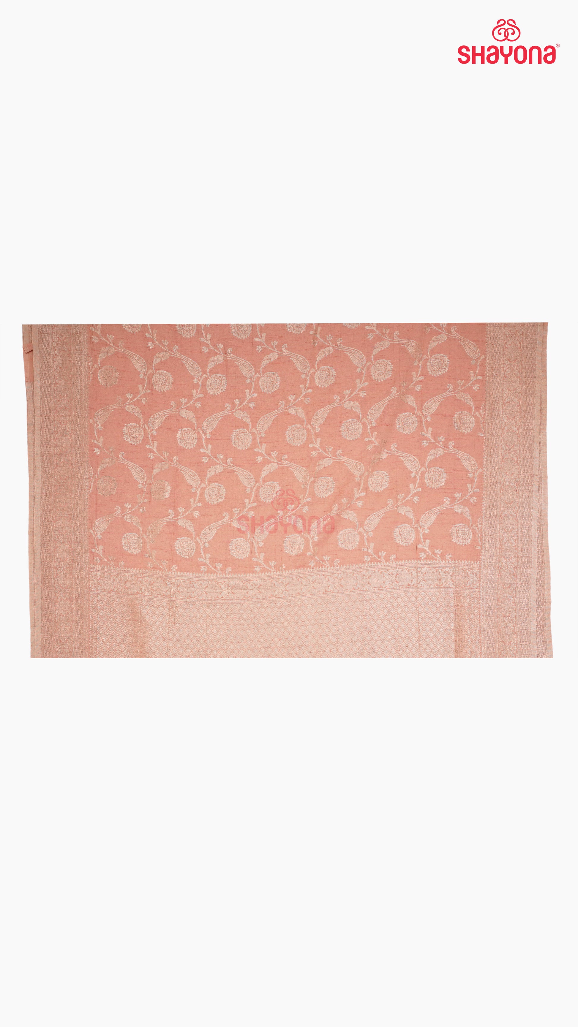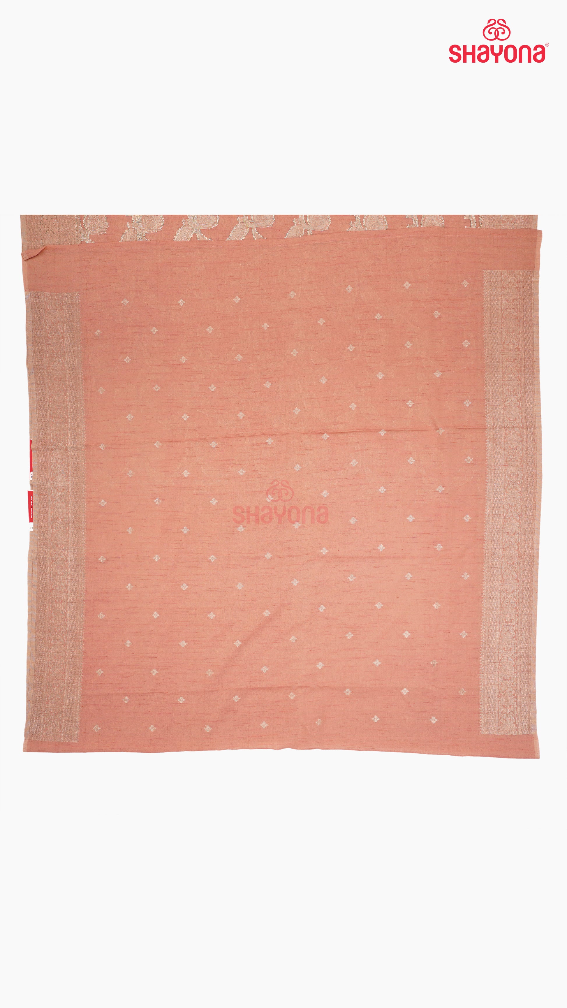 Radiate timeless grace with this Light Rose Gold coloured Banarasi Georgette Khaddi Print Saree, crafted for the modern woman who treasures tradition. The saree features an exquisite all-over jaal weave that adds depth and sophistication, while the nakshi border brings an elegant artisanal touch.