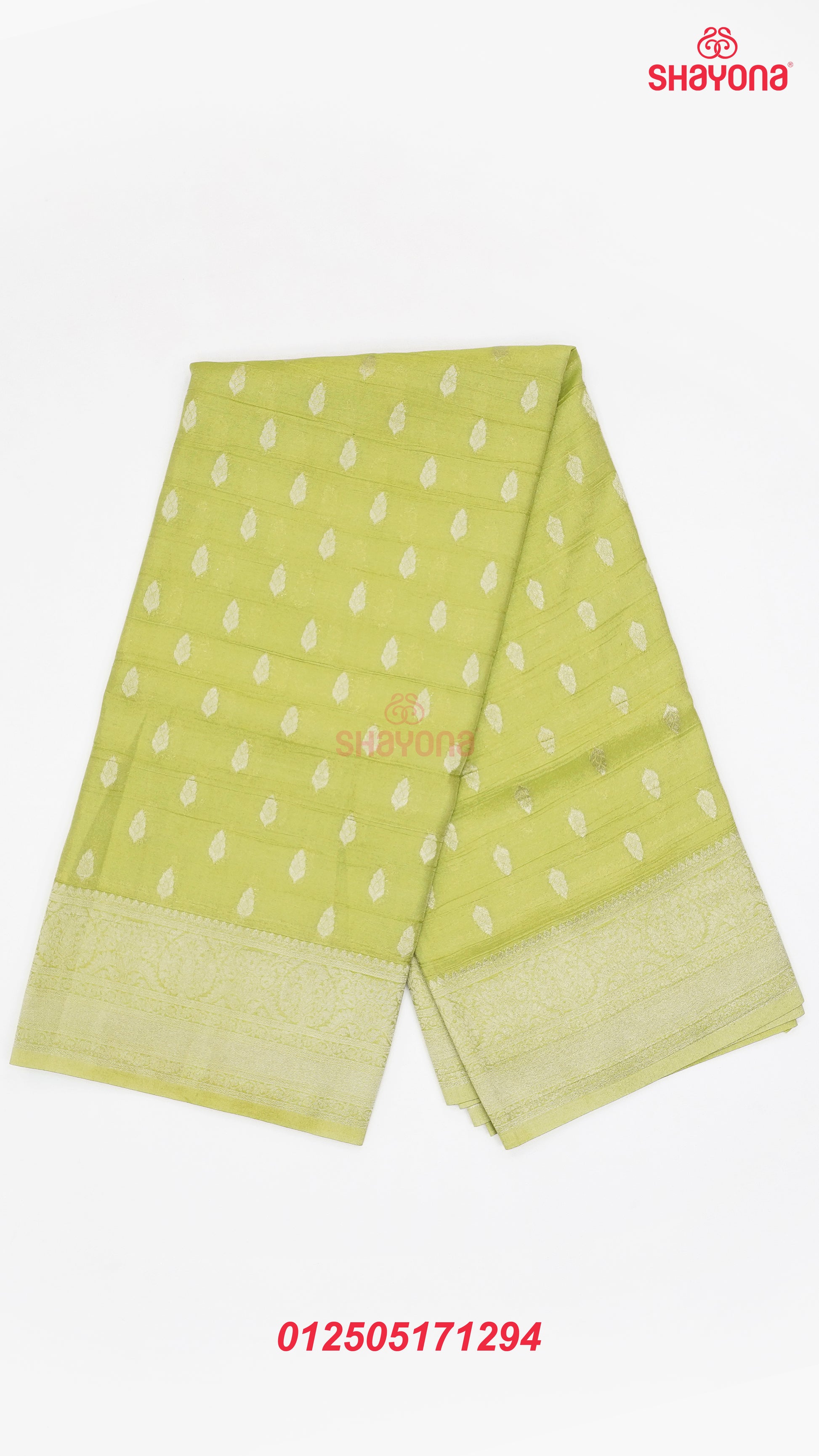Drape yourself in understated grandeur with this Olive-coloured Banarasi Georgette Khaddi Print Soft Silk Saree, crafted to embody timeless grace. The saree features elegant all-over Butti Gala motifs and is complemented by an exquisite Jaal-style Nakshi border, making it a perfect blend of tradition and finesse. The richly woven heavy pallav elevates its royal appeal.