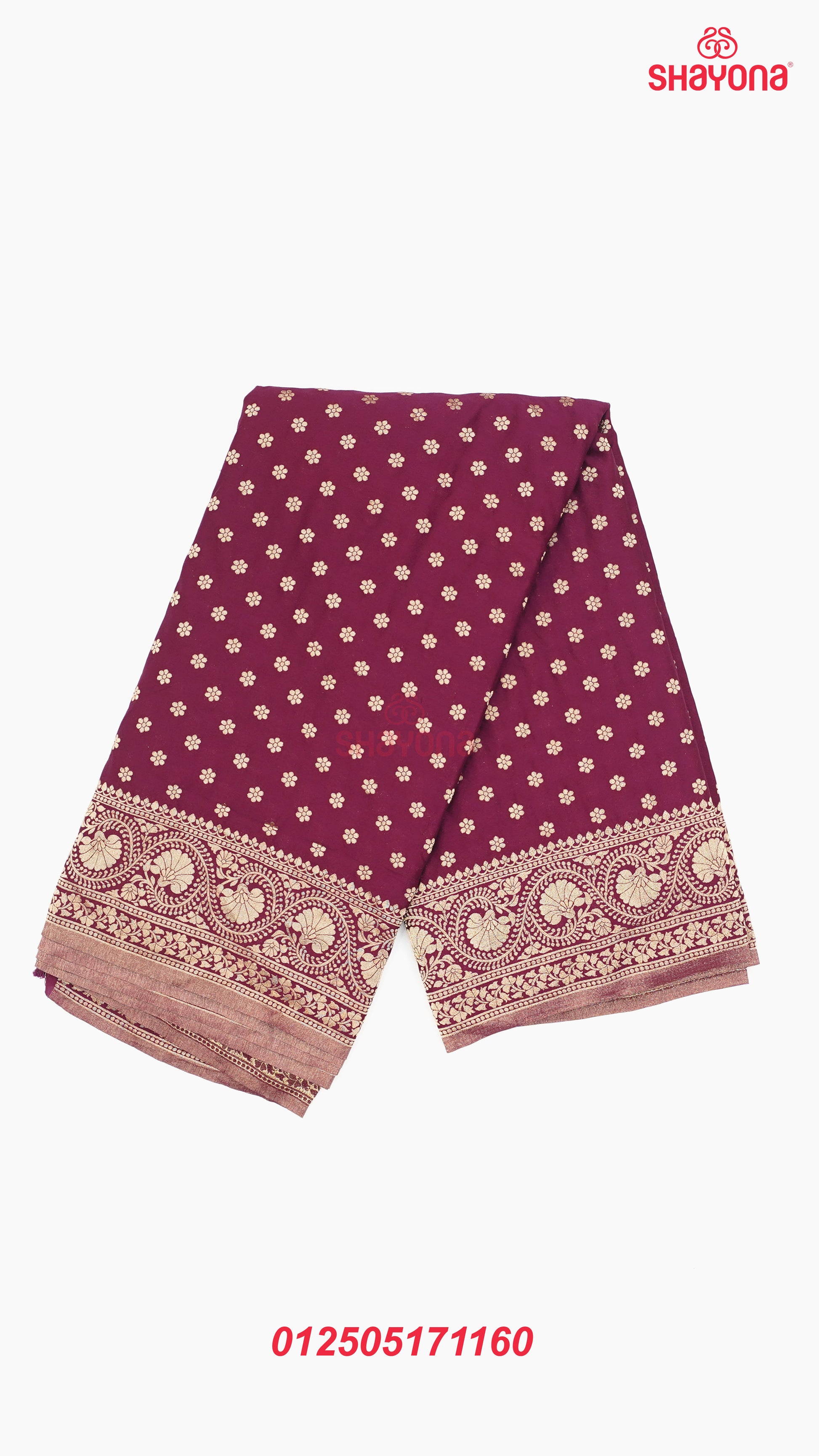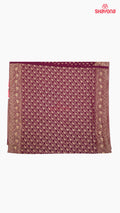 Grace your special occasions with the regal charm of this Wine-Coloured Banarasi Georgette Khaddi Print Saree, an elegant blend of tradition and fine craftsmanship. Woven in soft-flowing georgette, this 5.50-meter saree features all-over golden zari butti detailing, beautifully enriched with a delicate jaal weave that adds depth and texture.