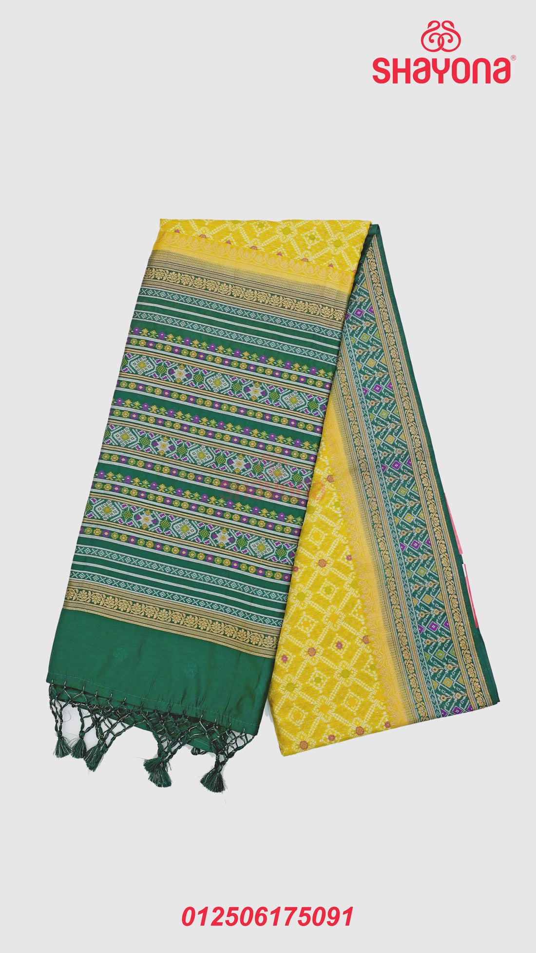 Yellow Gold & Dark Green Ghicha Art Silk Saree – Royal Weave in Earthy Tones