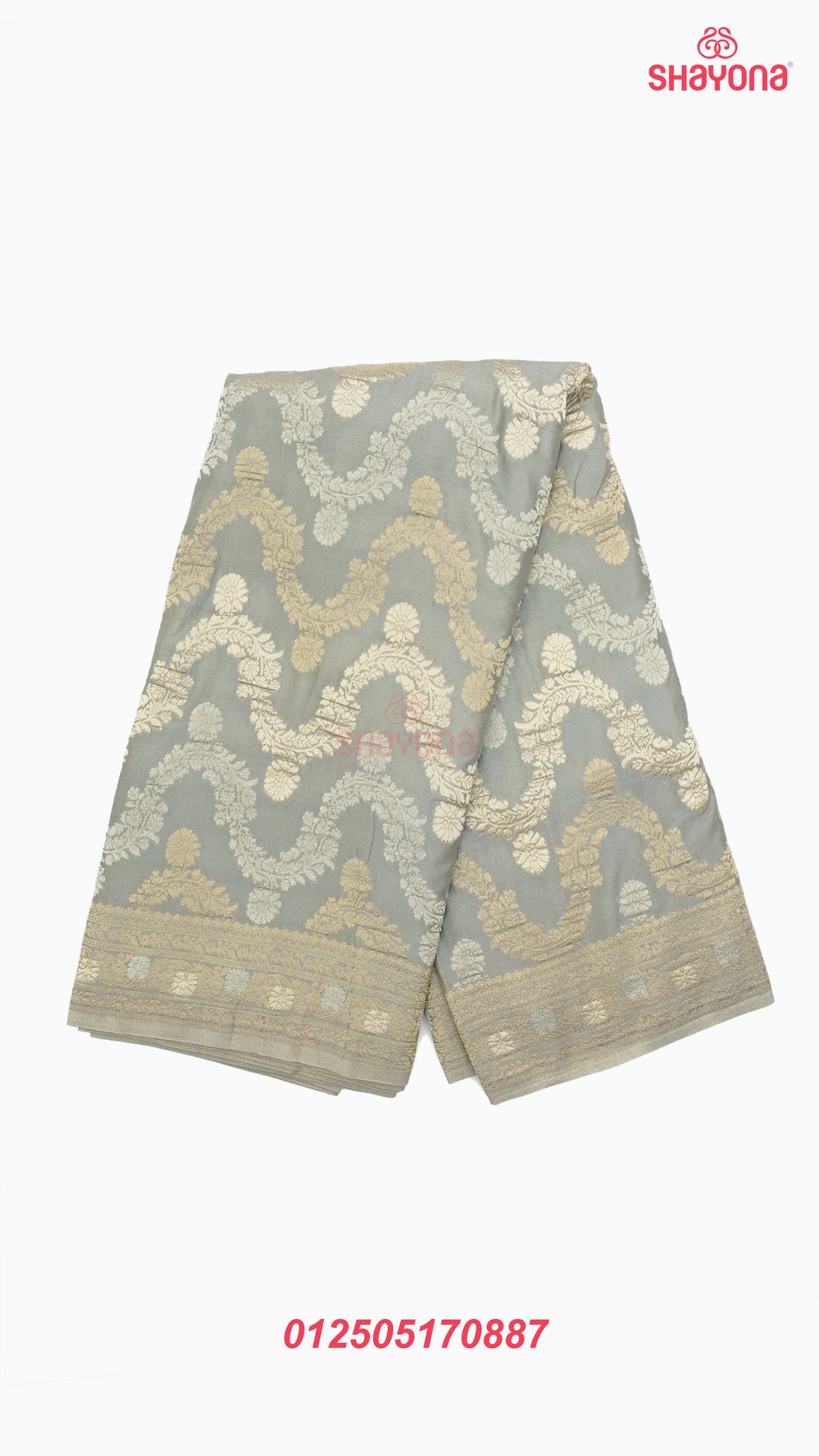 Product Description: Elegance meets tradition in this stunning Gray Banarasi Georgette Khaddi Print Saree, crafted...