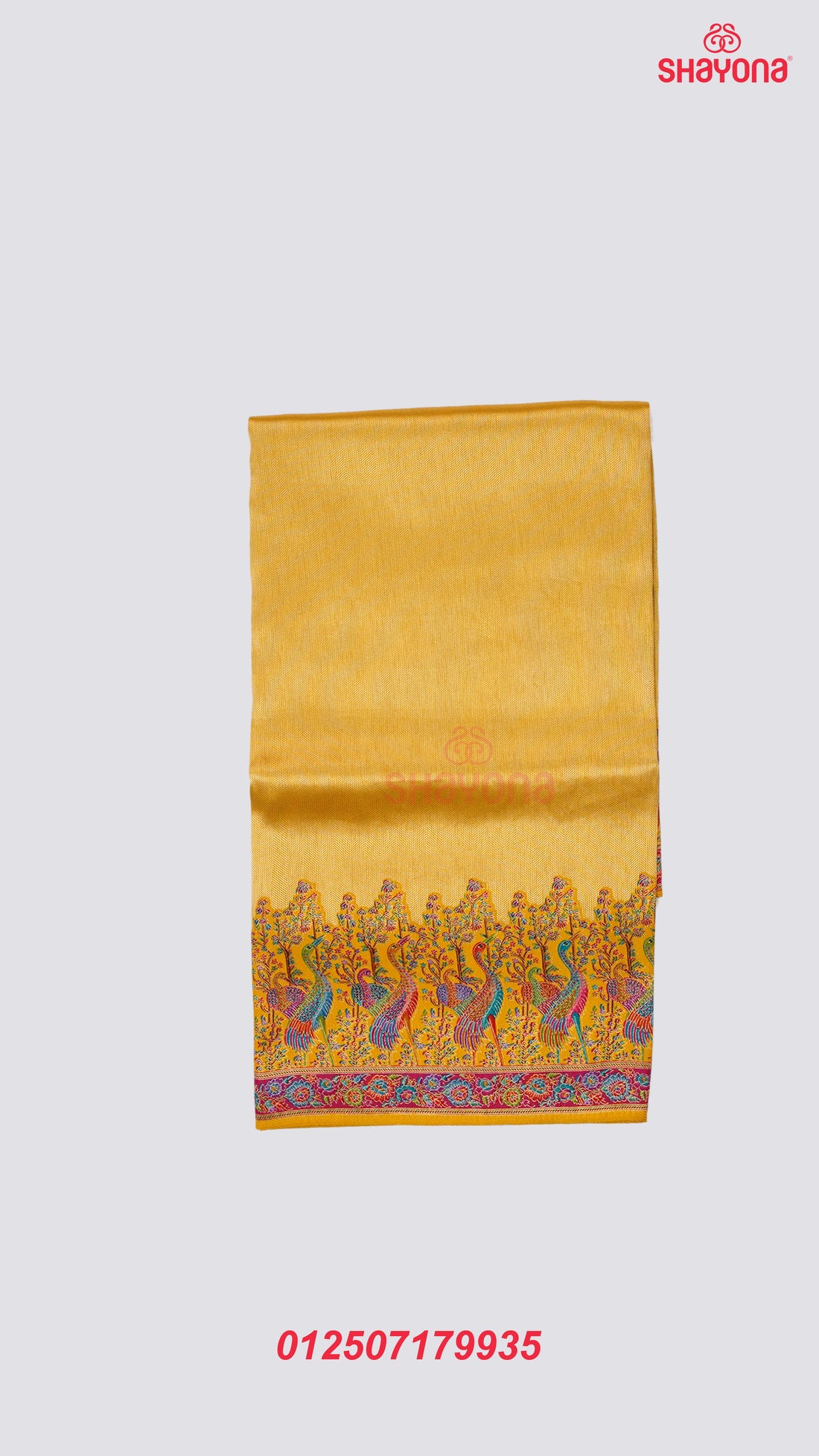Product Description: Embrace radiant tradition with this Mustard coloured Weaved Tissue Art Silk Saree, exquisitely...