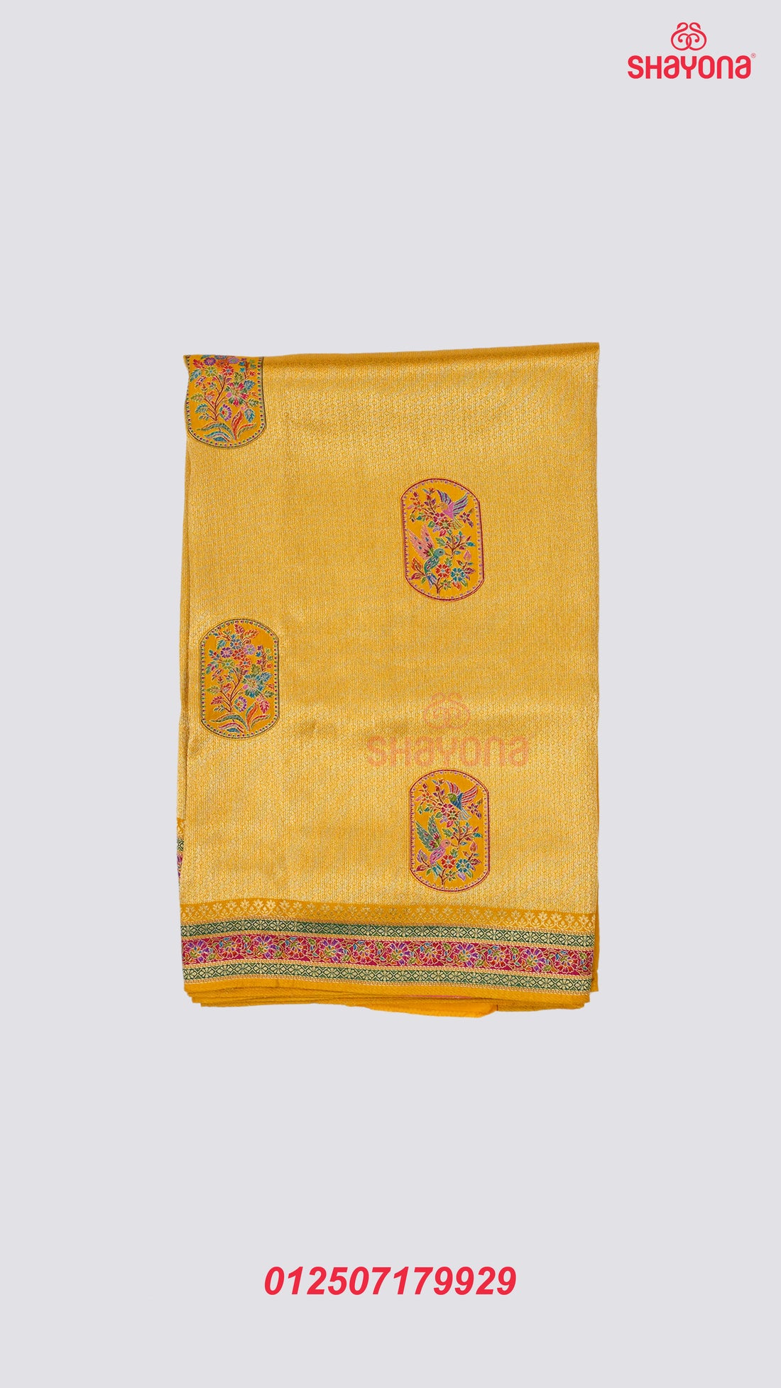 Product Description: Drape yourself in royal elegance with this Yellow Gold coloured Banarasi Georgette Khaddi...