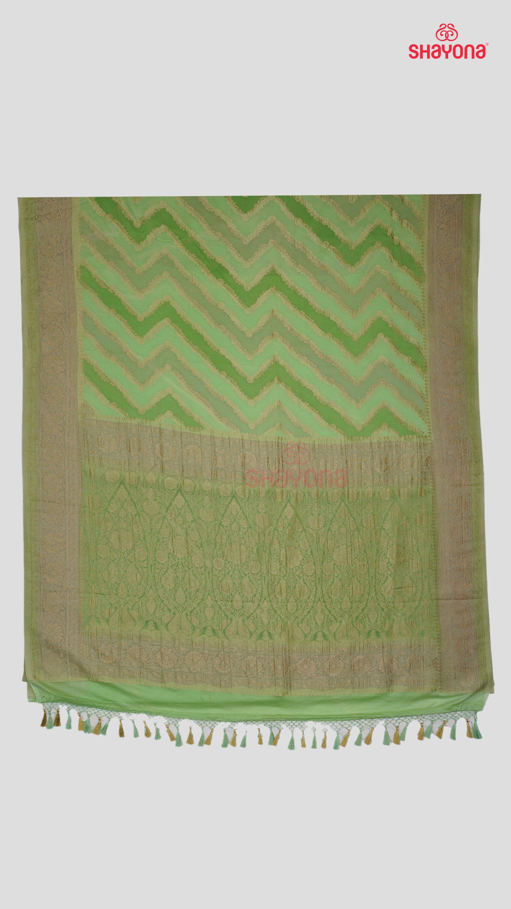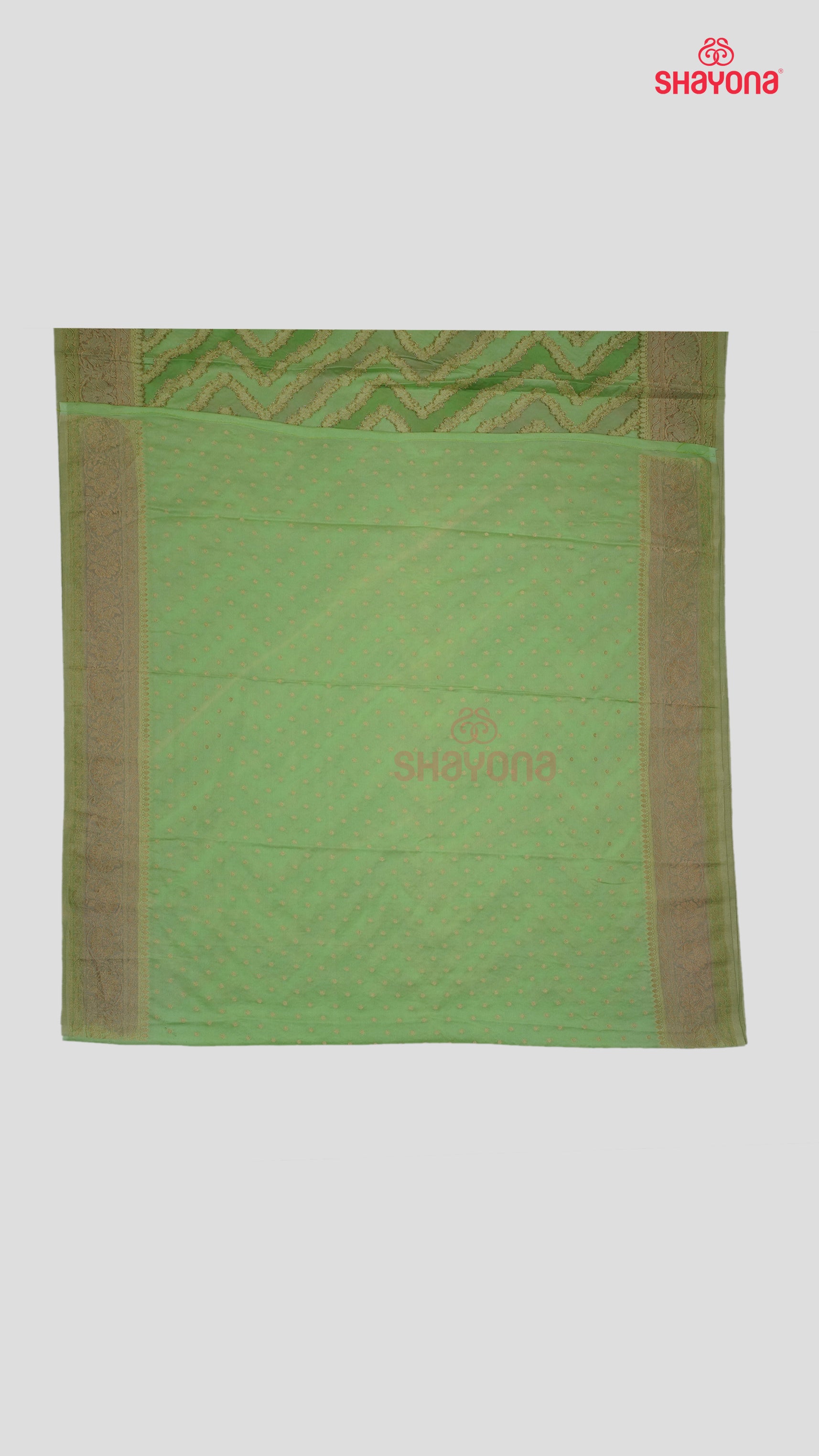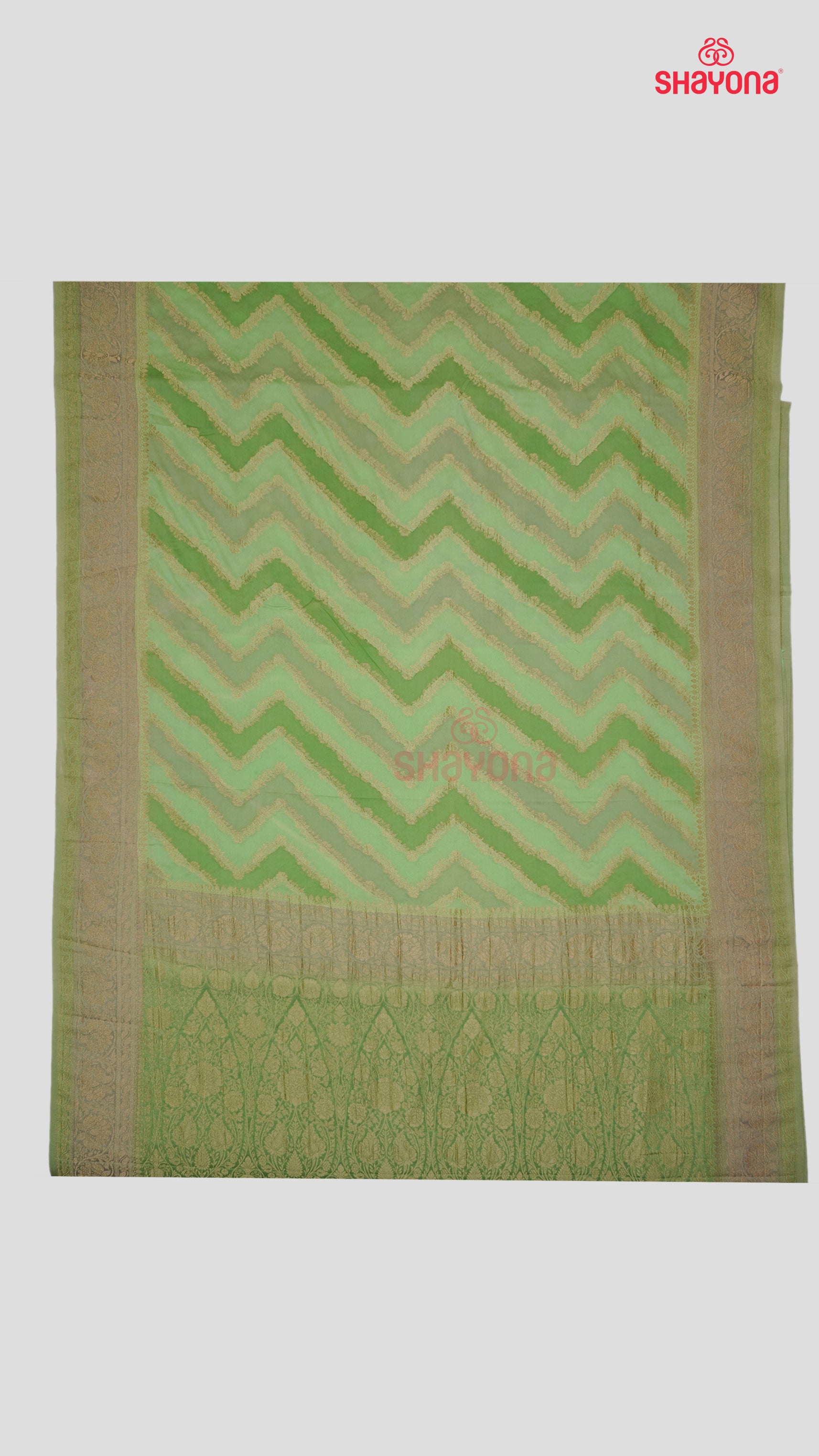 Light Olive Banarasi Georgette Khaddi Soft Silk Saree with Lehariya Gala, All Over Butti Weave, Jaal Nakshi Border & Heavy Pallav