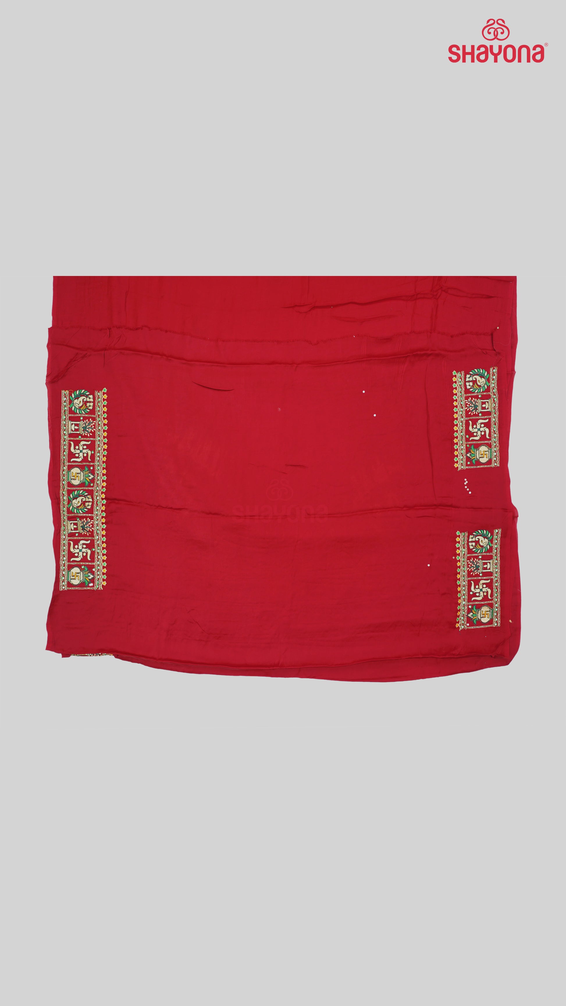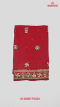 Immerse yourself in sacred tradition with this Maroon Pure Gajji Silk Gharchola Saree, measuring 5.50 meters in length and paired with a plain & border blouse of 0.80 meters. Crafted from luxurious Gajji silk, this saree is adorned with heavy handwork and intricate embroidery featuring auspicious figures like Swastik, Saptapadi, Elephant, Shri Ganesh, Kalash, and more — symbolic of divine blessings and sacred beginnings.