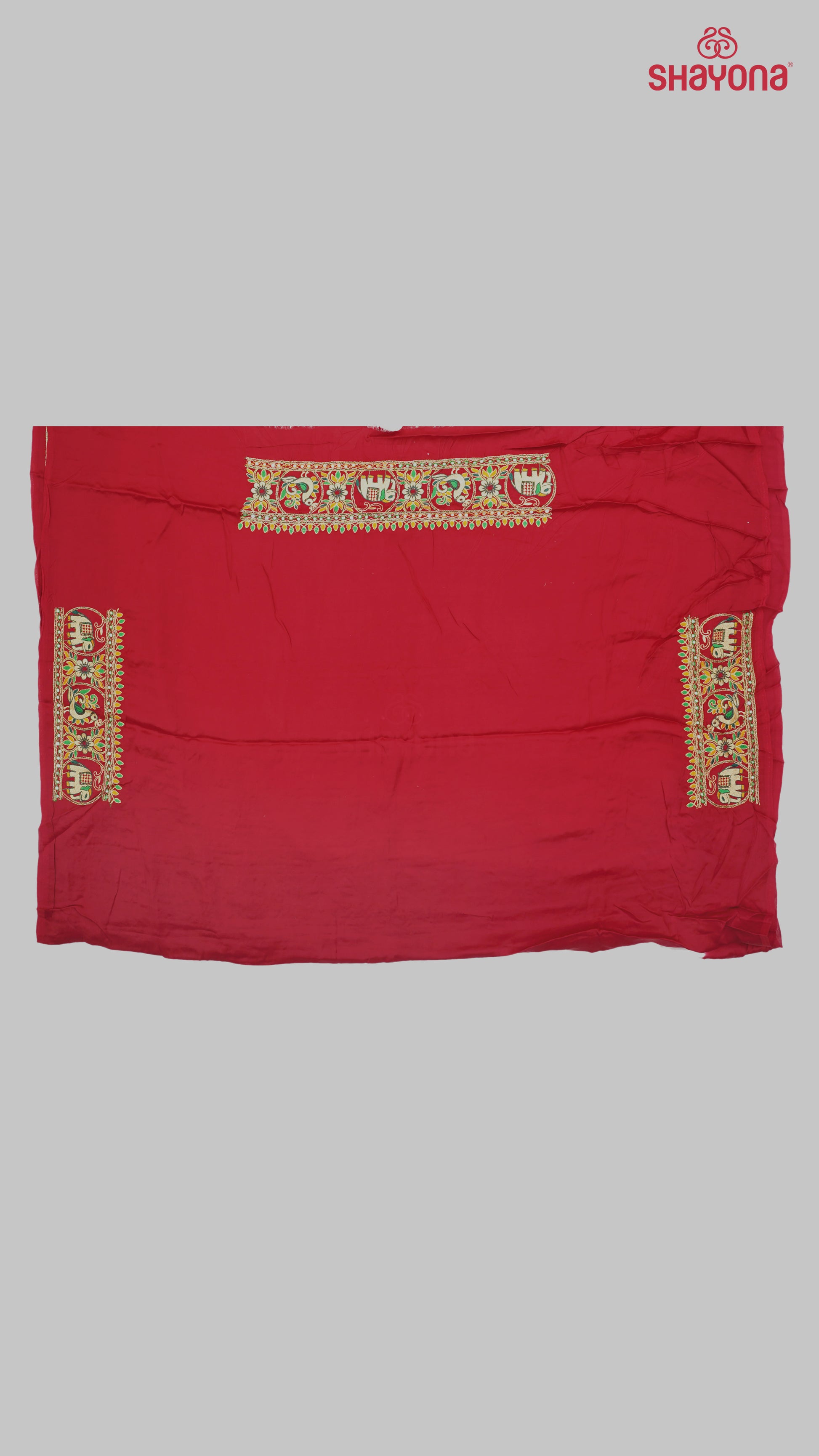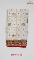 Intricately hand-embroidered, the saree features heavy embroidery work of buttis and buttas woven into gala-style checks, embellished with figures of Bride-Groom performing Sindoordaan, Elephant, Sarnai, Dhol, and Tabla. Each motif adds a symbolic essence of Indian weddings, making this saree a heritage statement for bridal occasions, cultural events, and festive celebrations. The nakshi border and pallav enhance the saree’s grandeur with detailed artistry.