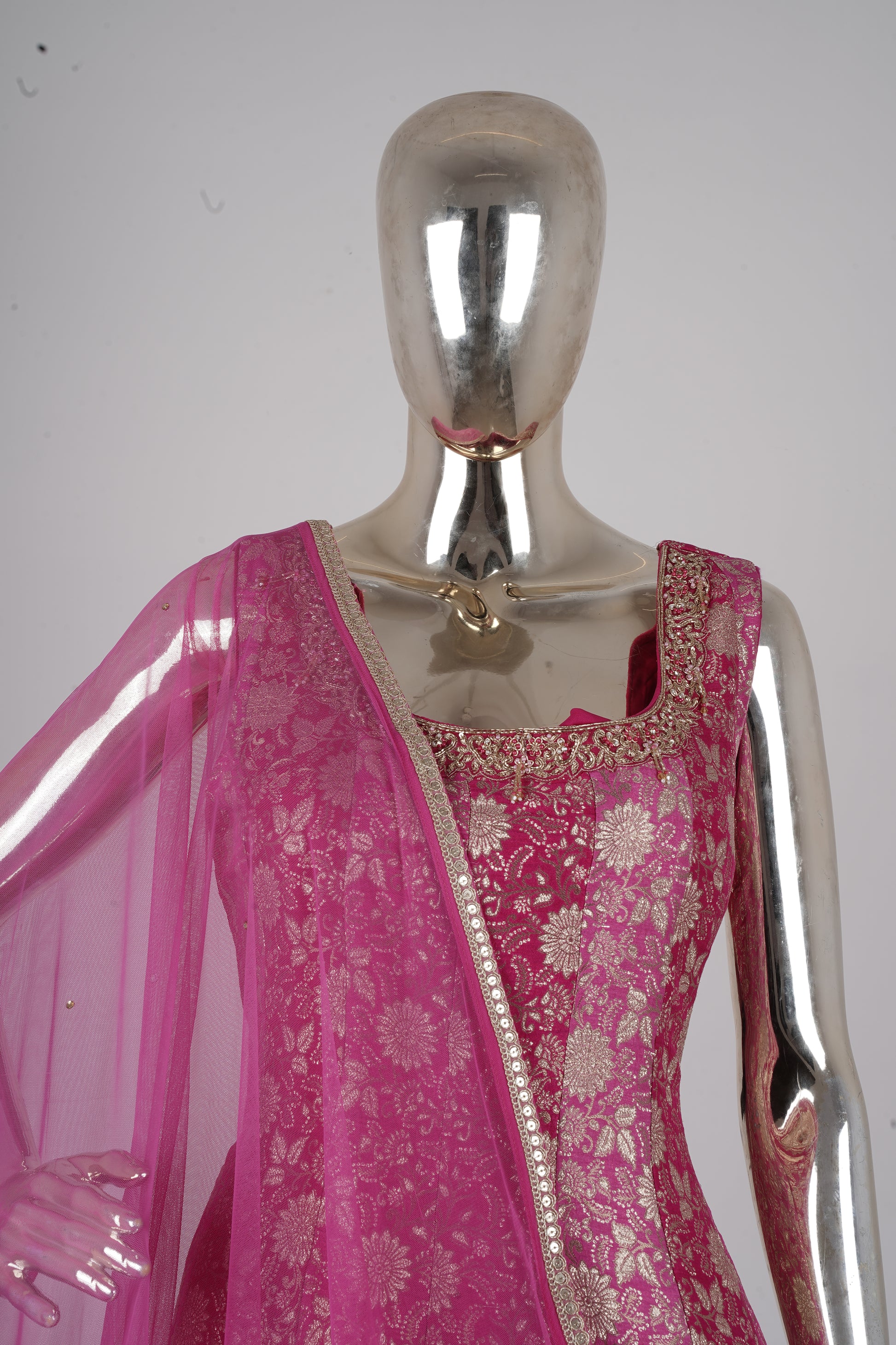 This outfit is crafted using traditional Banarasi weaving techniques, where skilled artisans create intricate zari patterns on silk fabric. The weaving process involves fine threads and detailed craftsmanship, ensuring durability and luxurious texture.