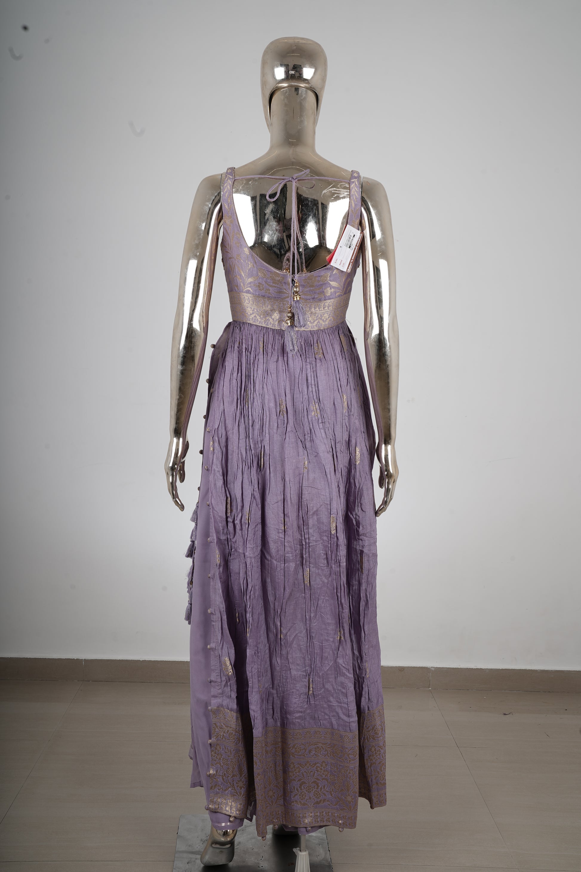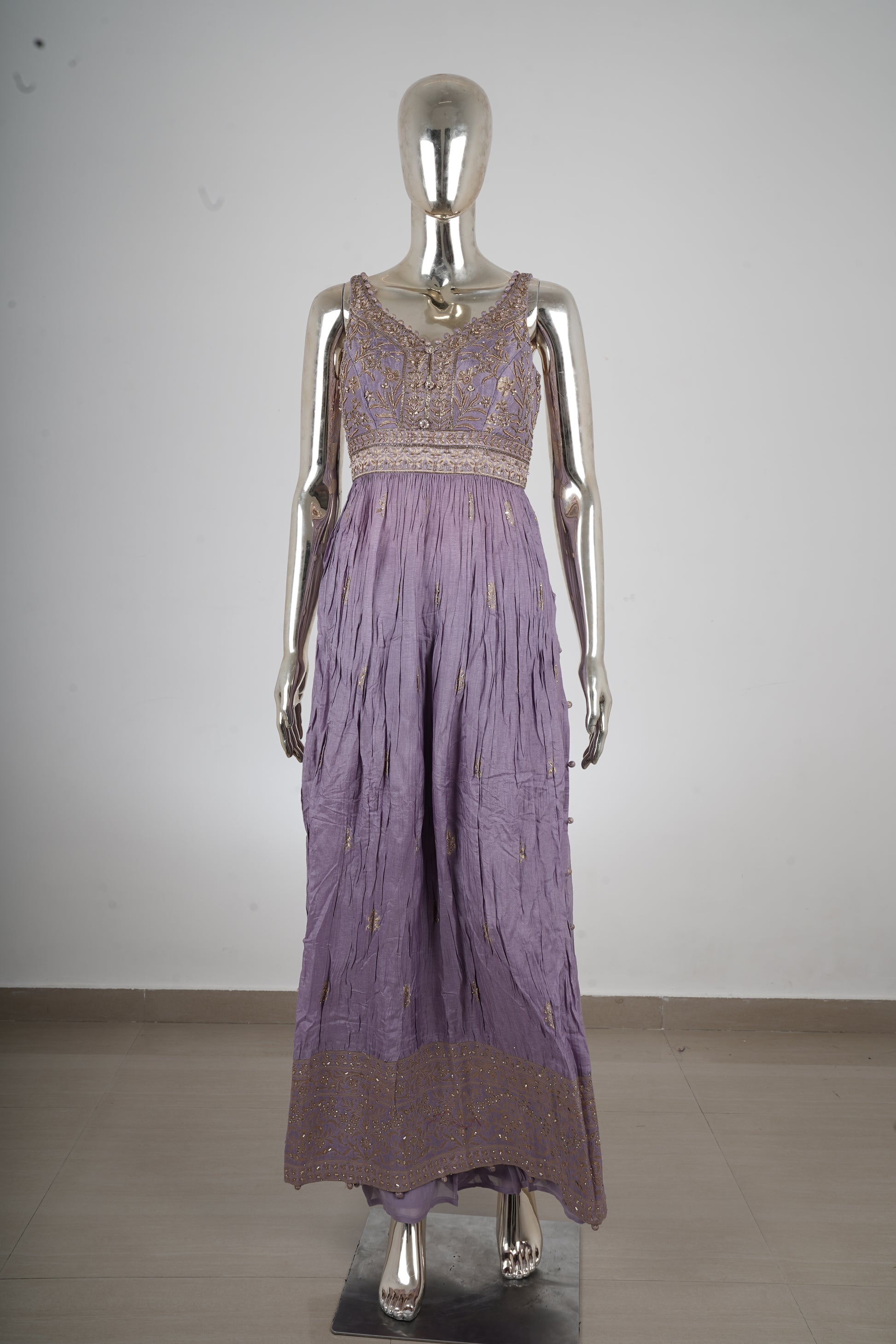 Step into timeless elegance with this lavender Anarkali set, crafted to exude grace and sophistication. The soothing pastel tone paired with intricate zari embroidery makes this ensemble a perfect blend of tradition and modern charm.