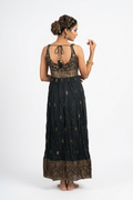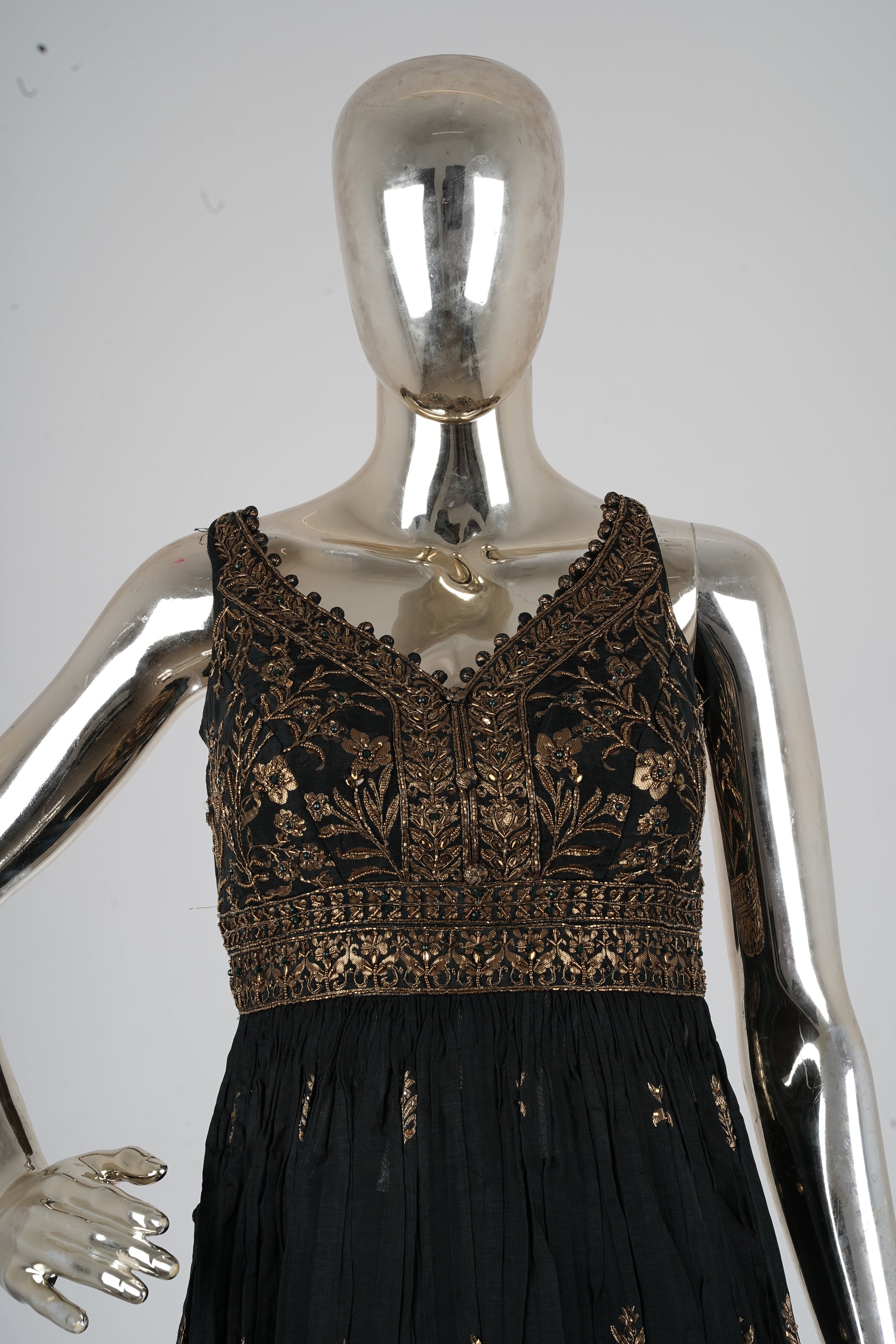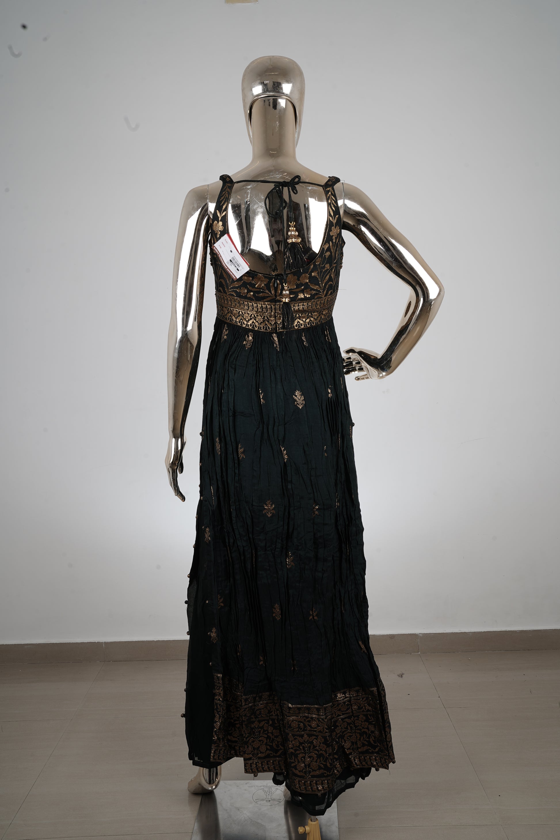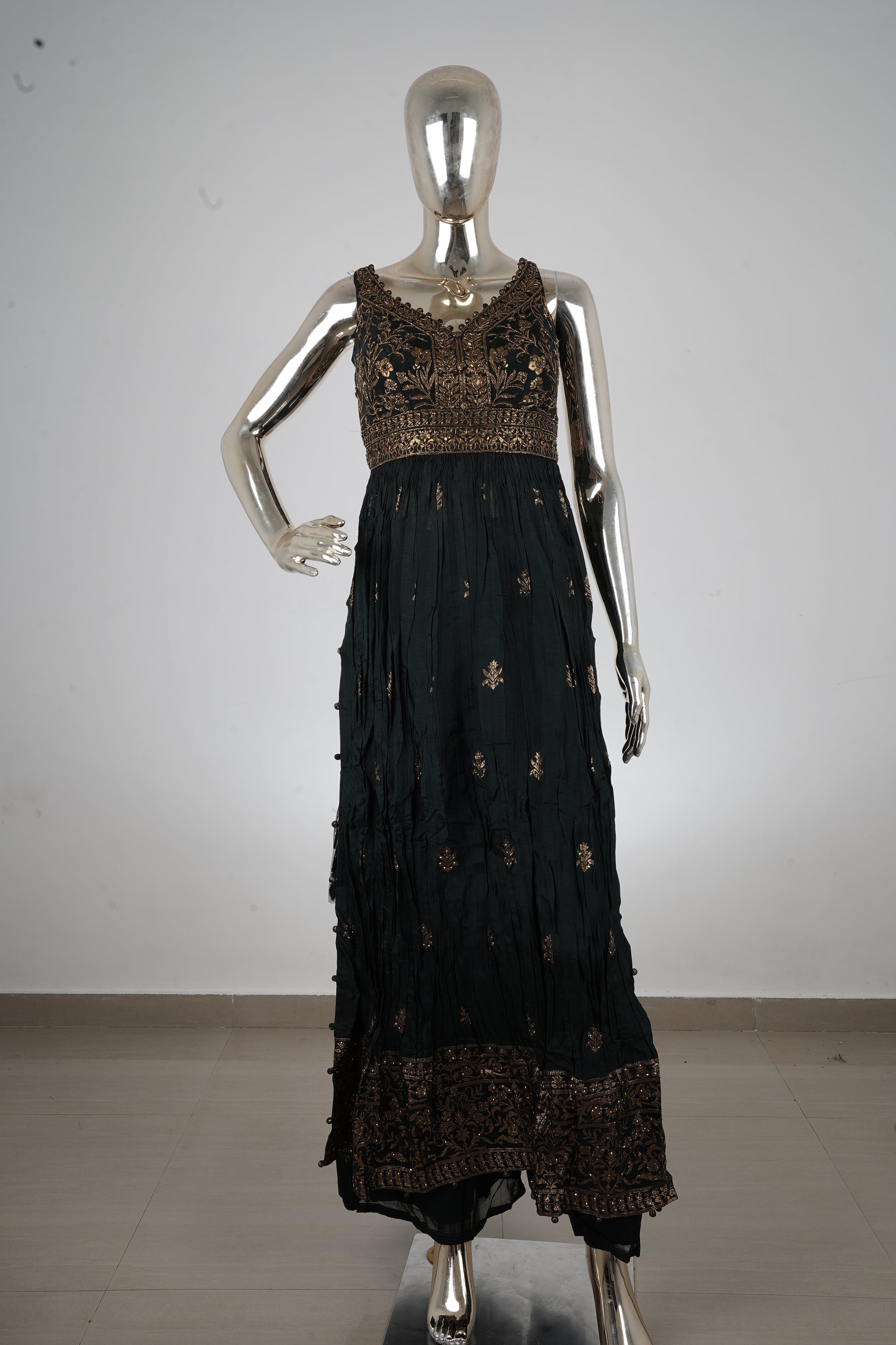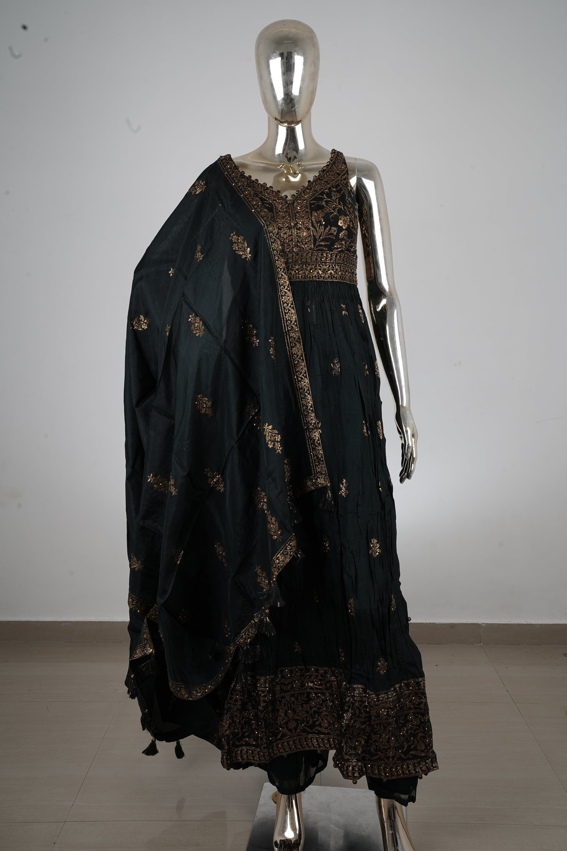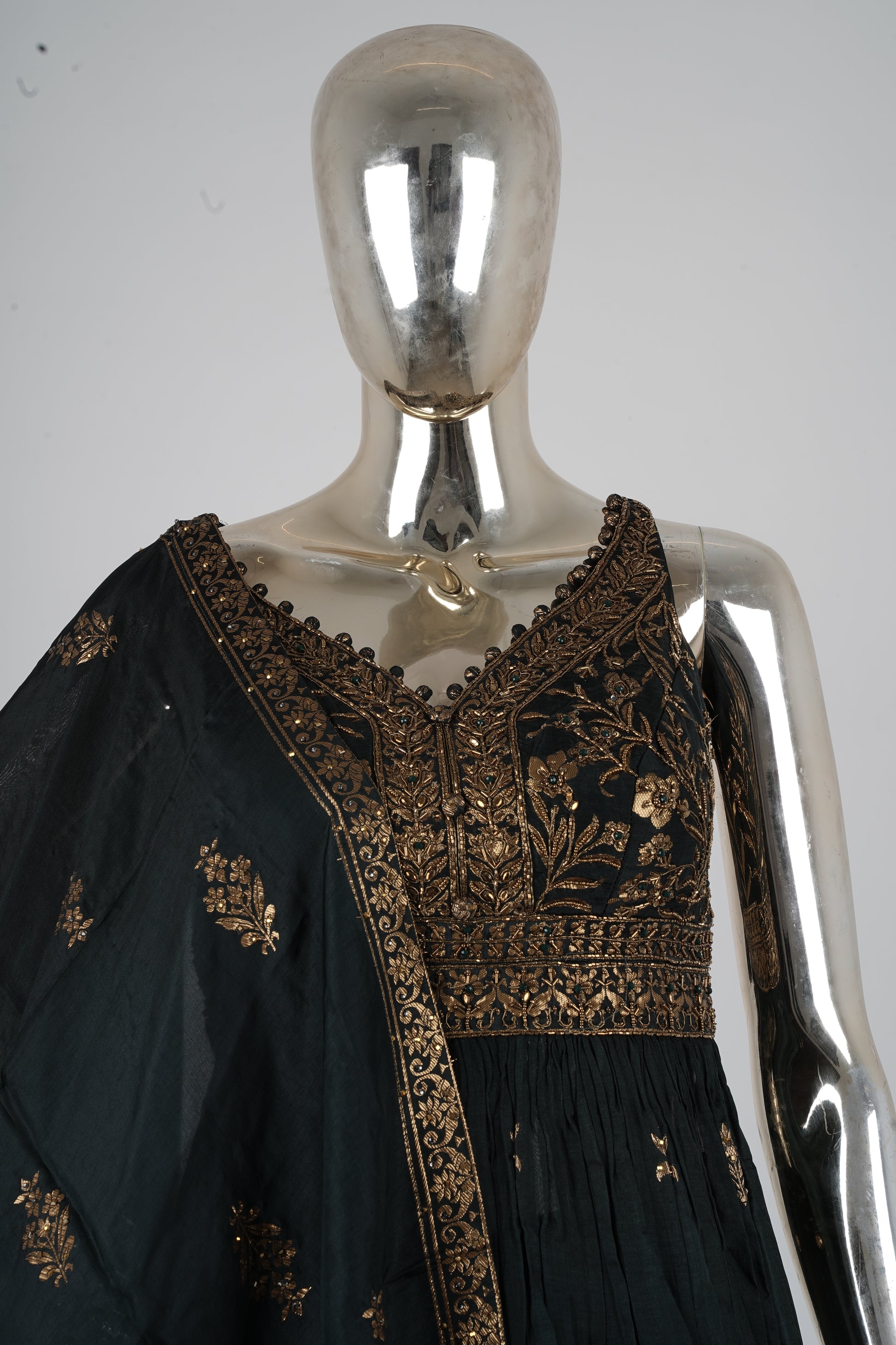 Drape yourself in timeless luxury with this midnight teal Anarkali set, designed to make a bold yet graceful statement. The deep, rich hue paired with intricate gold zari embroidery creates a regal look perfect for grand occasions.