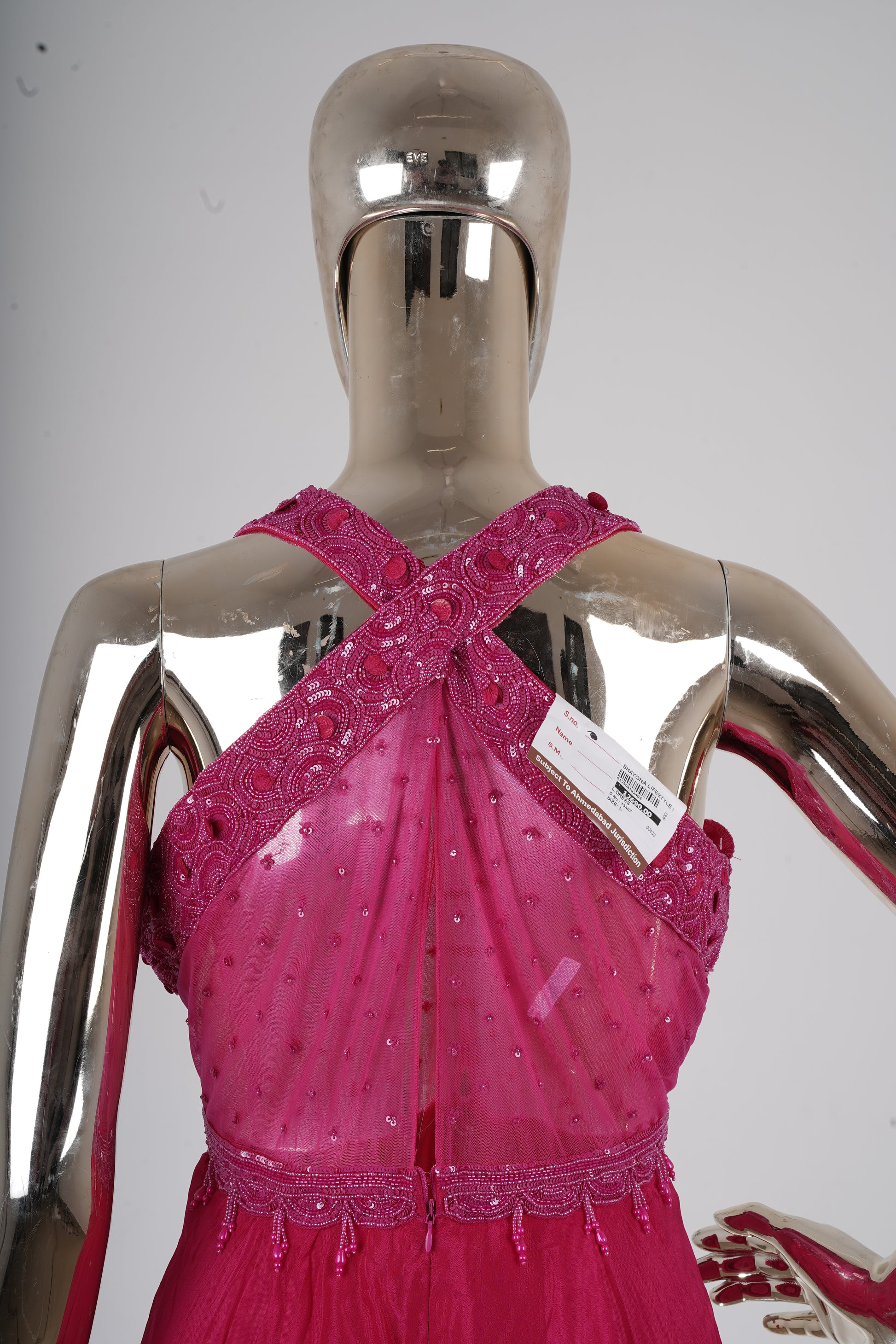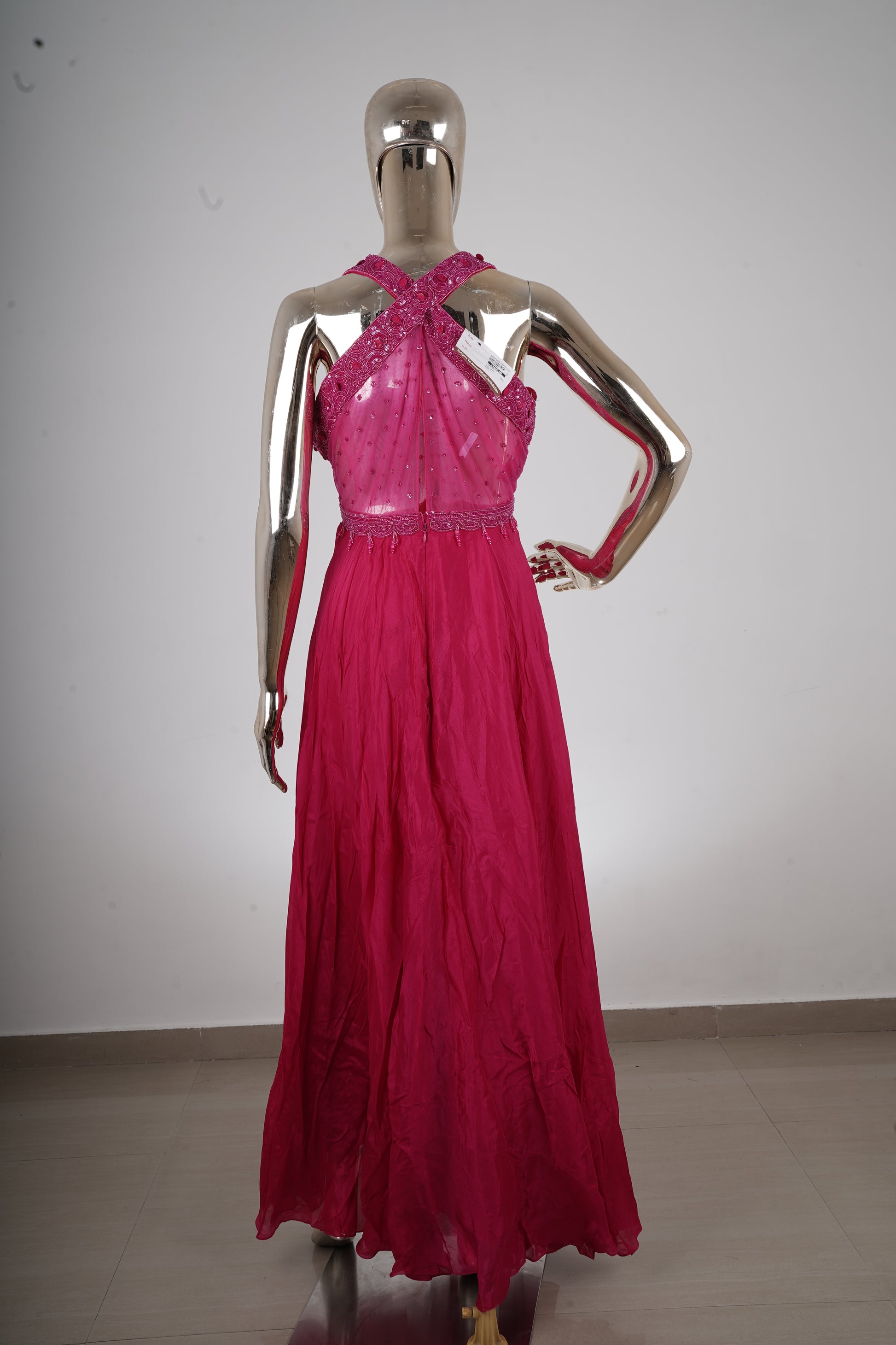 Turn heads with this stunning raspberry pink halter gown, designed to exude bold elegance and modern glamour. This outfit beautifully combines intricate embellishments with a free-flowing silhouette, making it a perfect statement piece.