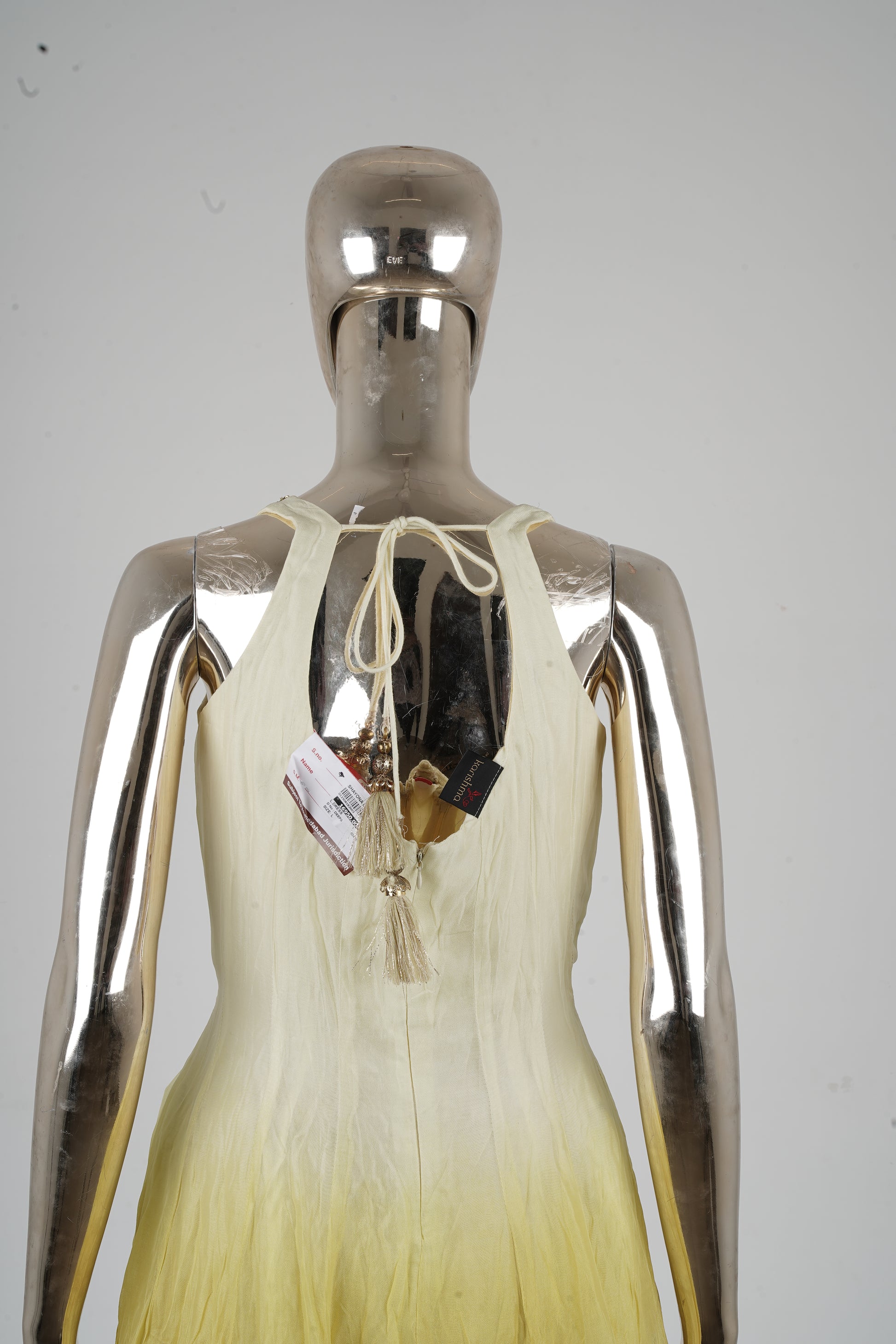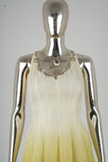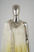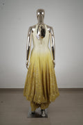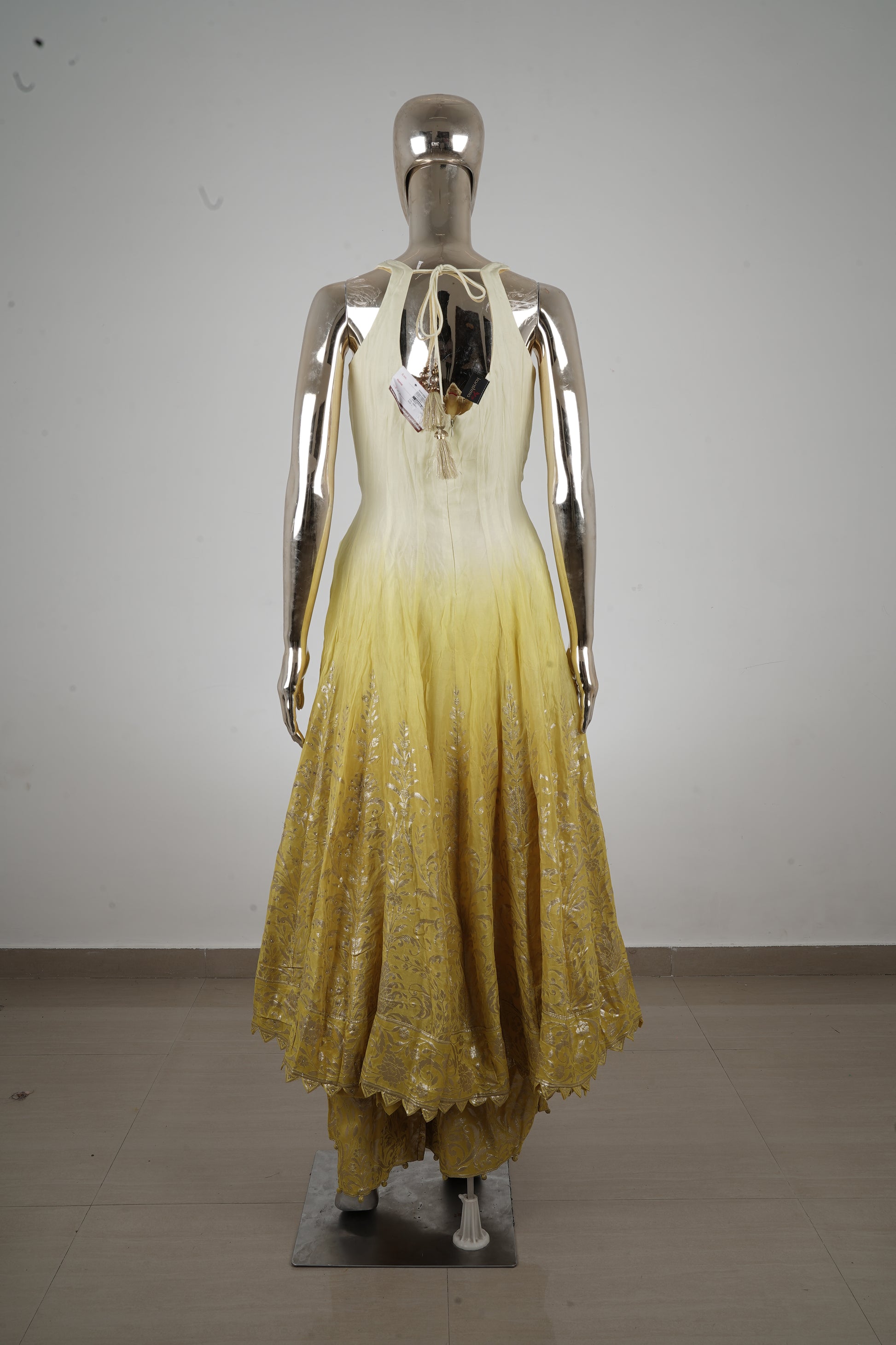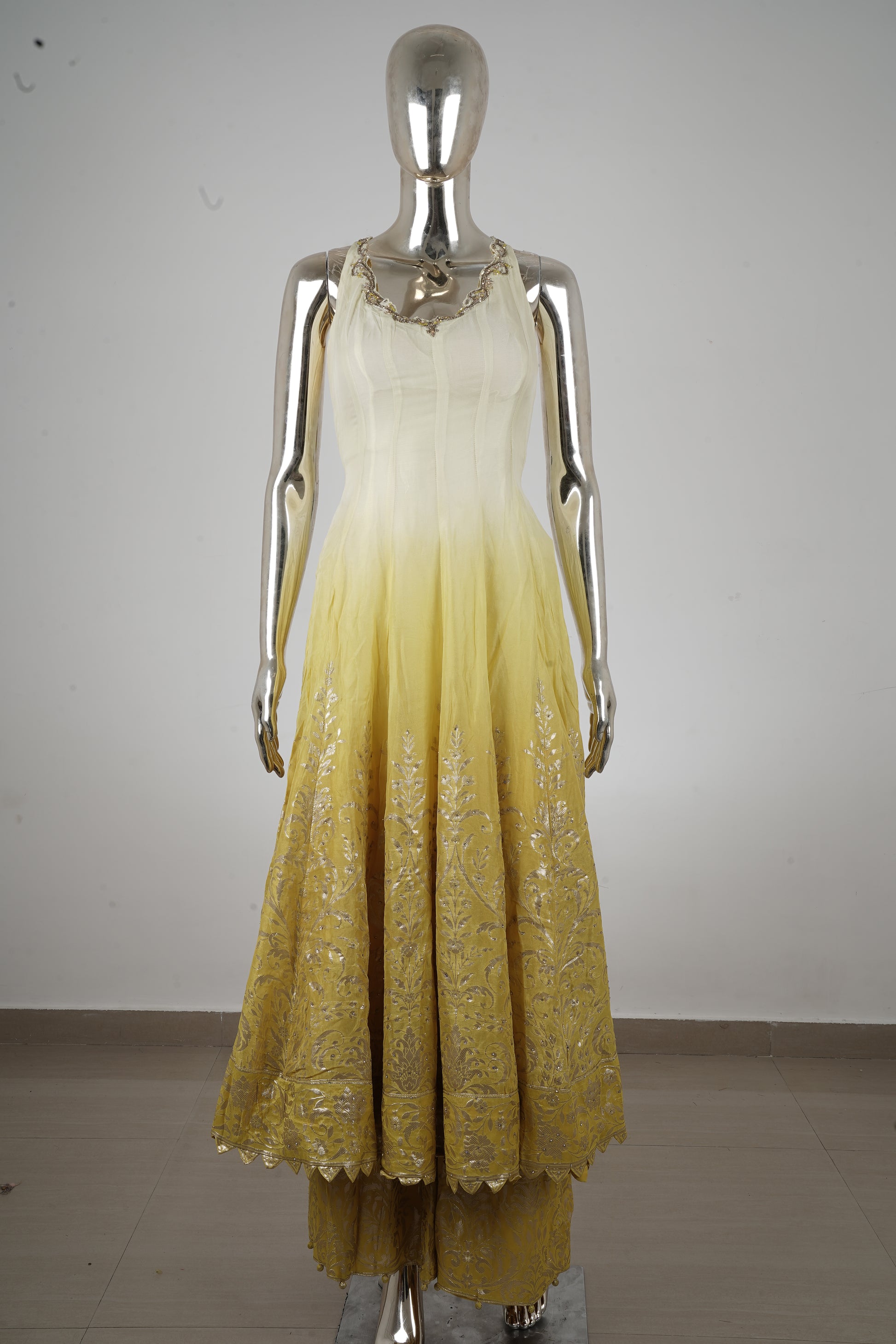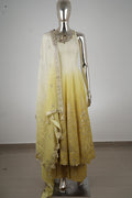 Radiate elegance with this sunshine yellow ombre Anarkali set, designed to capture the beauty of soft gradients and traditional craftsmanship. The outfit gracefully transitions from a delicate ivory tone at the top to a rich golden yellow at the hem, creating a dreamy, luminous effect.