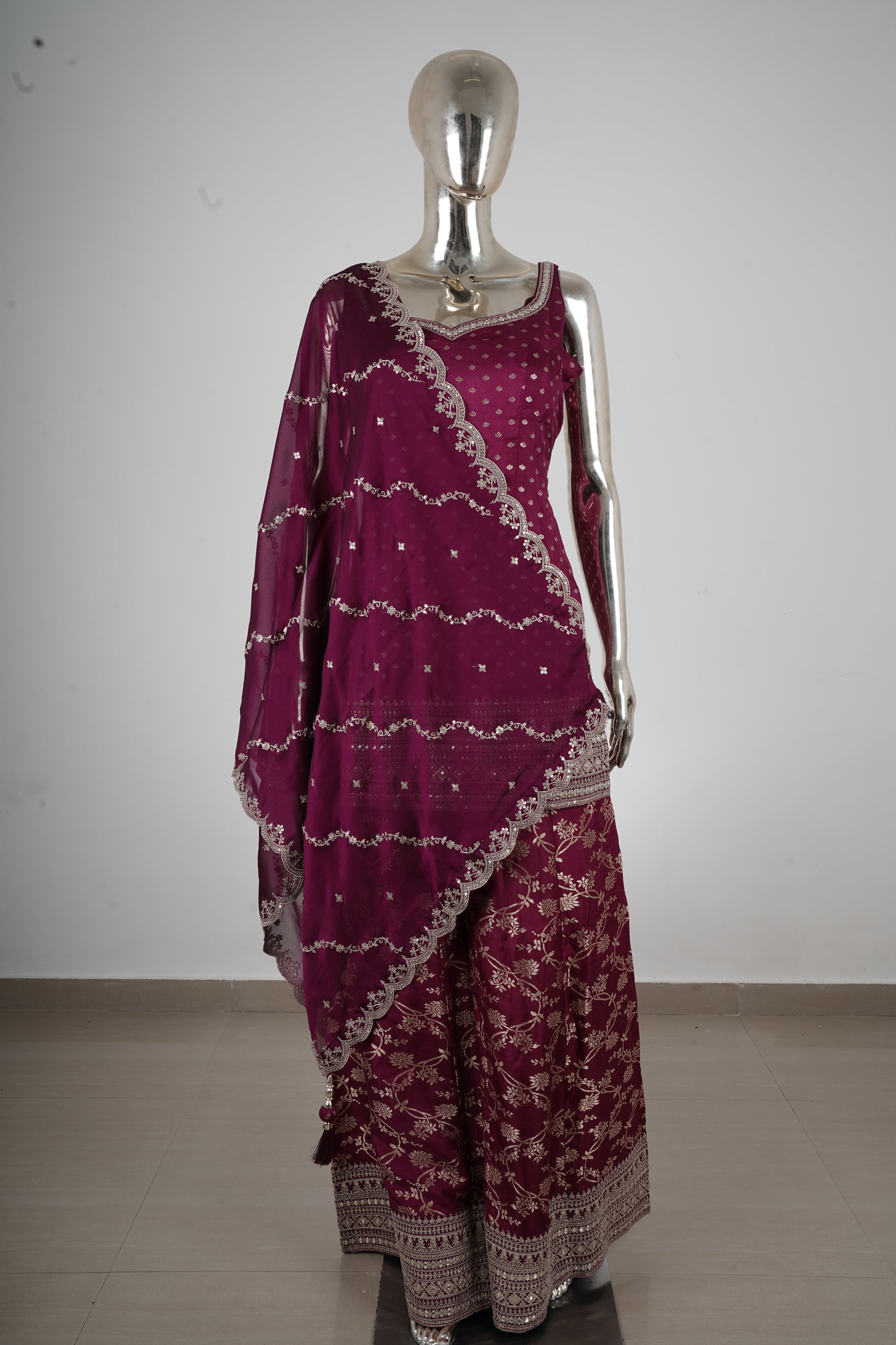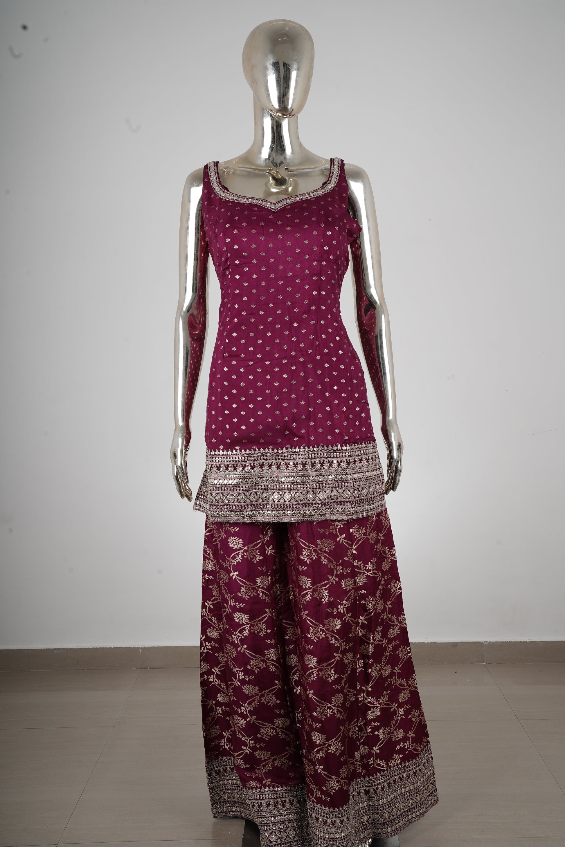 Make a striking statement with this wine maroon kurta sharara set, crafted to exude richness and festive elegance. The deep, luxurious hue paired with intricate zari embroidery makes this ensemble perfect for grand celebrations.