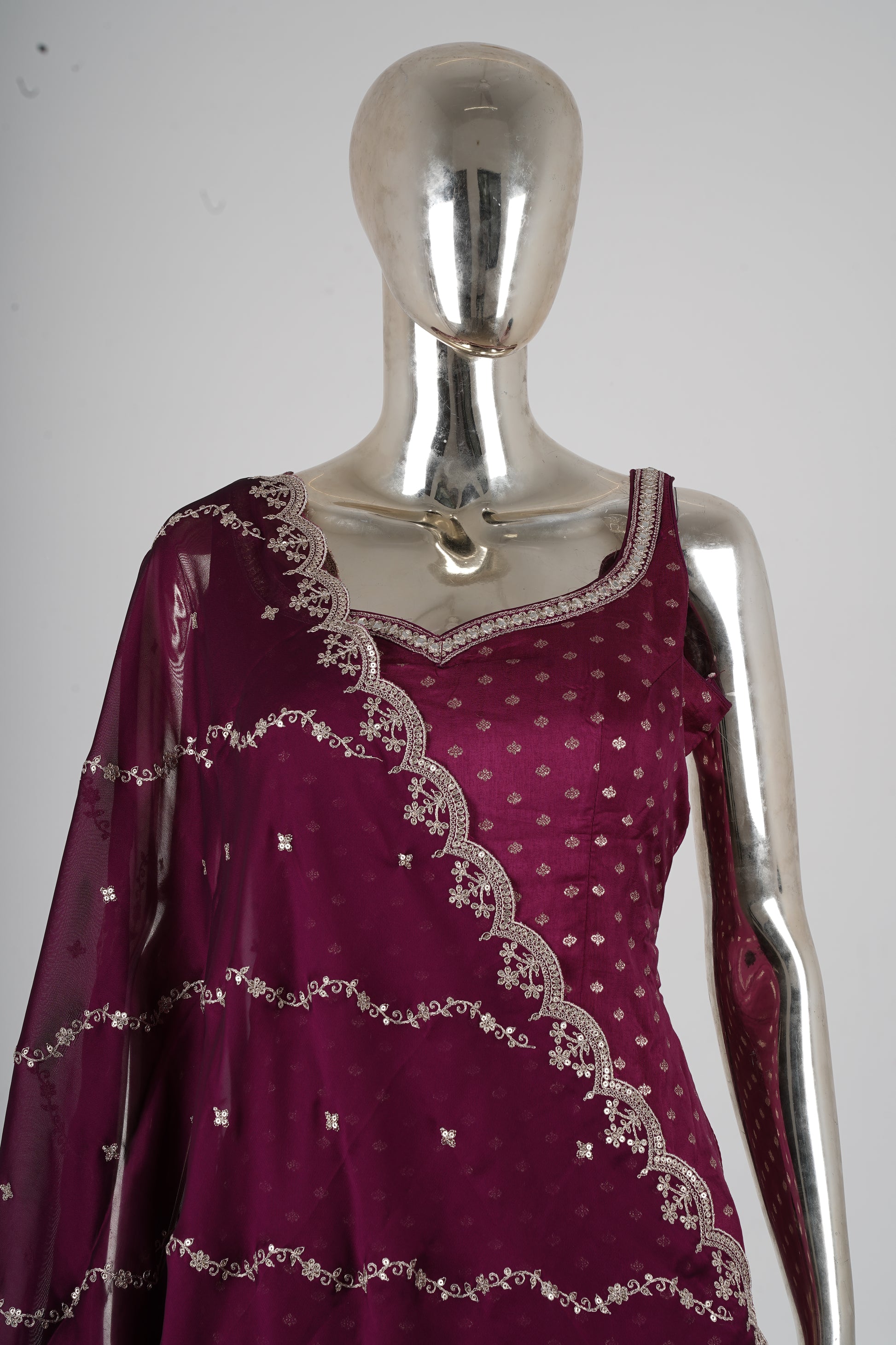 Dupatta finished with scalloped edges and fine embroidery.