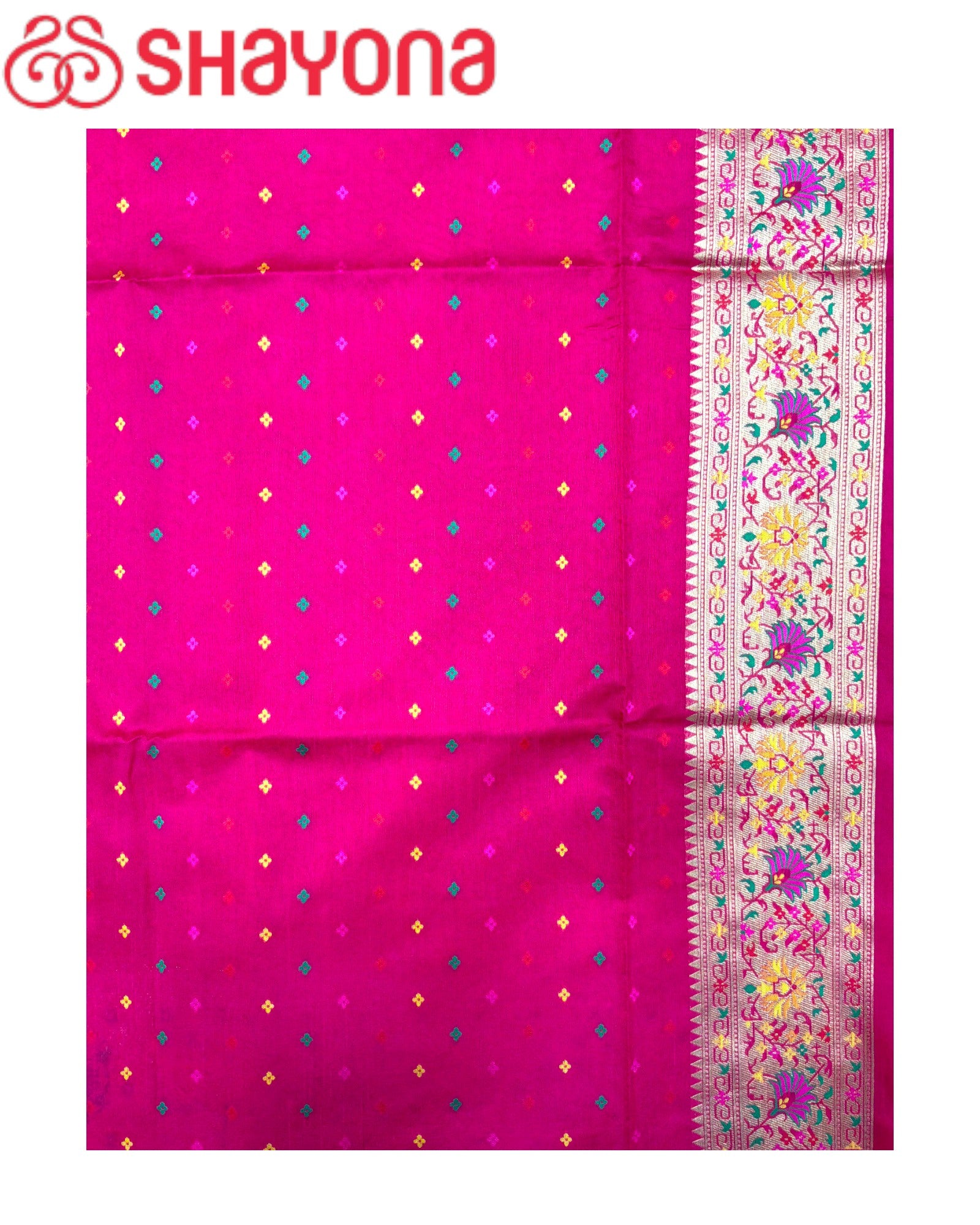 This Tissue Ghicha Silk Saree is handcrafted using a traditional weaving technique where Ghicha silk yarn, known for its natural texture and strength, is blended with tissue silk to create a subtle shimmer.