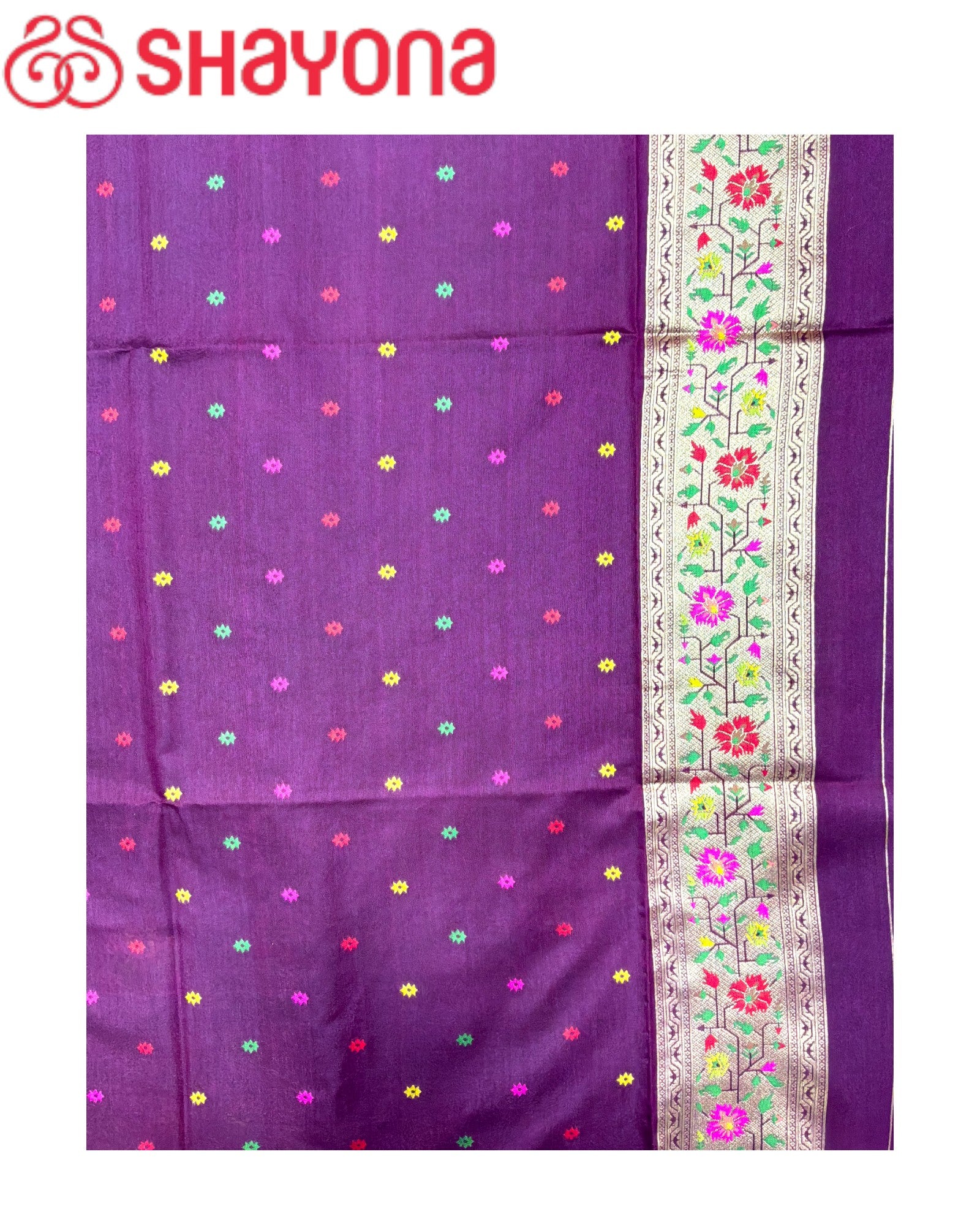 This Tissue Ghicha Silk Saree is handcrafted using a traditional weaving technique where Ghicha silk yarn, known for its natural texture and strength, is blended with tissue silk to create a subtle shimmer.
