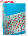 The saree features intricate woven floral motifs and borders, achieved through skilled handloom craftsmanship. Each piece reflects hours of artisan effort, making every saree unique with slight variations that enhance its authenticity and charm.