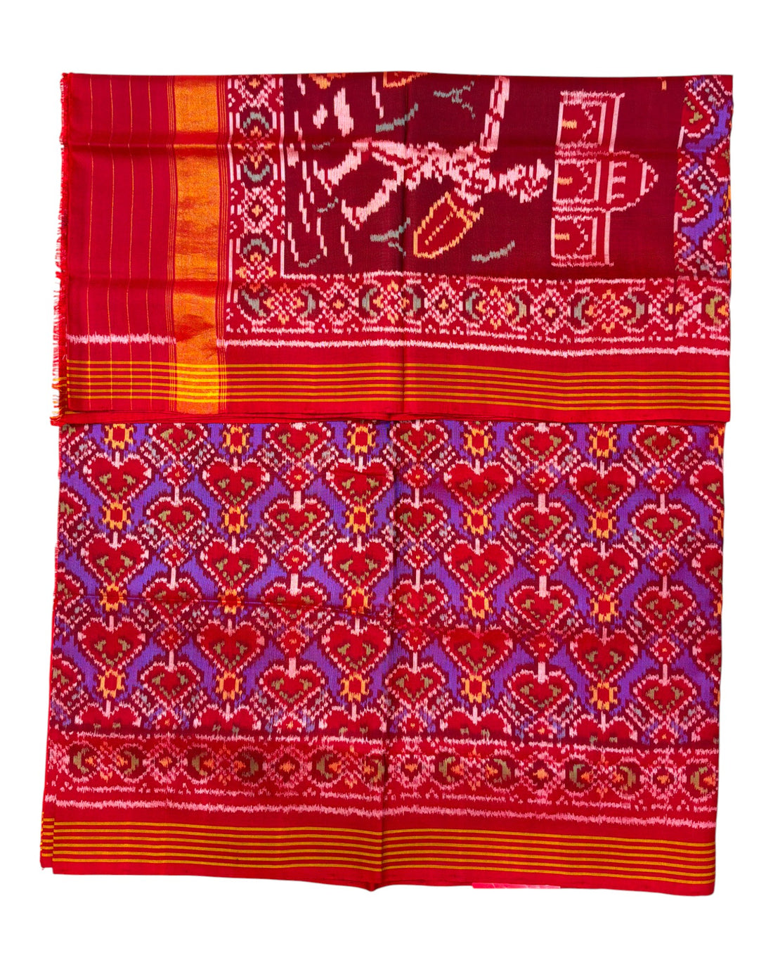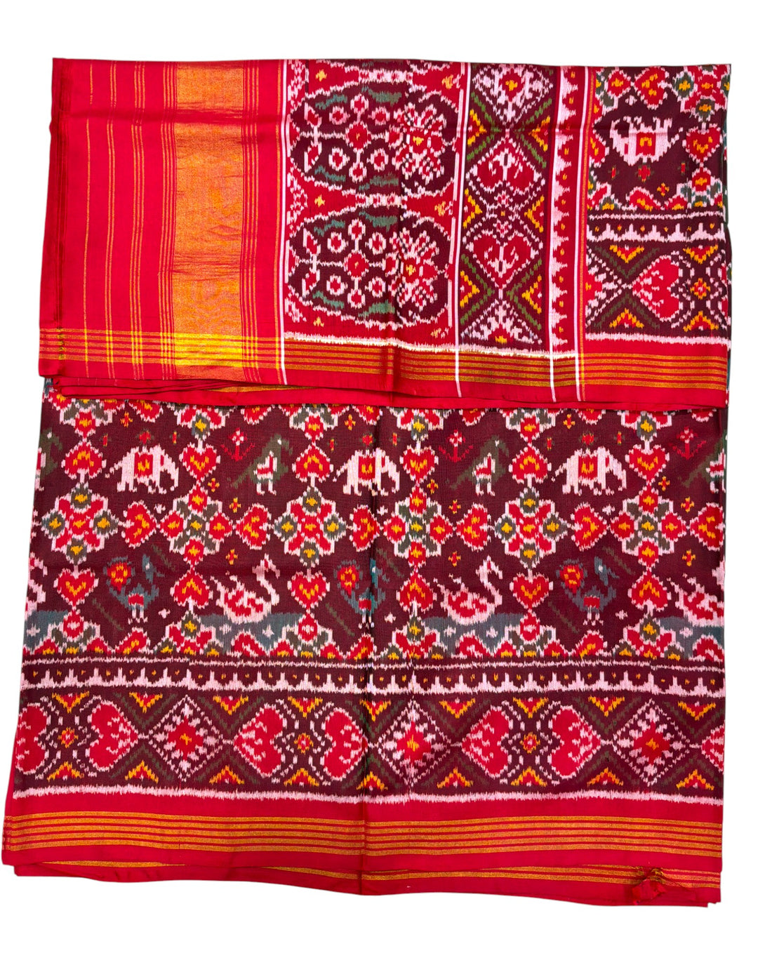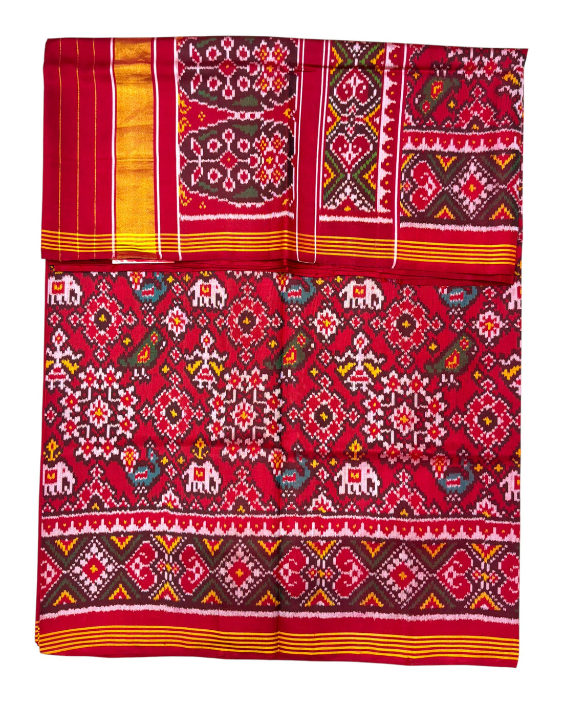 Patola is a traditional, intricate, and exquisite saree originating from Patan, Gujarat, India. It's renowned for its vibrant colors, unique patterns, and labor-intensive manufacturing process.It is woven using a double ikat method, where both the warp and weft threads are tie-dyed before weaving. Traditional Patola sarees use natural dyes, such as vegetable and plant extracts.Patola sarees feature complex geometric patterns, floral motifs, and animal designs. This sarees are draped on occassion of Weddings, Festivals (e.g., Navratri, Diwali), Traditional events and Formal gatherings.